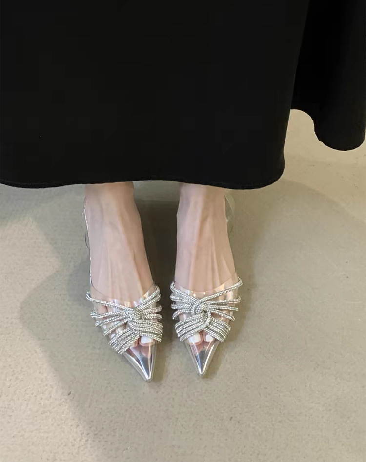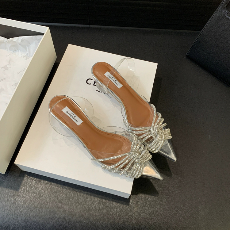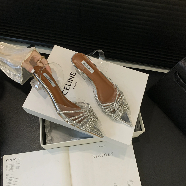 2025 년 여름 새로운 한국 스타일 라인스톤 크로스 크리스탈 신발 뾰족한 발가락 하이힐 샌들 43 야드 국경 간 얇은 굽 여성용 신발
