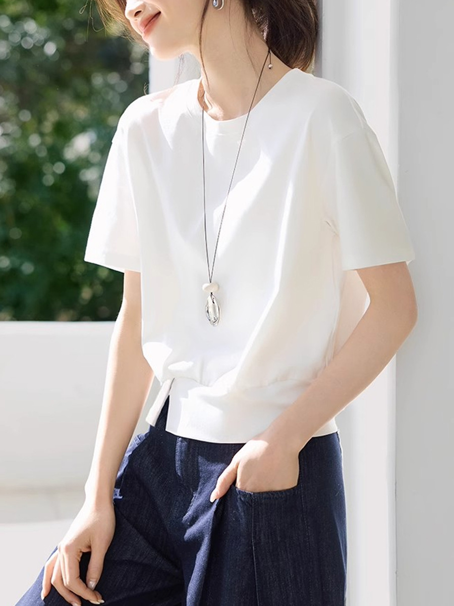 캐주얼 다목적 디자인 센스 헴스 스플릿 장식 버클 반팔 티셔츠 2025 여름 새 티셔츠 여성
