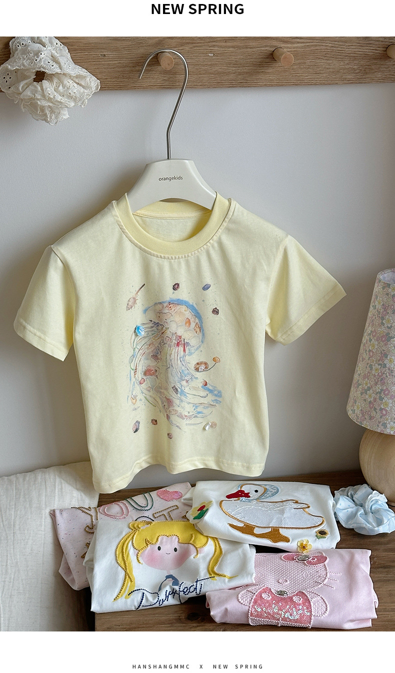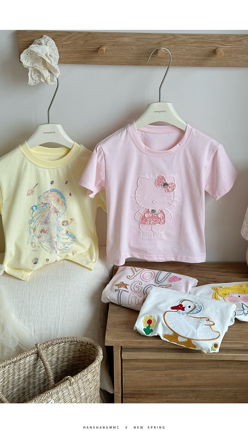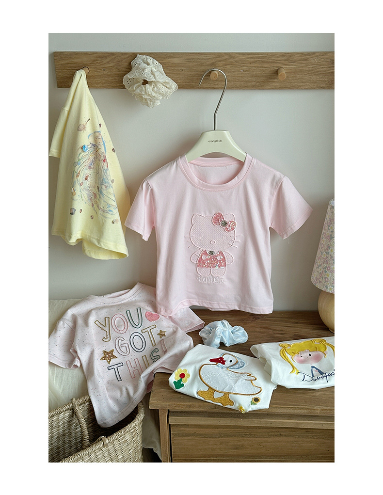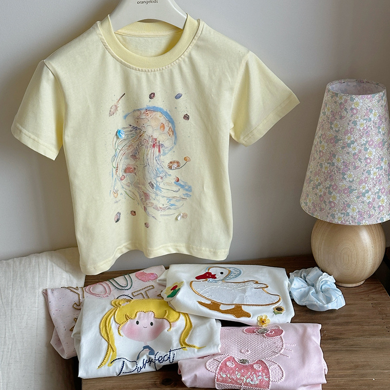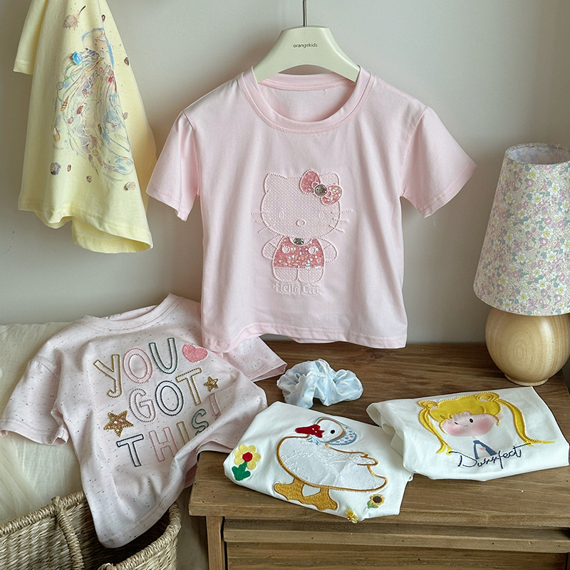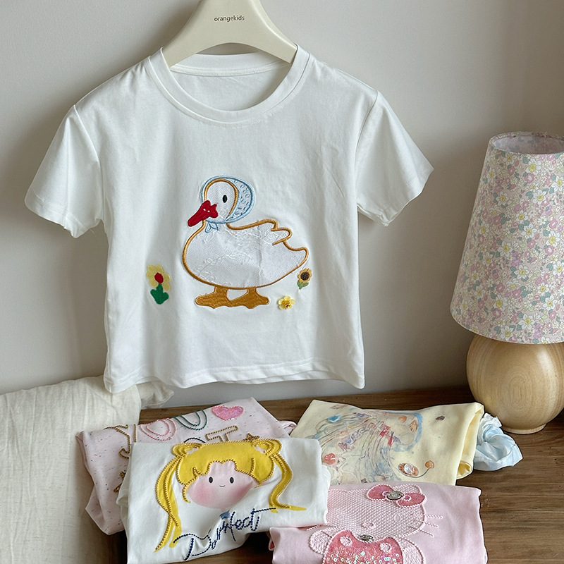 [스타 아이스 코튼 크래프트 스팽글 3 차원 아치 브리지 자수] 소녀 여름 새로운 귀여운 만화 반팔 어린이 티셔츠스토어 가기