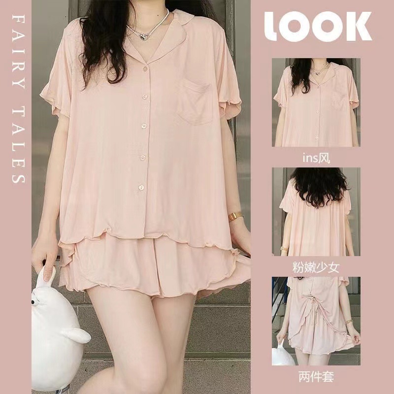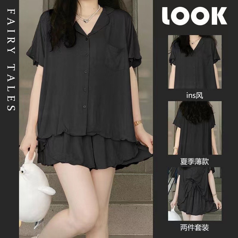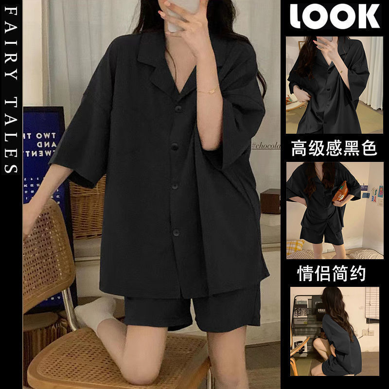 새로운 Ins 간단한 순수한 검은 잠옷 여성 여름 반팔 반바지 투피스 느슨한 게으른 스타일 홈 의류 세트