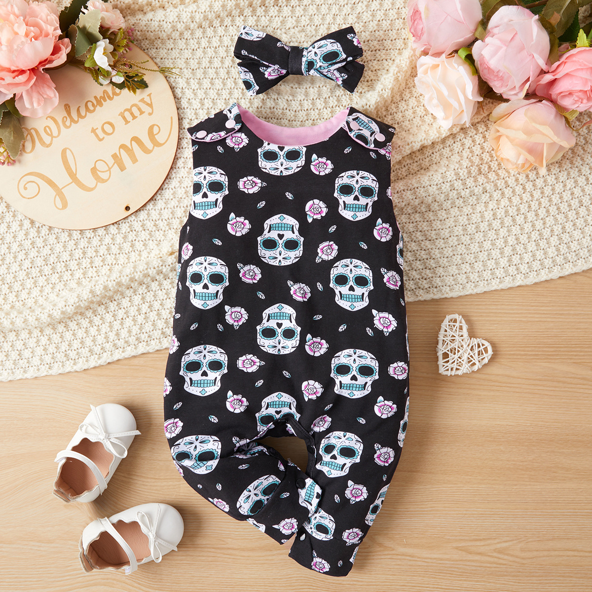 크로스보더 유아 봄, 여름, 가을 의류 전신 해골 프린트 점프수트 + 두건 투피스 공장 직접 판매스토어 가기