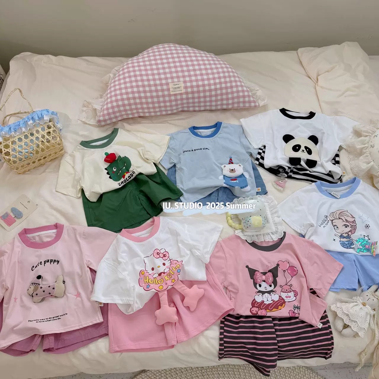 2025 여름 새로운 한국 아동복 소녀 반팔 티셔츠 반바지 세트 여성 아기 만화 탑 바지스토어 가기