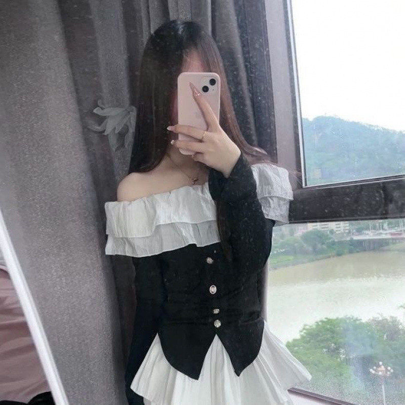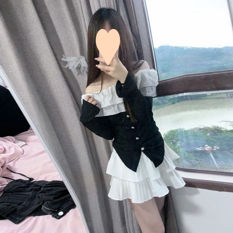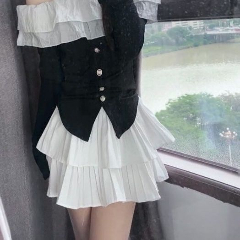우아한 한 단어 로터스 리프 프랑스 패션 올 매치 스위트 혼 탑 투피스 세트 푹신한 케이크 투피스 세트 여성스토어 가기