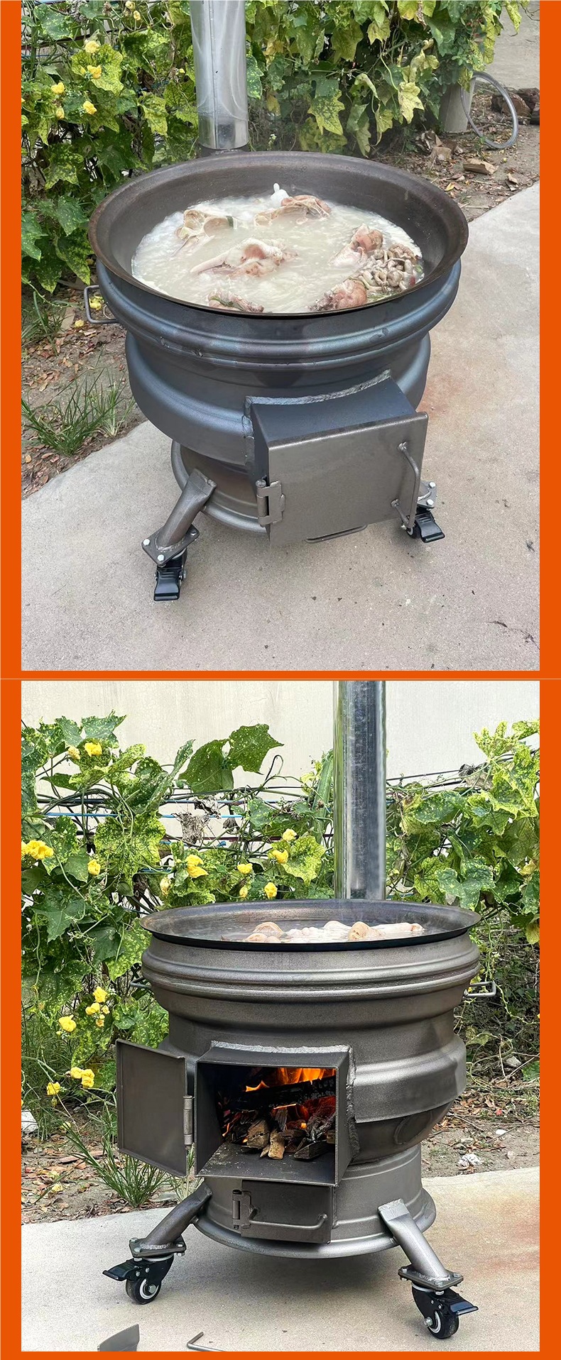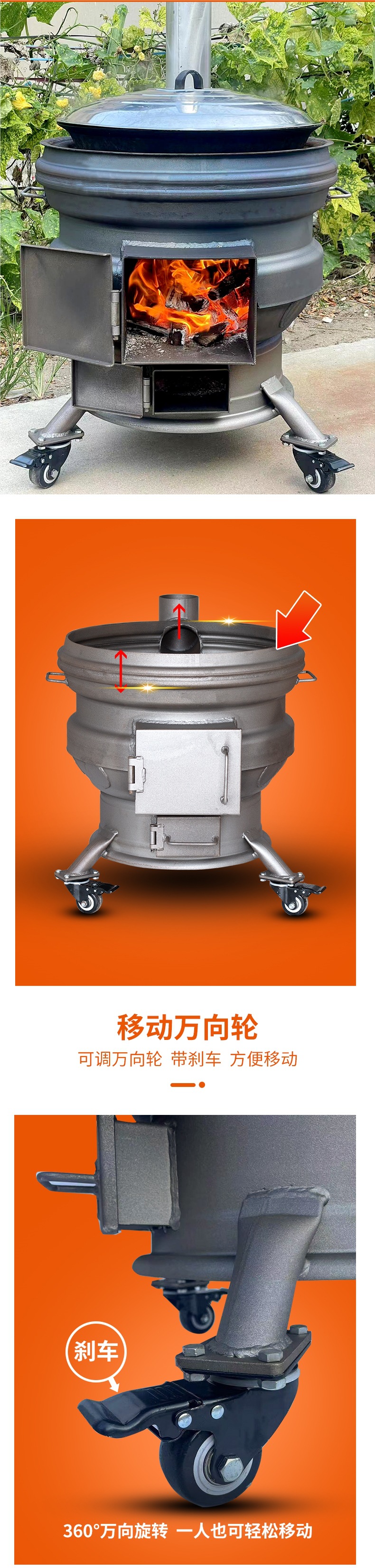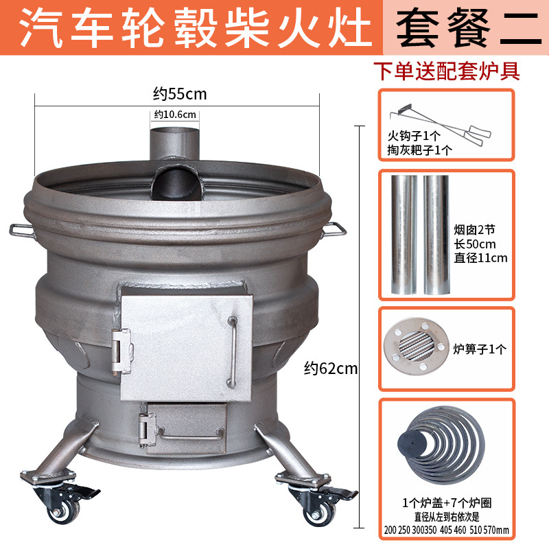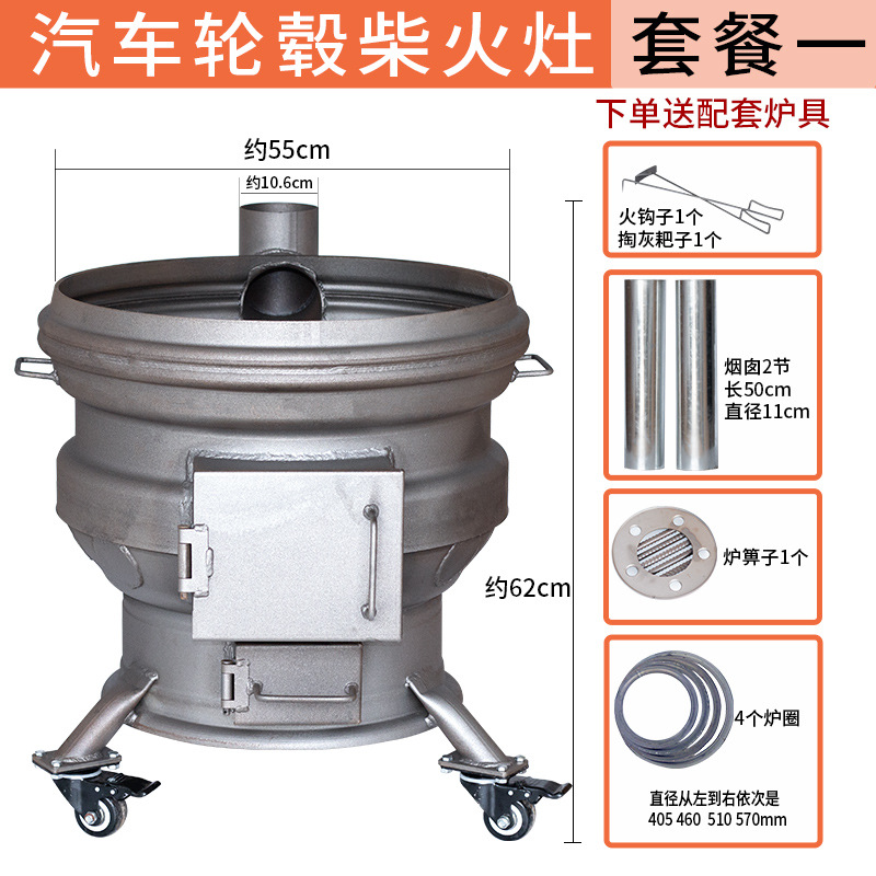 장작 난로, 가정용 신형 장작 난로, 이동식 휠 허브, 두꺼운 강철 링, 농촌 대형 철 냄비 스토브