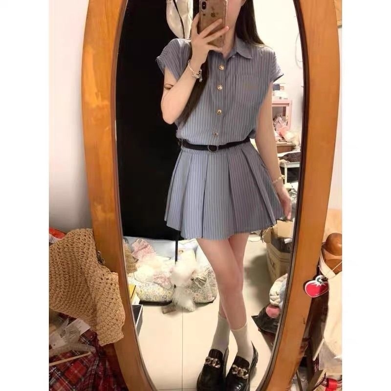 줄무늬 셔츠 원피스 치마 2024 여름 새로운 기질 허리 슬리밍 대학 주름 치마스토어 가기