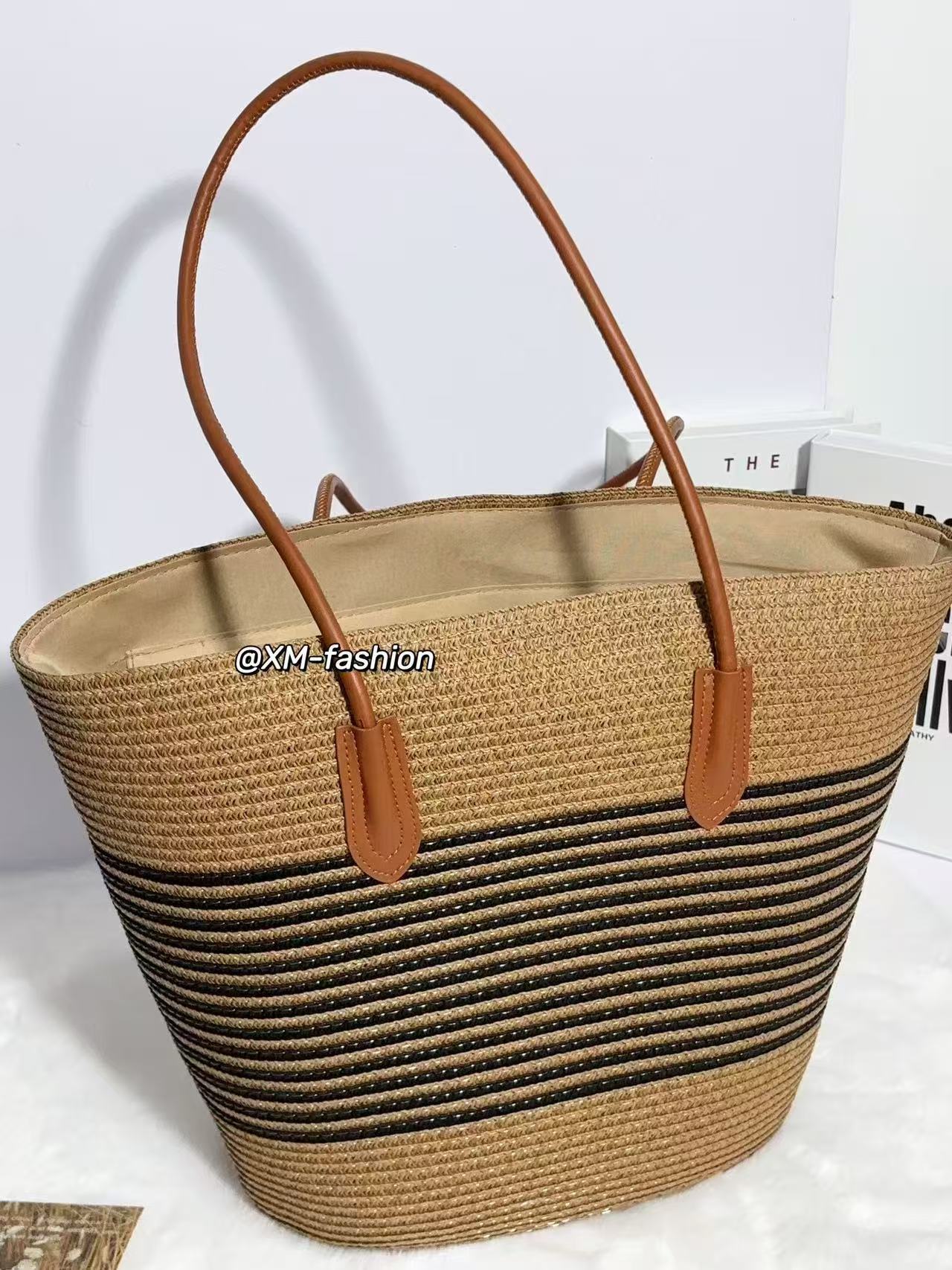 새로운 업그레이드 된 가죽 휴가 대용량 밀짚 짠 가방 세트 여름 줄무늬 유행 올 매치 통근 어깨 짠 가방스토어 가기