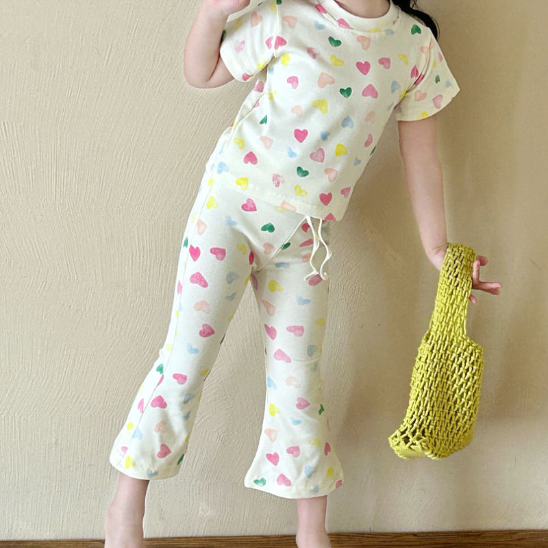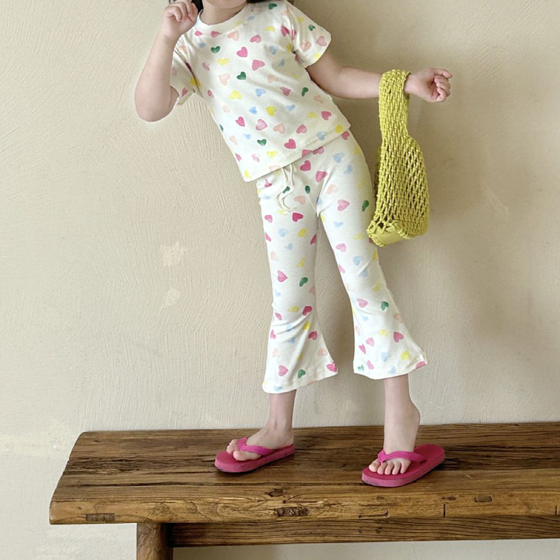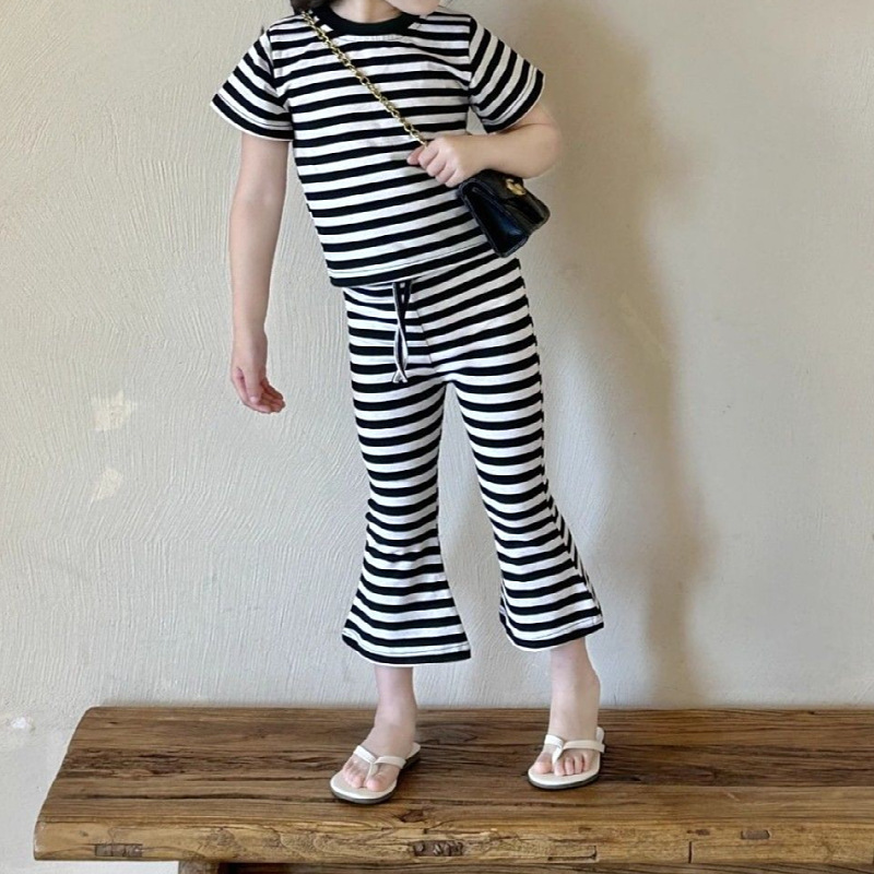 2025 년 여름 어린이 반팔 티셔츠 여자 스트라이프 아기 바닥 셔츠 플레어 팬츠 새로운 한국 투피스 패션