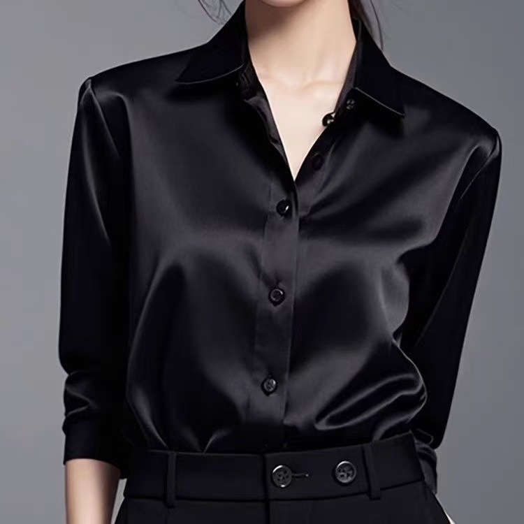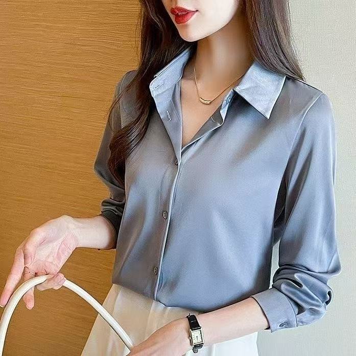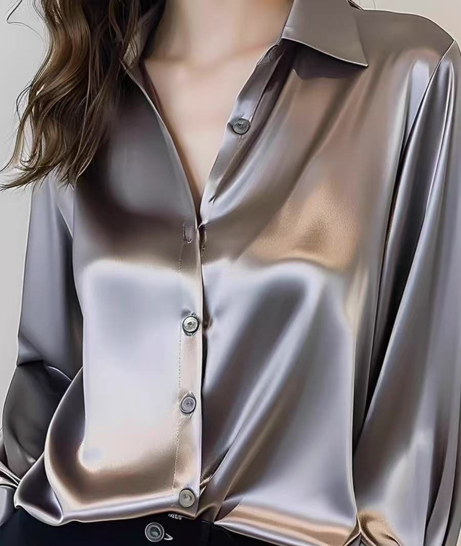 2025 봄과 가을 새로운 하이 엔드 센스 그레이 아세테이트 새틴 셔츠 여성용 긴팔 세련된 프랑스 실크 전문 셔츠스토어 가기