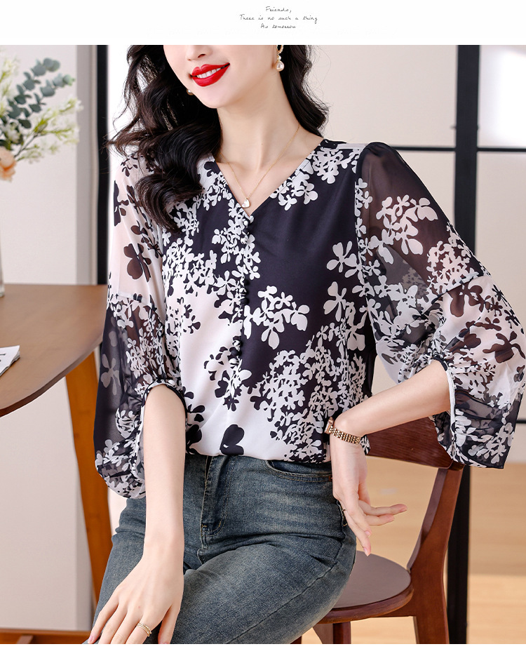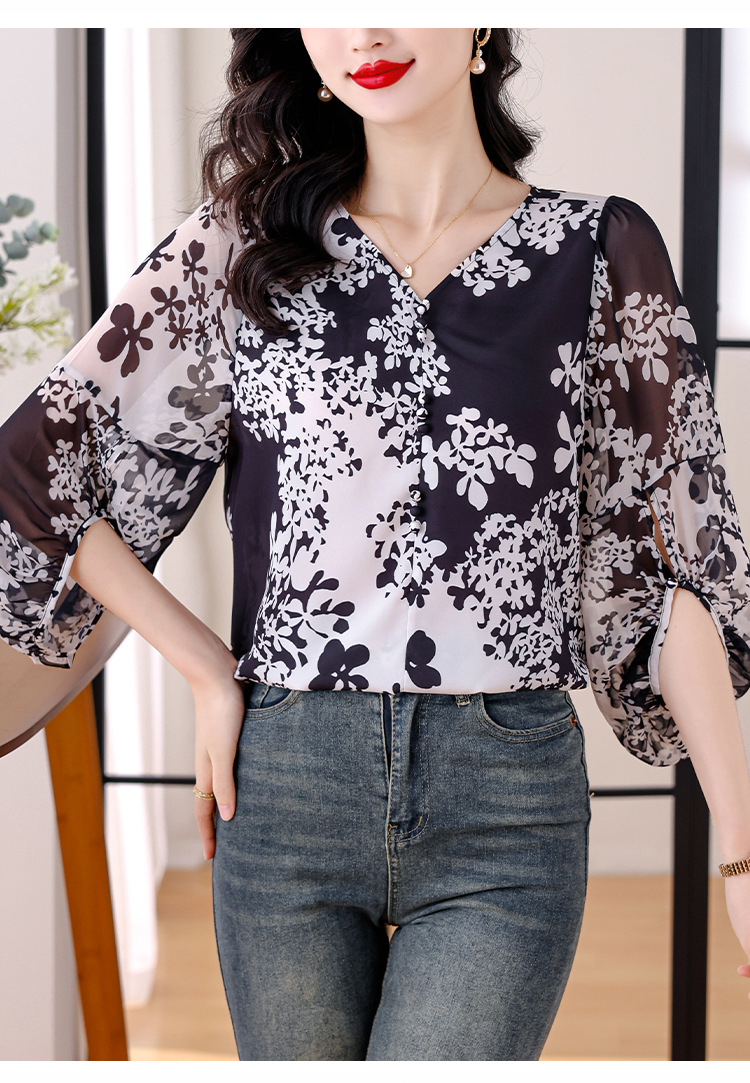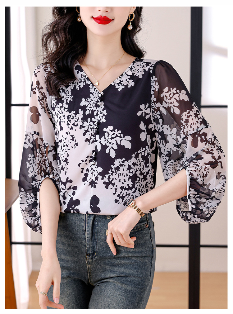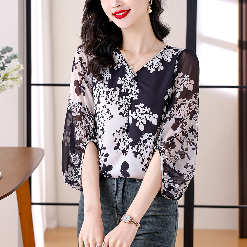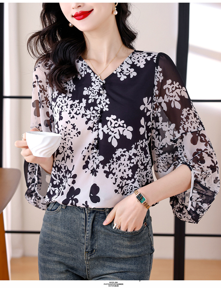검은 꽃 쉬폰 셔츠 여성 2025 년 여름 새로운 V 넥 풀오버 스타일라인 랜턴 슬리브 느슨한 플러스 사이즈 탑