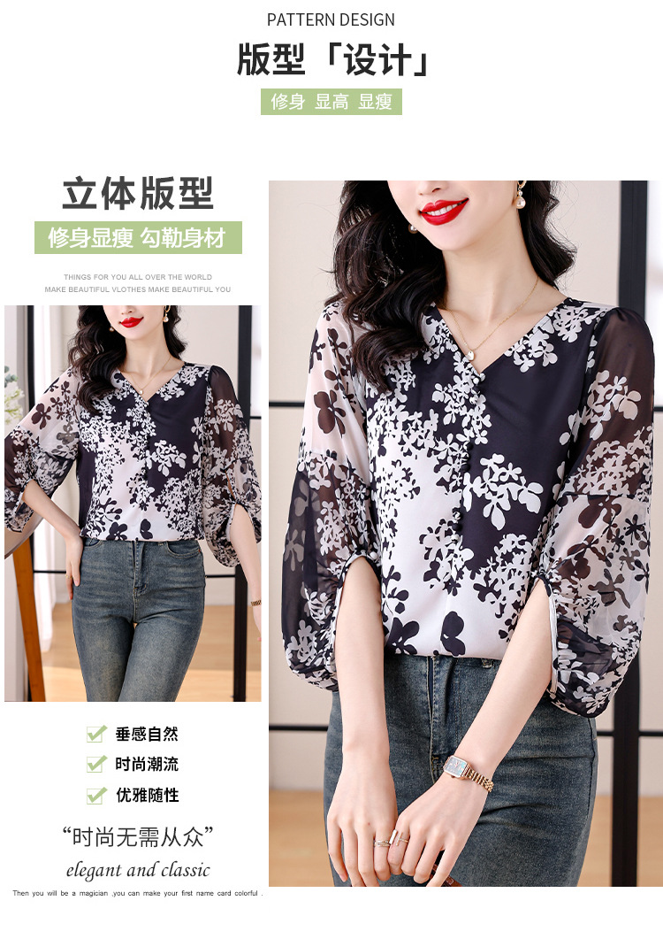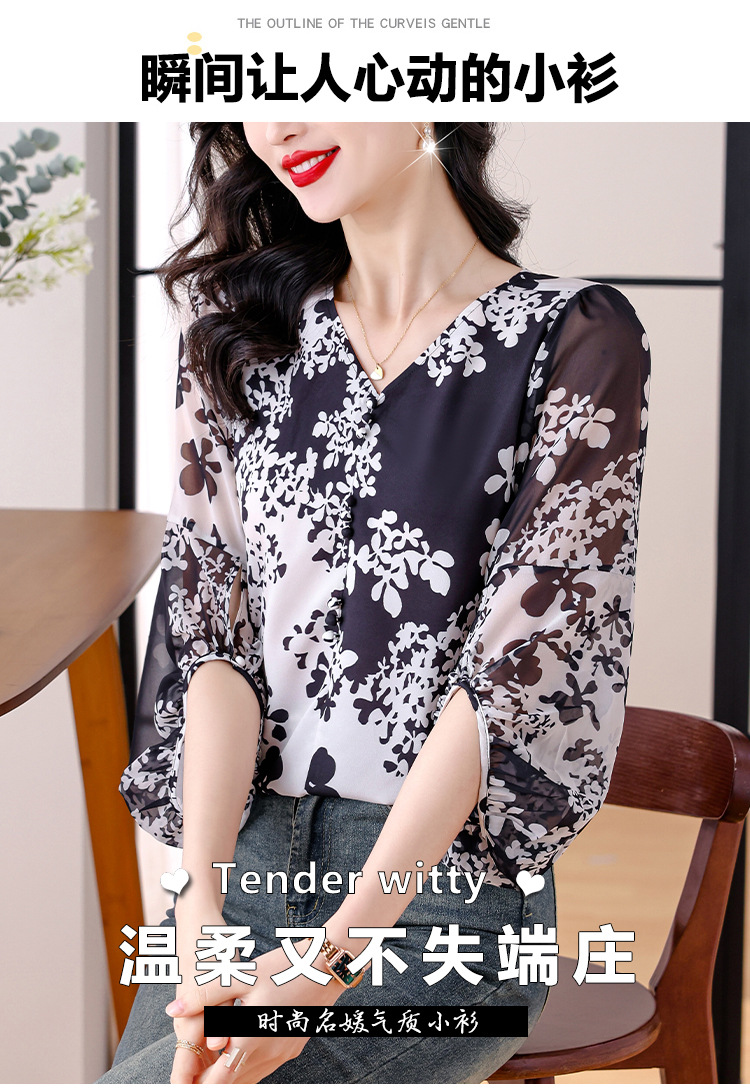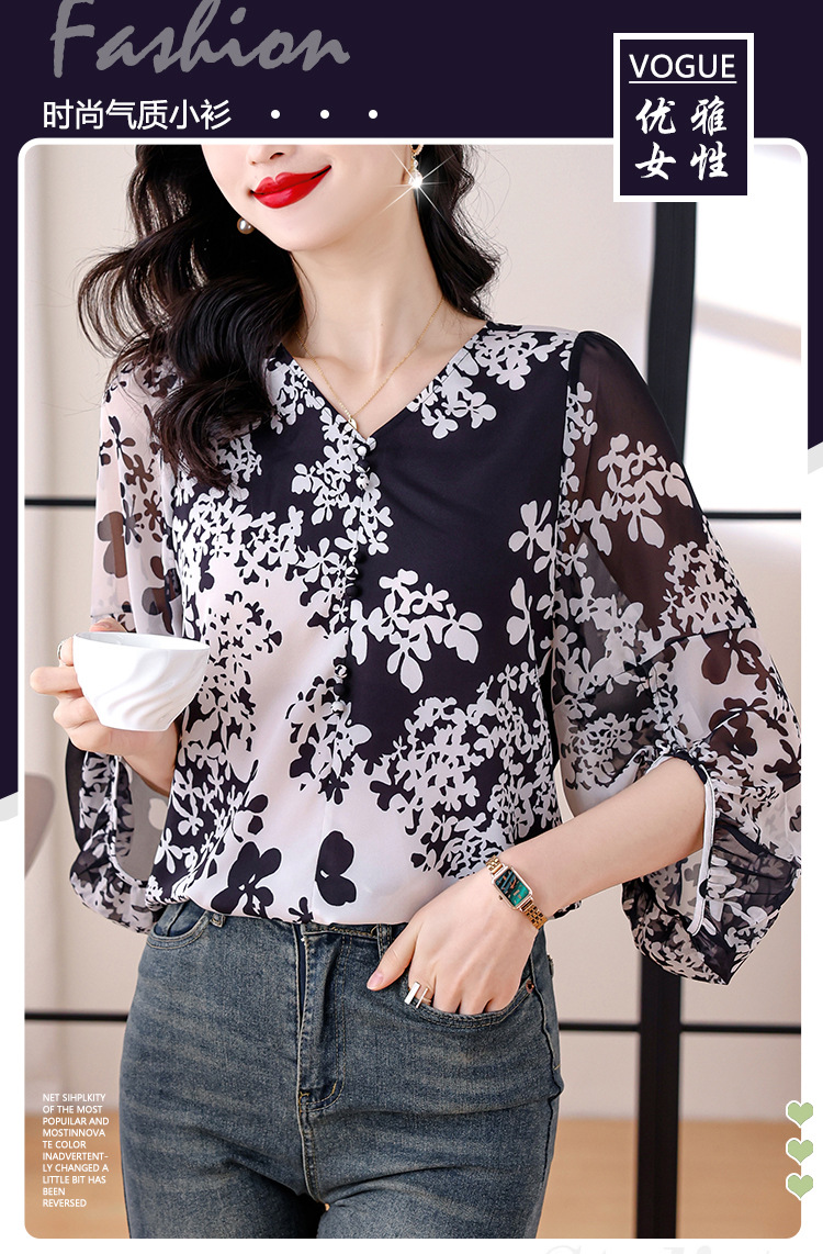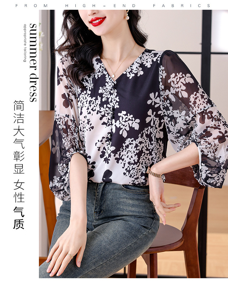 검은 꽃 쉬폰 셔츠 여성 2025 년 여름 새로운 V 넥 풀오버 스타일라인 랜턴 슬리브 느슨한 플러스 사이즈 탑