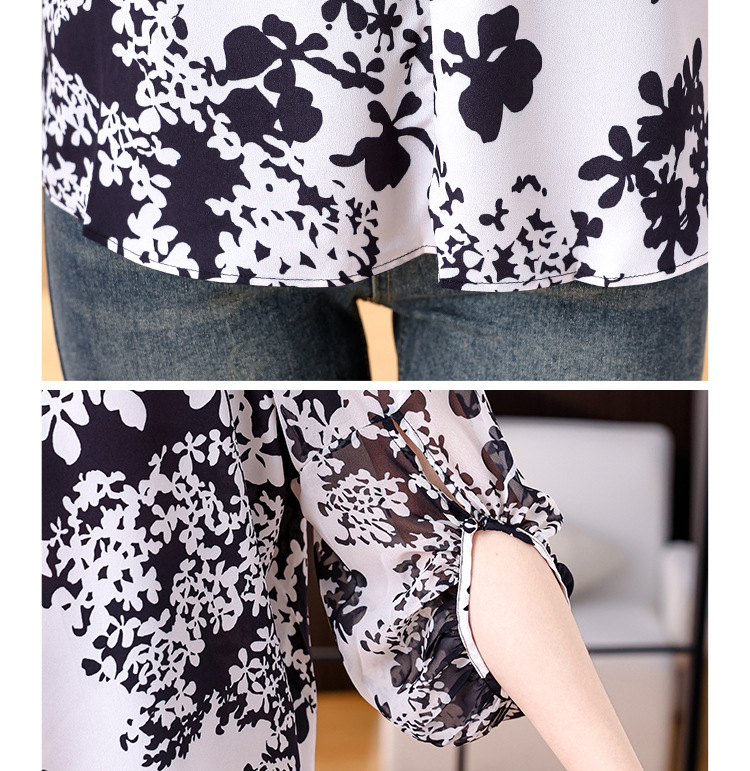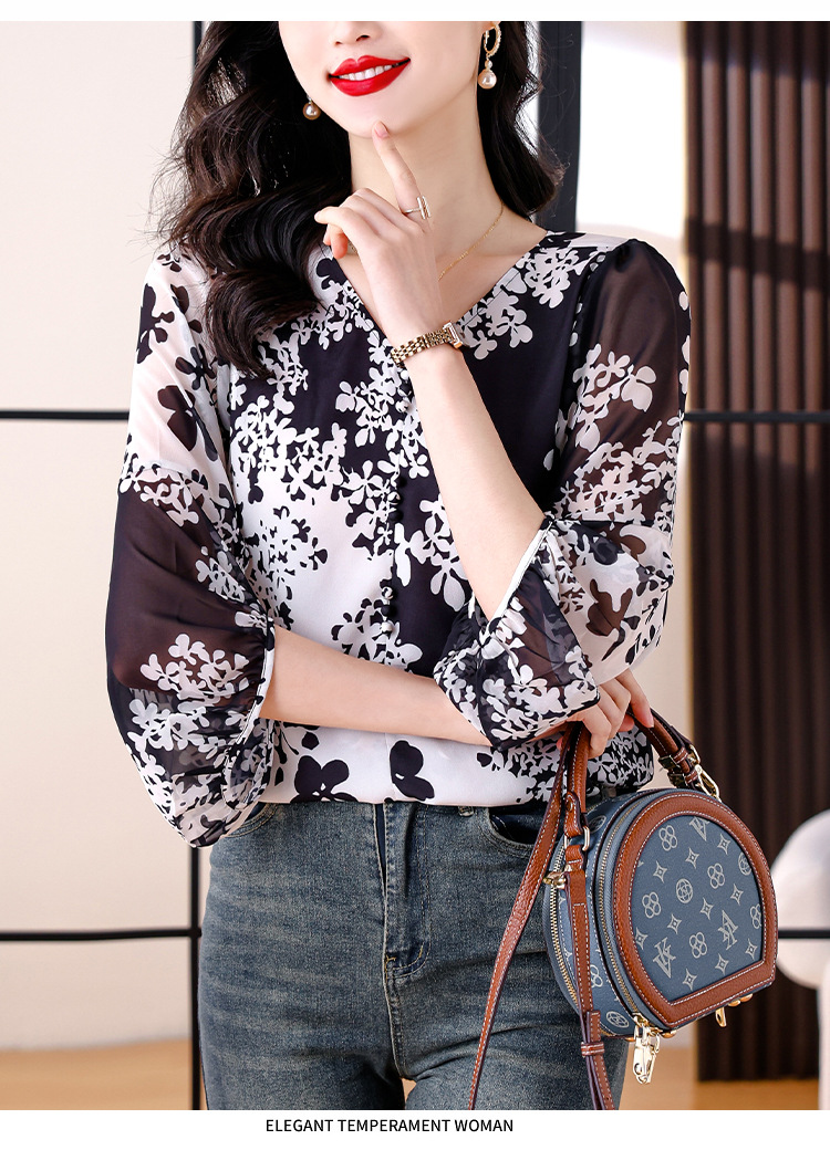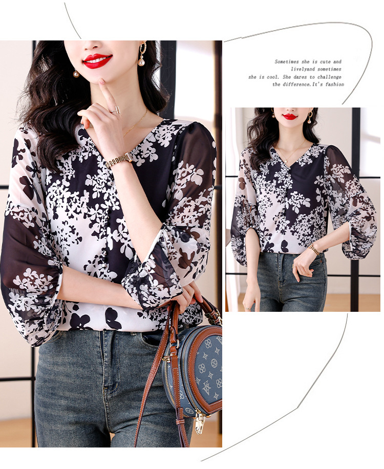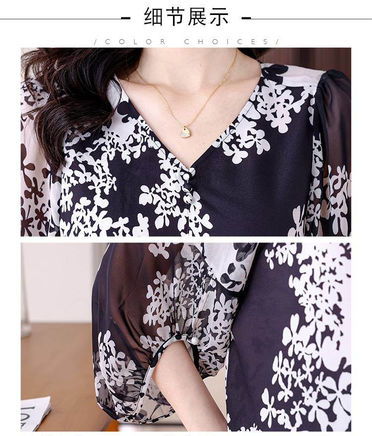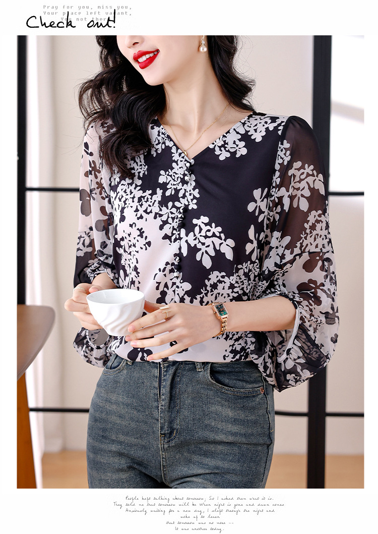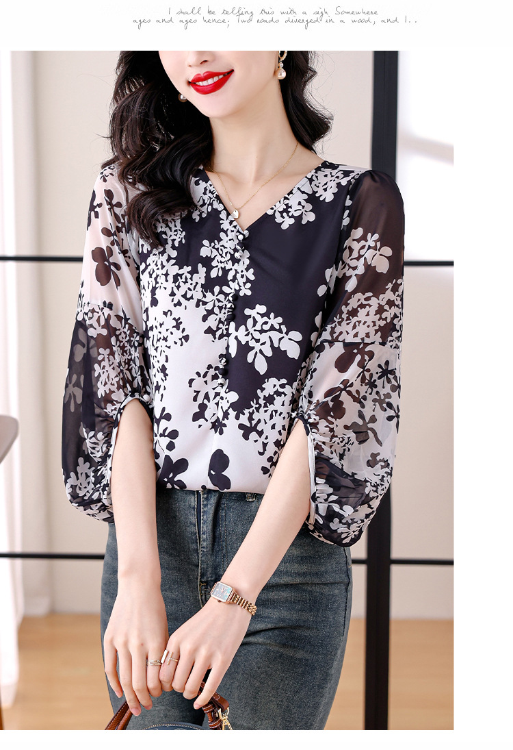 검은 꽃 쉬폰 셔츠 여성 2025 년 여름 새로운 V 넥 풀오버 스타일라인 랜턴 슬리브 느슨한 플러스 사이즈 탑스토어 가기
