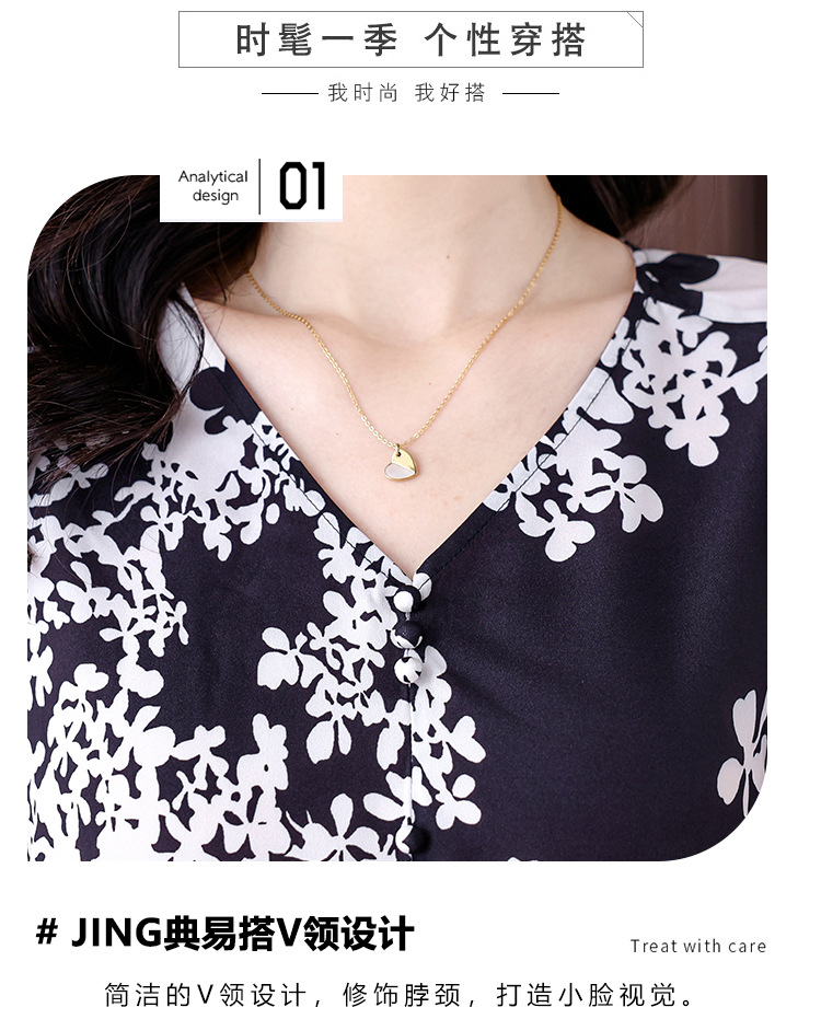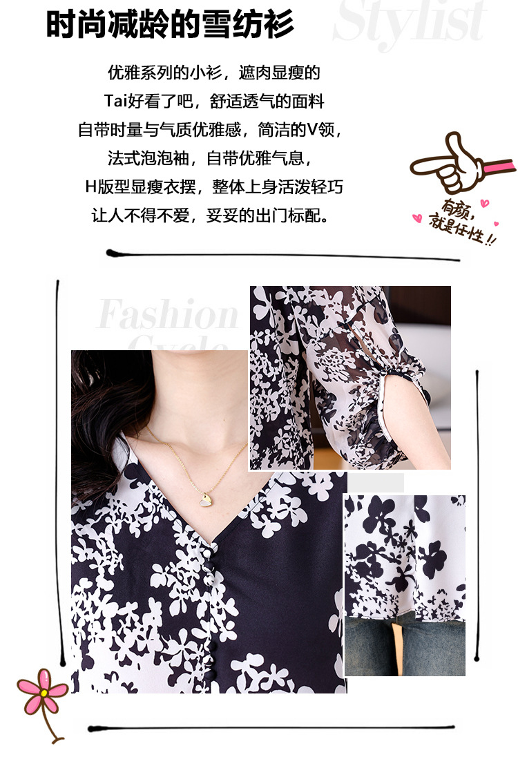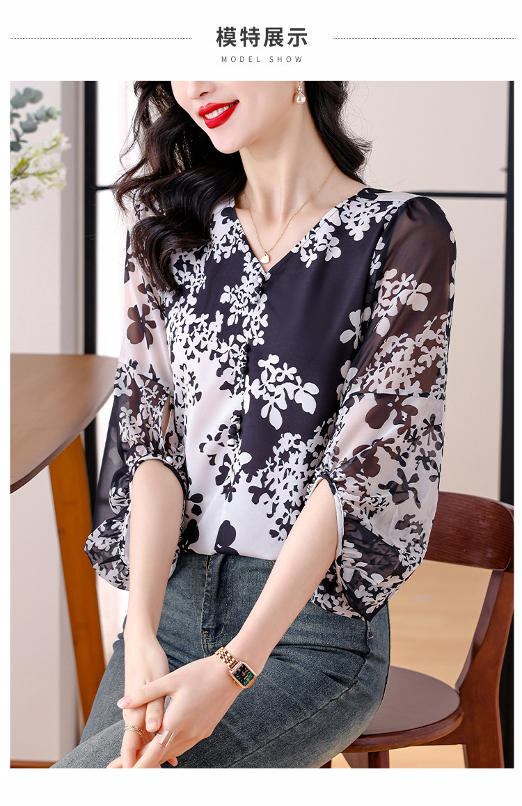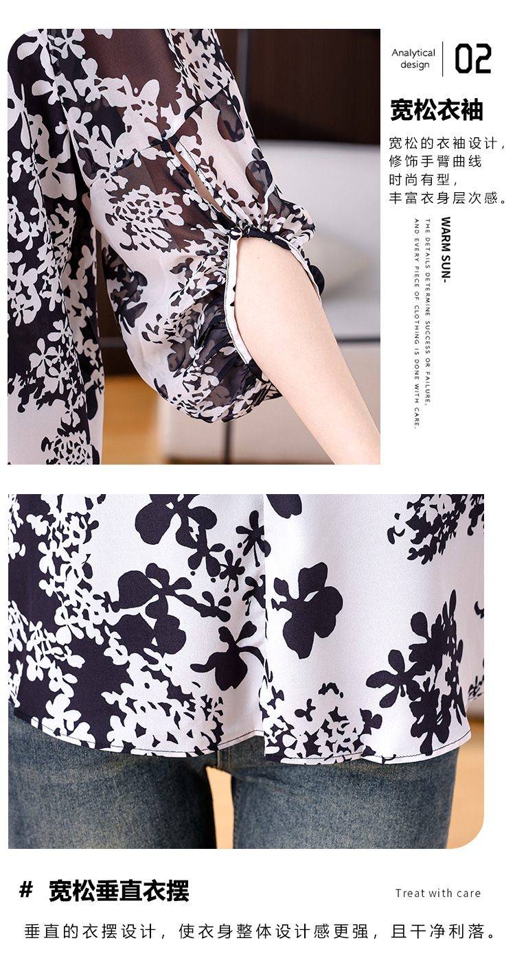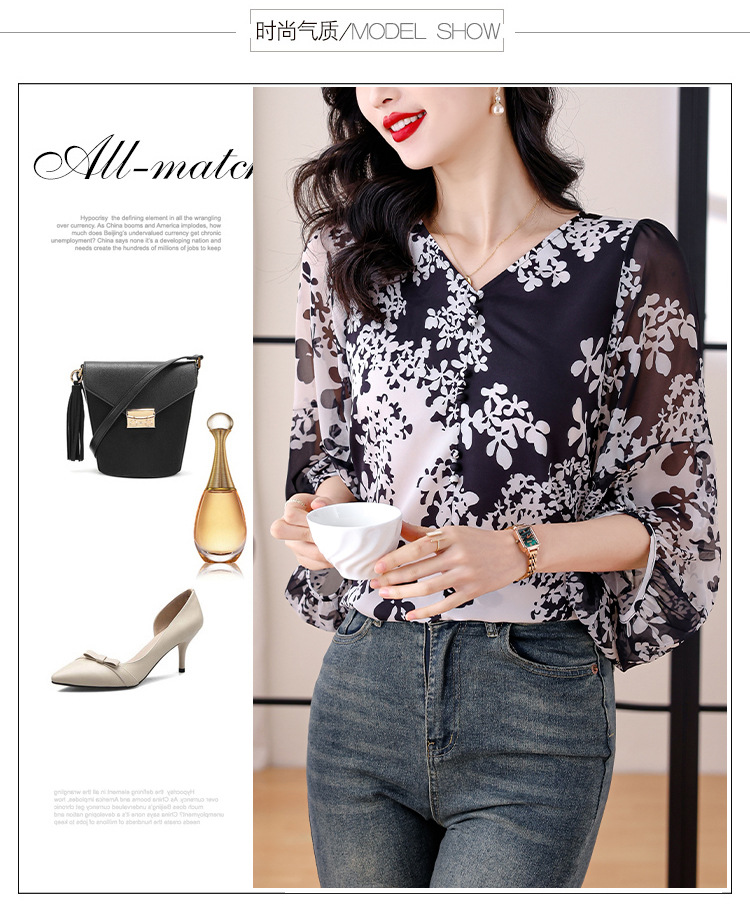 검은 꽃 쉬폰 셔츠 여성 2025 년 여름 새로운 V 넥 풀오버 스타일라인 랜턴 슬리브 느슨한 플러스 사이즈 탑스토어 가기