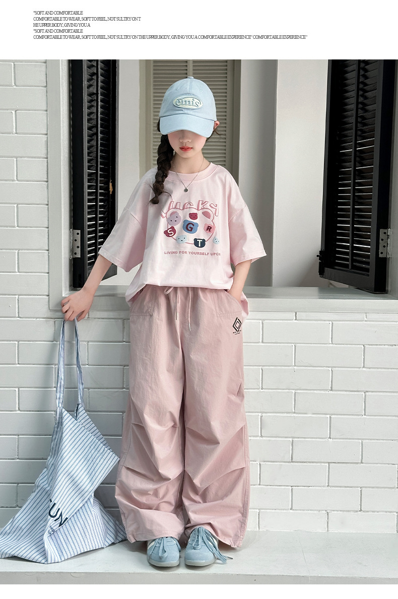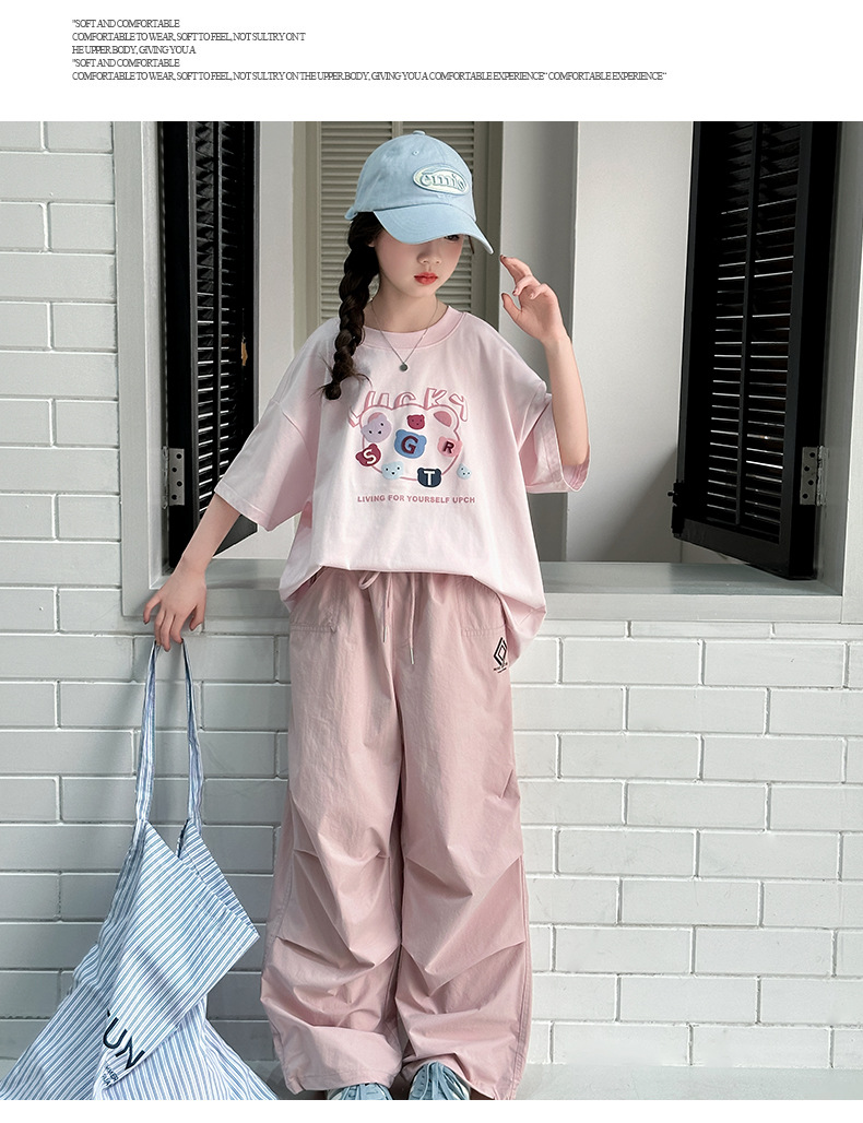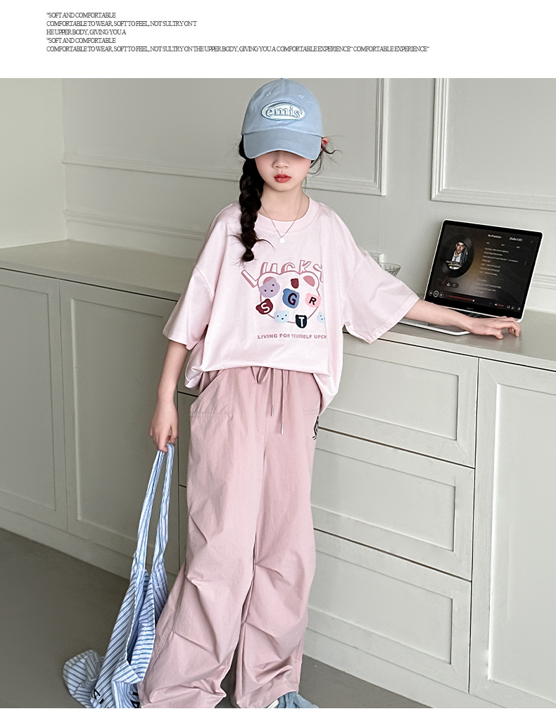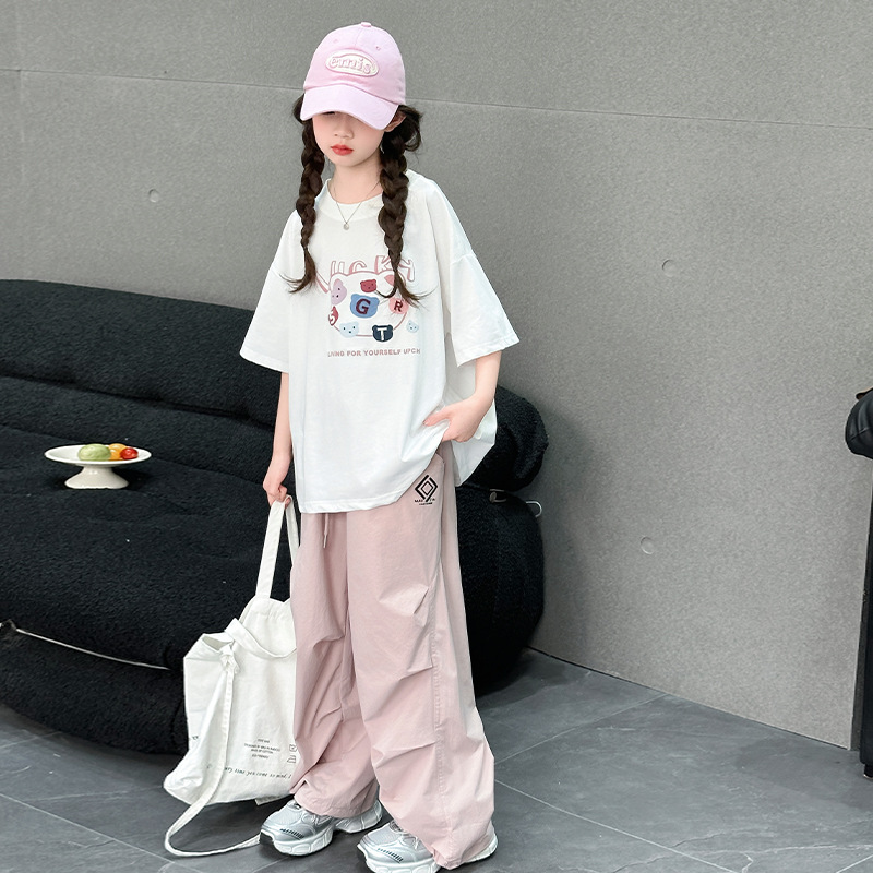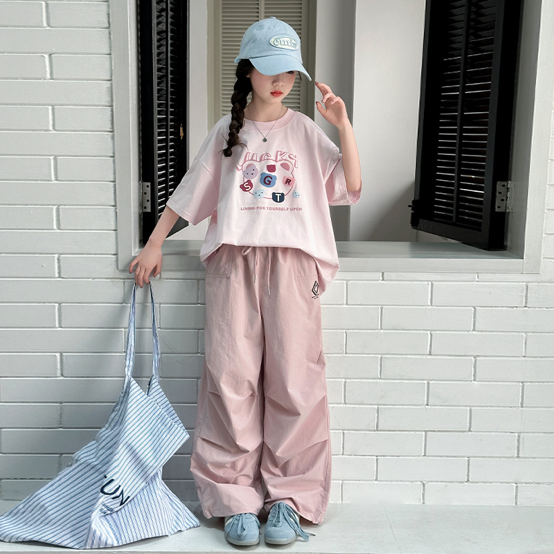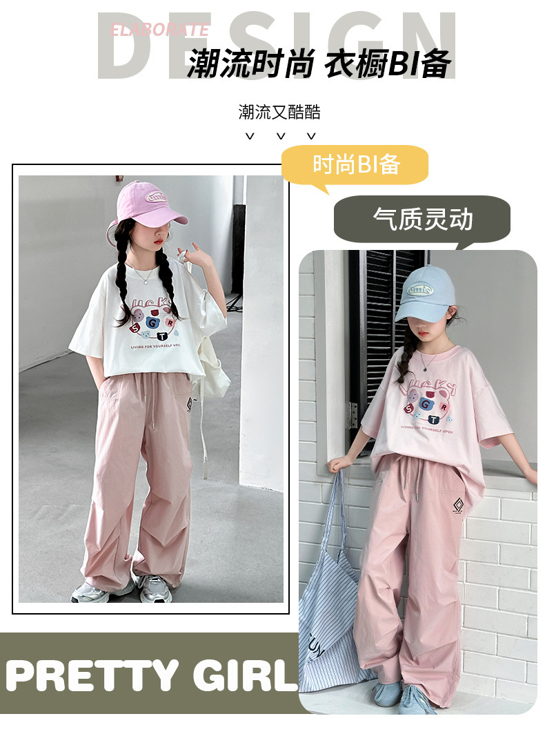 소녀의 봄과 여름 작업복 세트 어린이 패션 느슨한 반팔 와이드 레그 바지 프라이드 스트리트 투피스 세트 얇은 여름 패션스토어 가기
