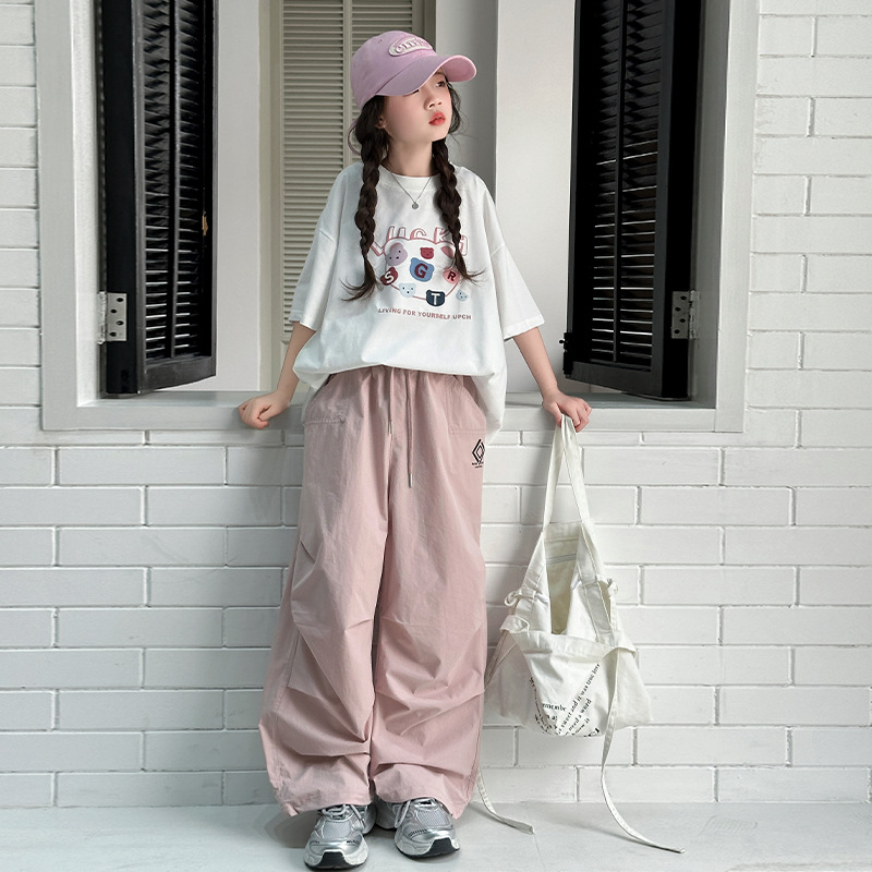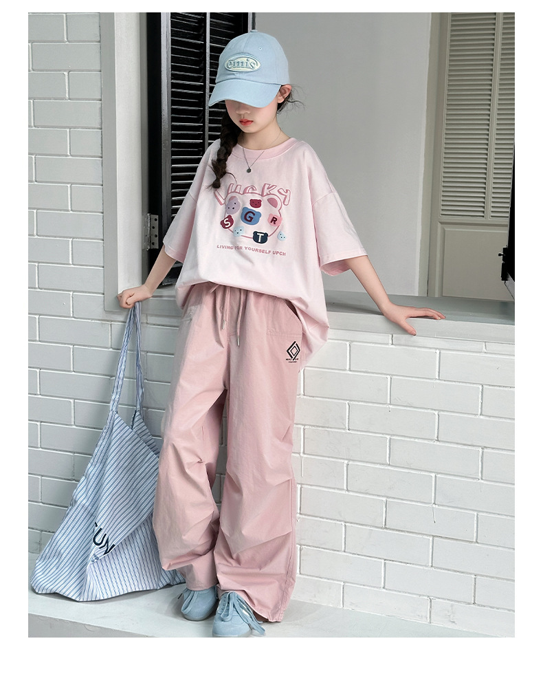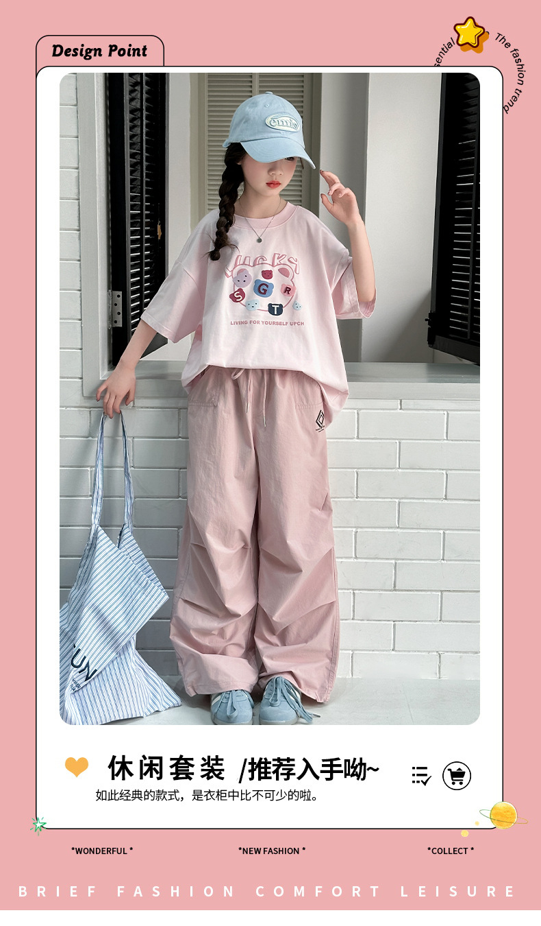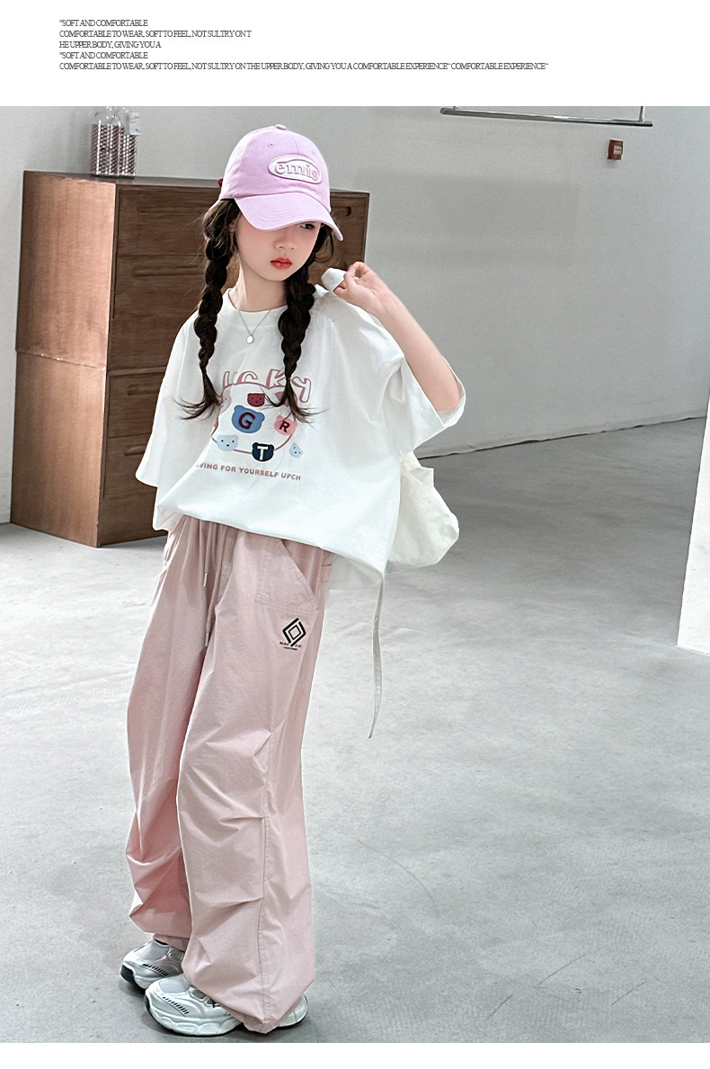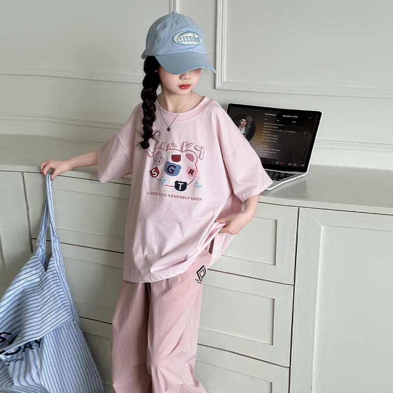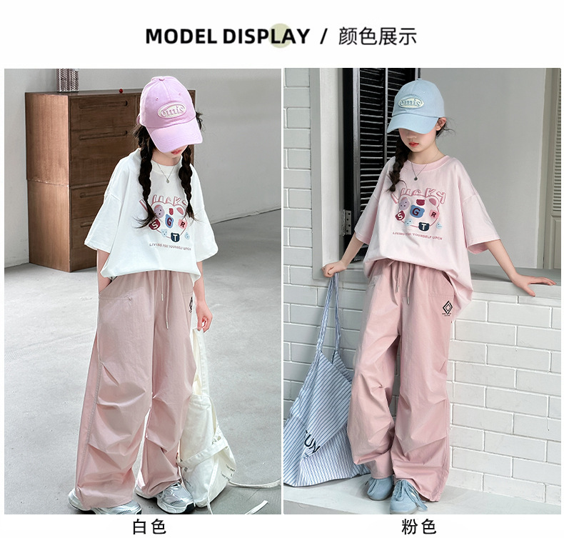 소녀의 봄과 여름 작업복 세트 어린이 패션 느슨한 반팔 와이드 레그 바지 프라이드 스트리트 투피스 세트 얇은 여름 패션스토어 가기