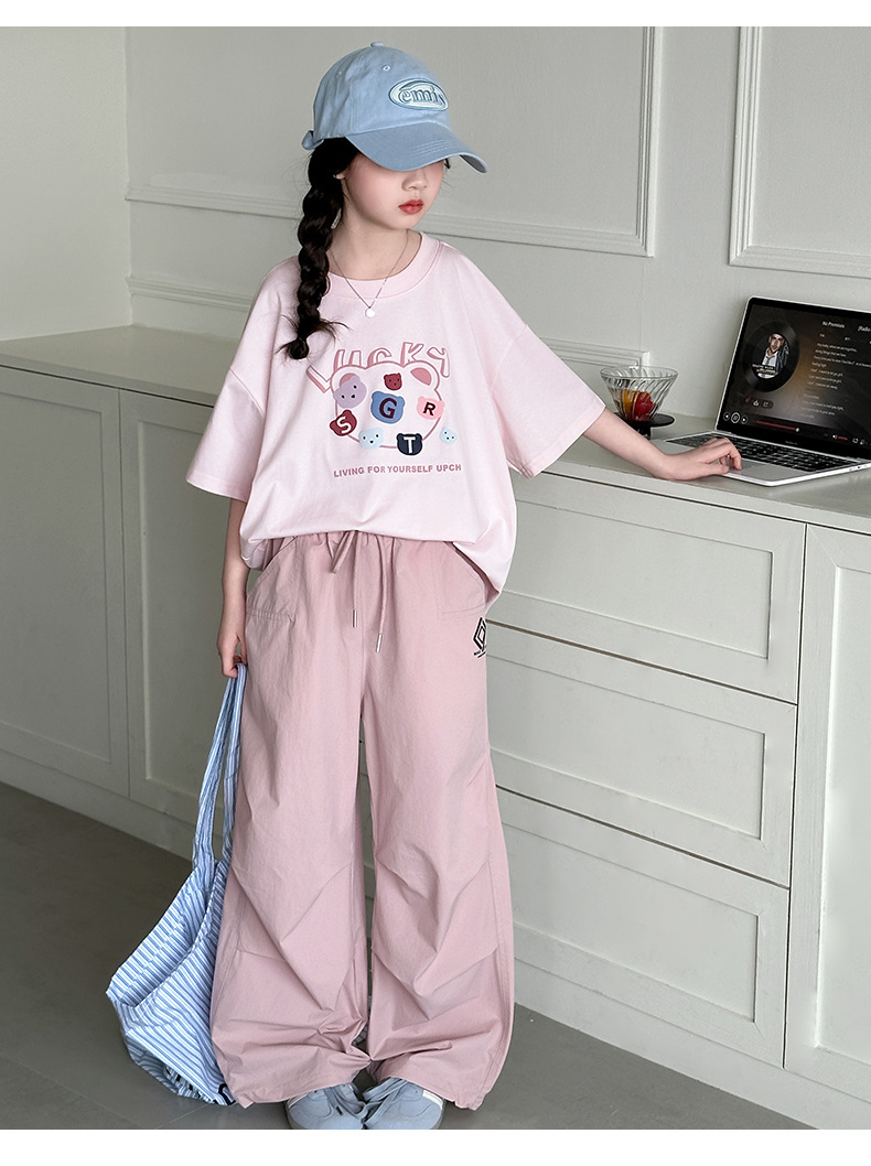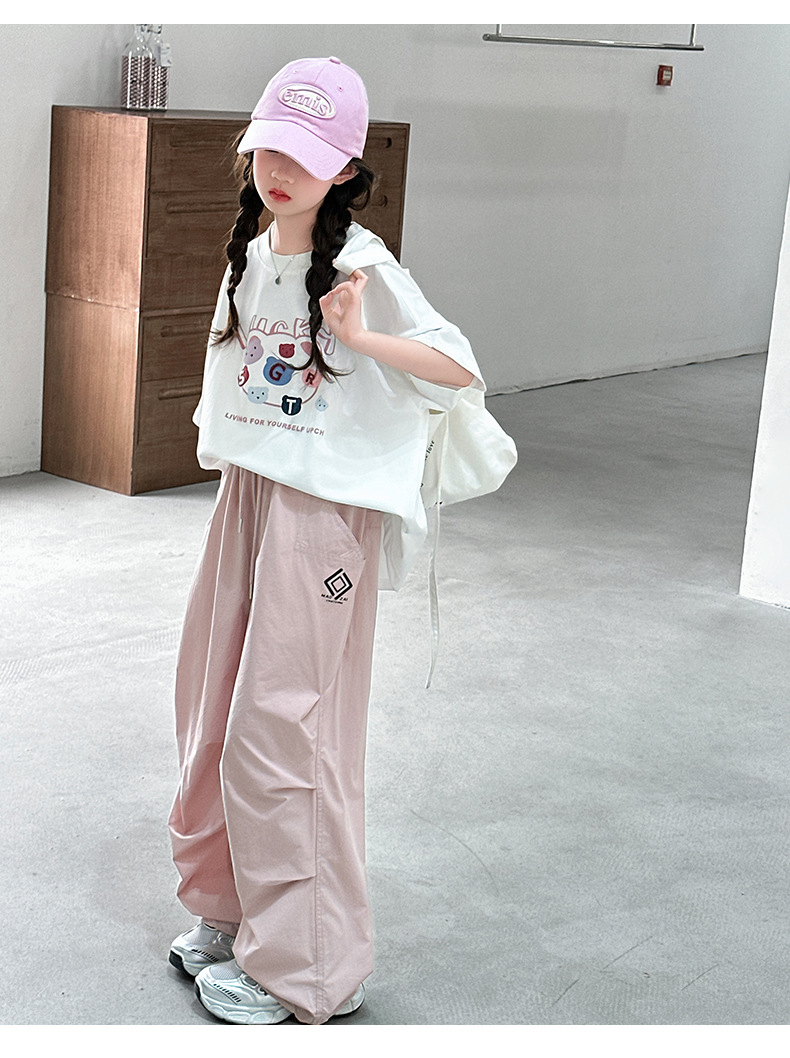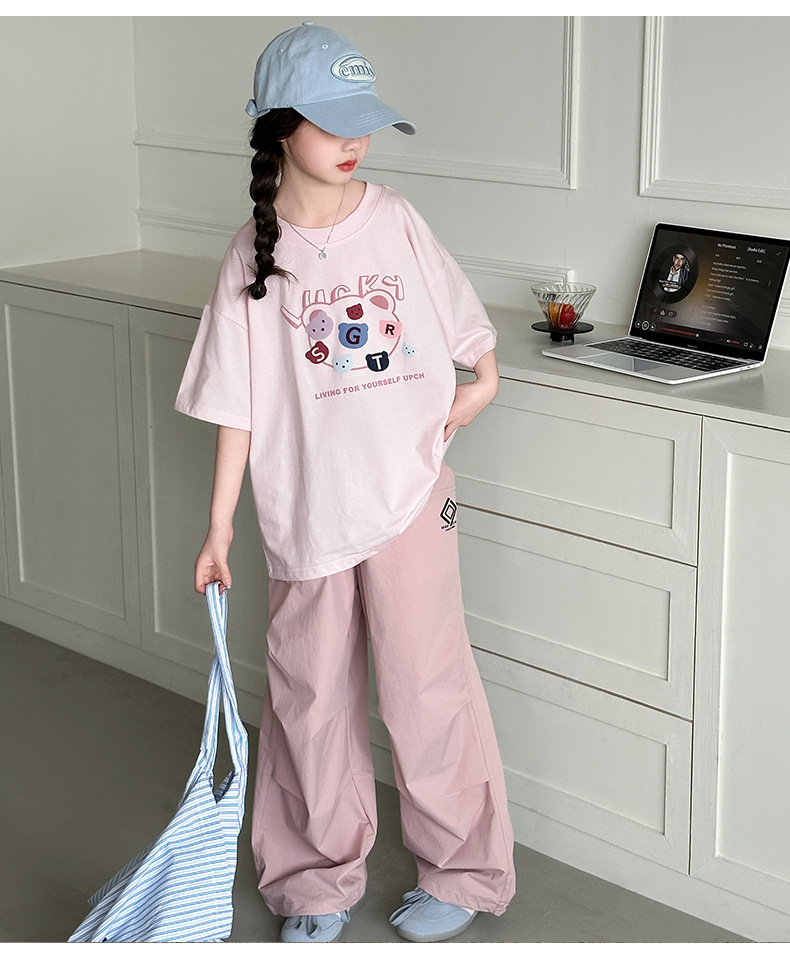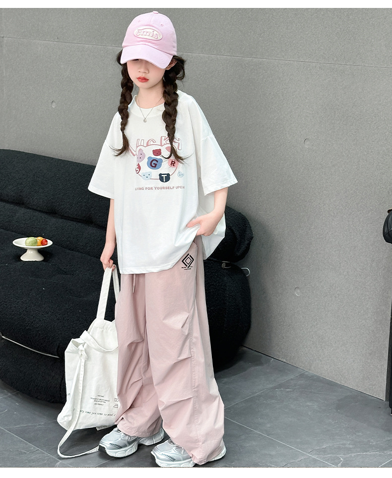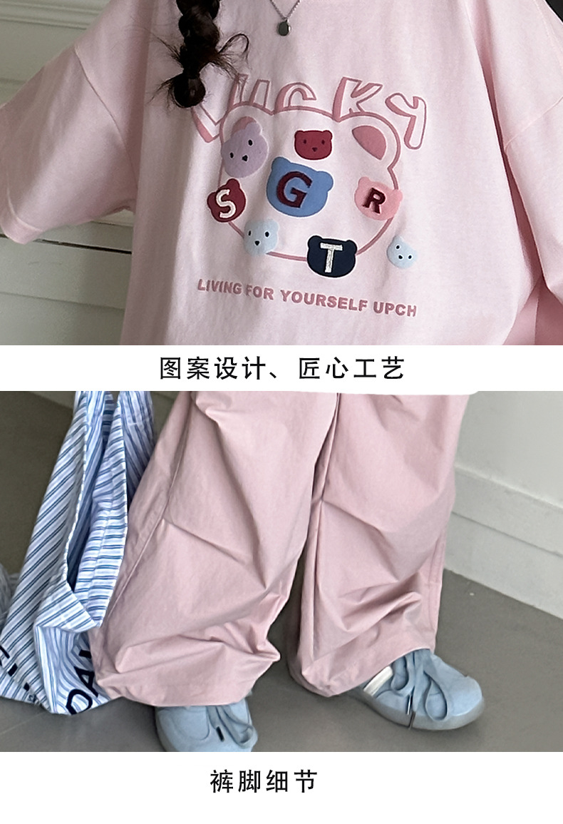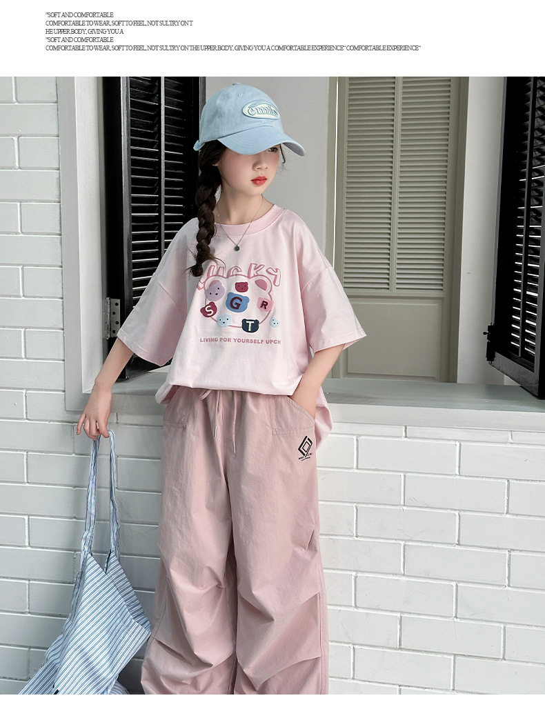 소녀의 봄과 여름 작업복 세트 어린이 패션 느슨한 반팔 와이드 레그 바지 프라이드 스트리트 투피스 세트 얇은 여름 패션스토어 가기