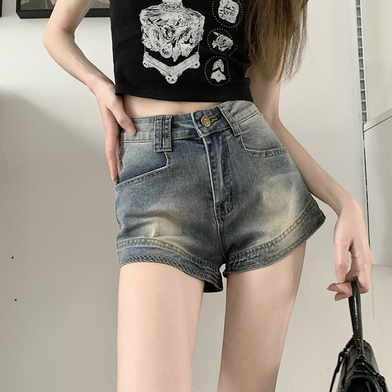 ins辣妹打底高腰牛仔短裤女小众复古做旧弹力包臀阔腿裤a字热裤子스토어 가기