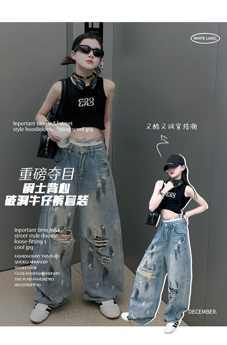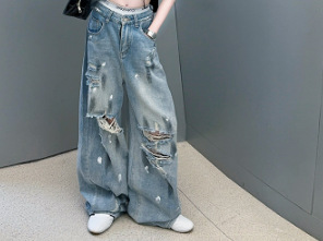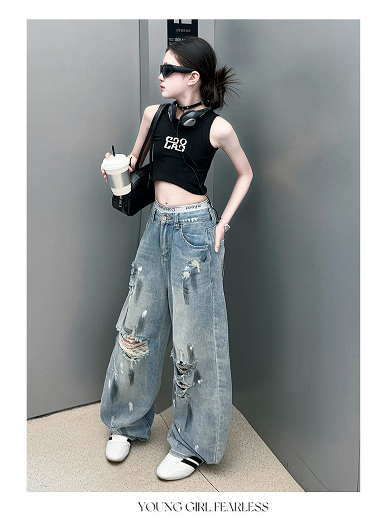 국경 간 소녀 2025 미국 복고풍 느슨한 청바지 새로운 높은 허리 넓은 다리 스플래시 잉크 구멍 청소 바지스토어 가기