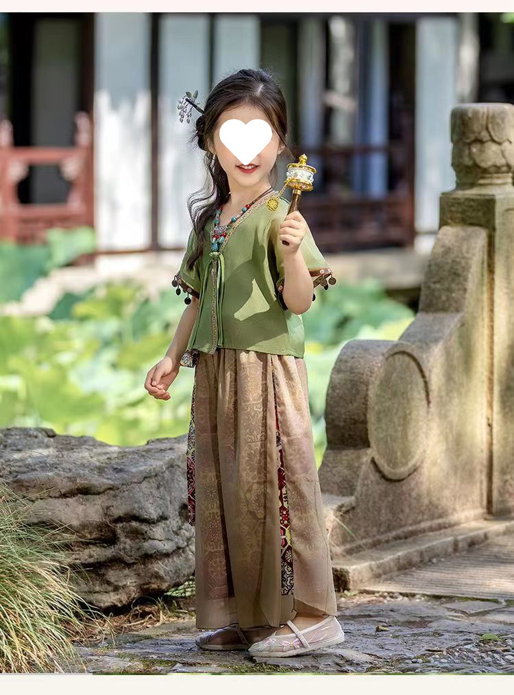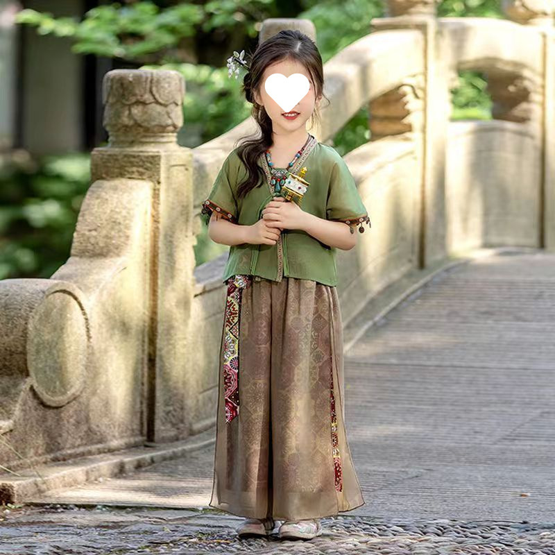 어린이 의류 2025 여름 새로운 소녀 세트 국가 스타일 새로운 중국 짧은 소매 서양식 트렌디 스커트 바지 여름 3 피스 세트스토어 가기