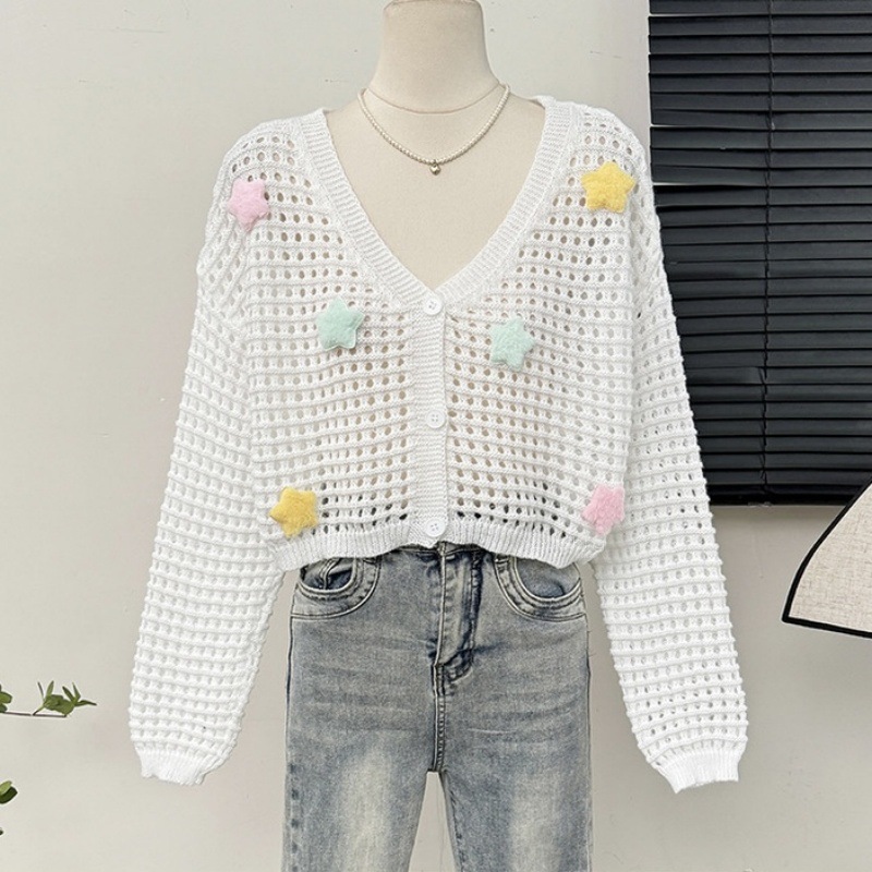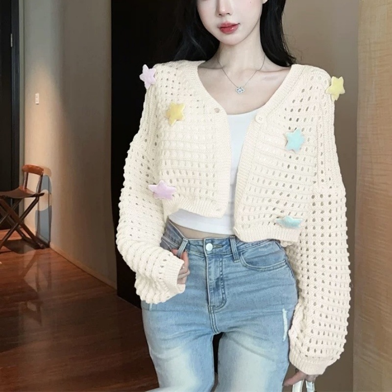 부드럽고 달콤한 나이를 줄이는 중공 카디건 재킷 여성의 봄과 가을 니트 탑 3 차원 별 짧은 선 스크린 블라우스