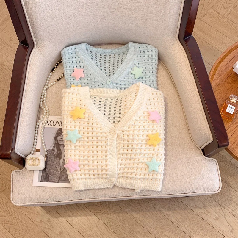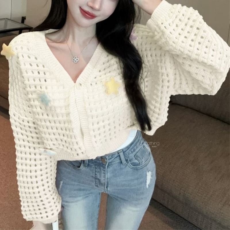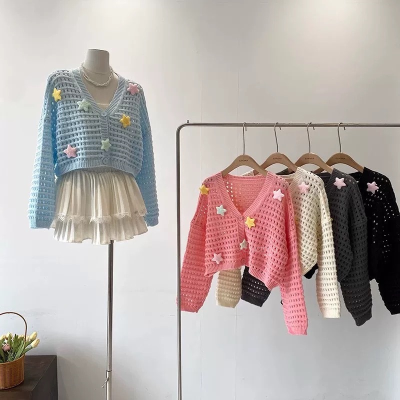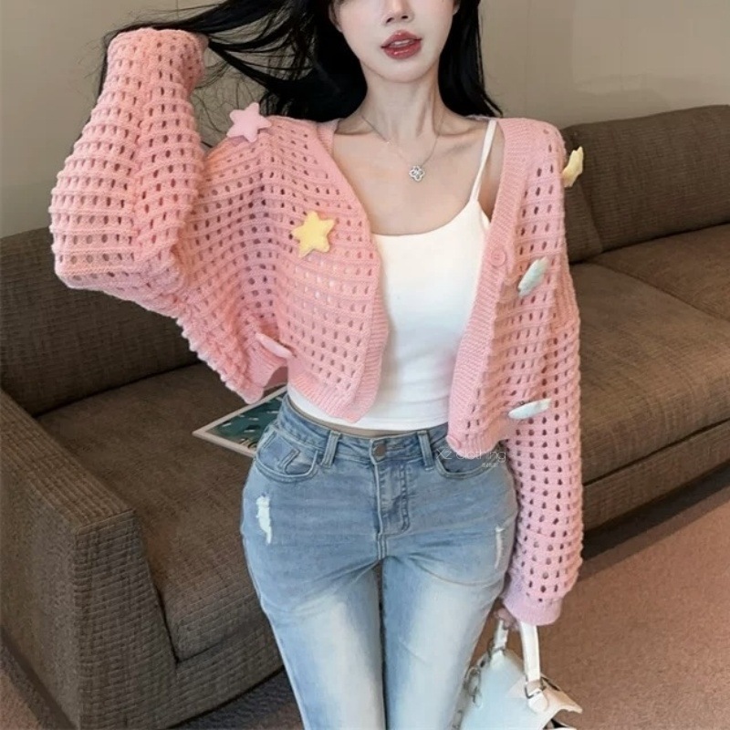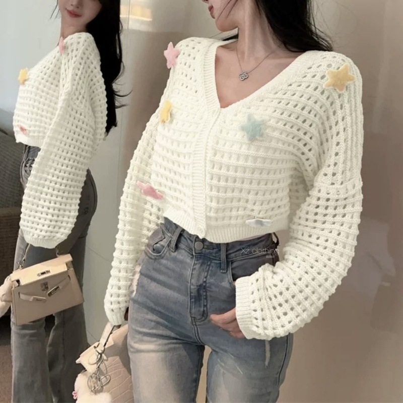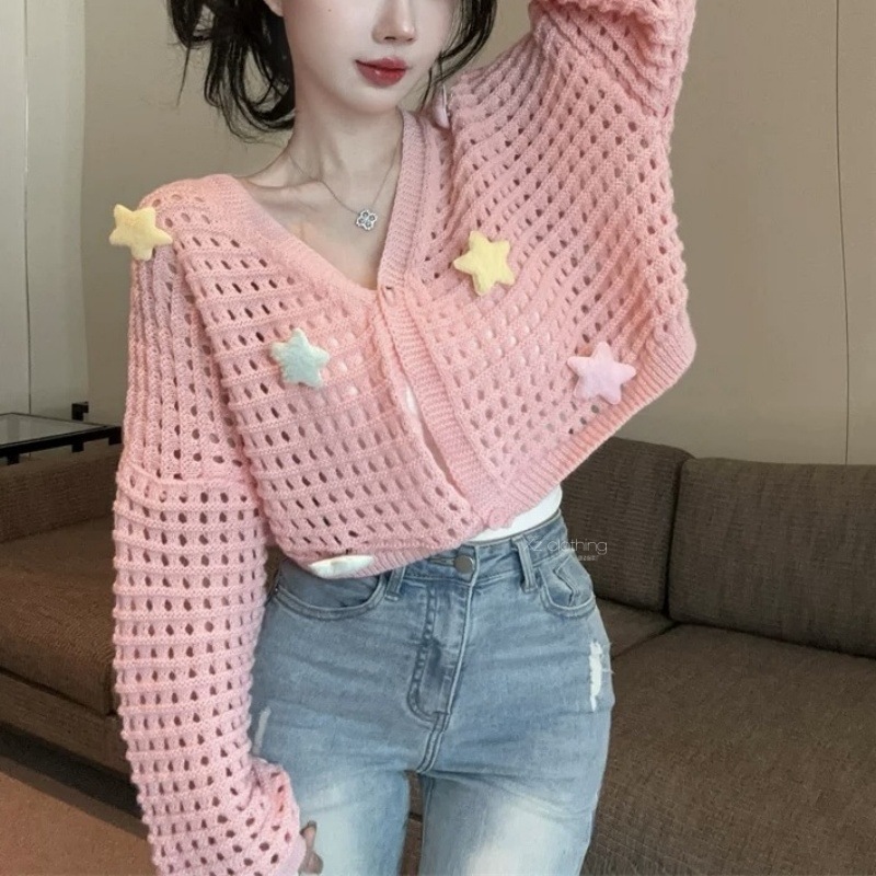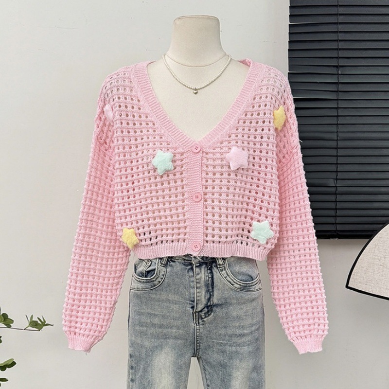 부드럽고 달콤한 나이를 줄이는 중공 카디건 재킷 여성의 봄과 가을 니트 탑 3 차원 별 짧은 선 스크린 블라우스스토어 가기
