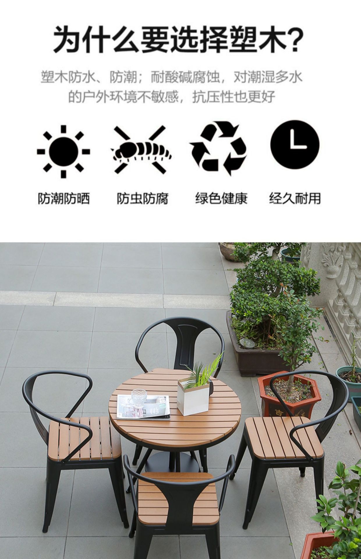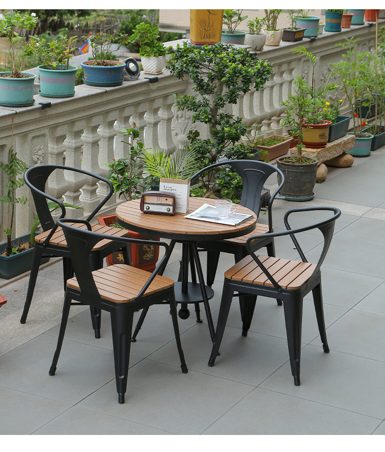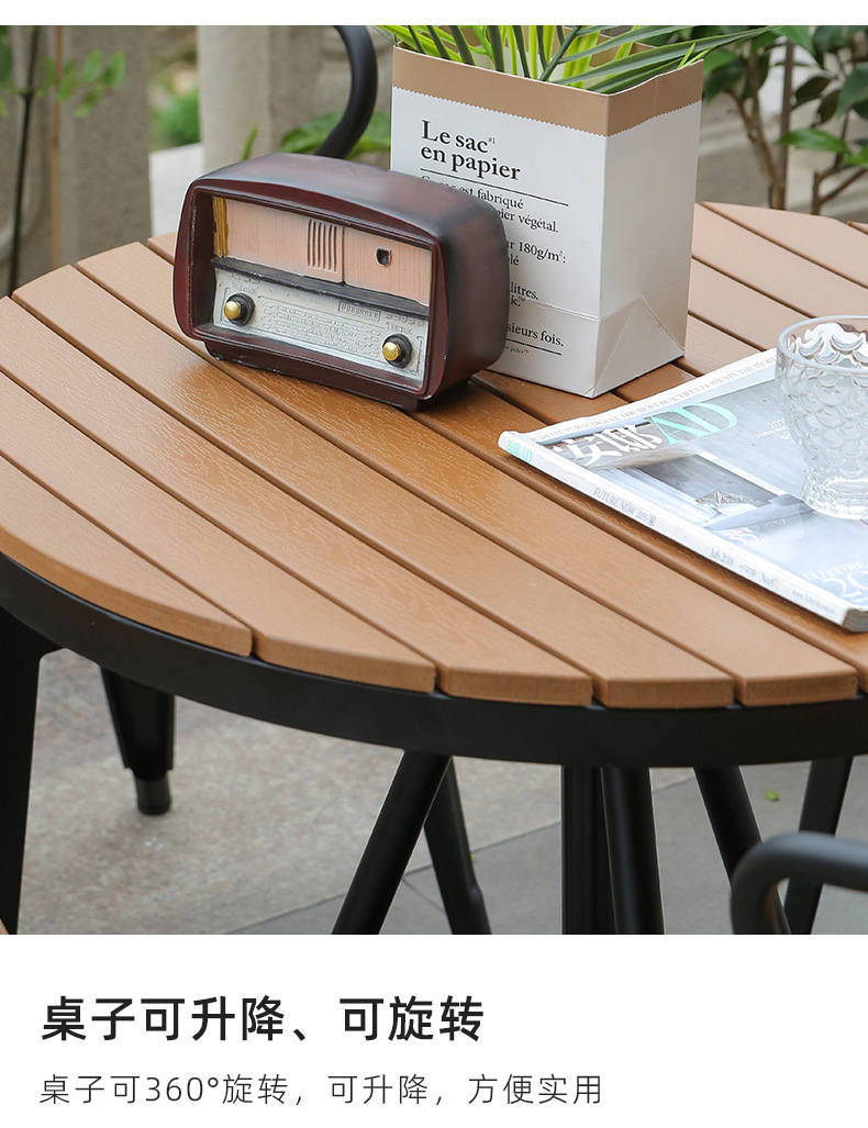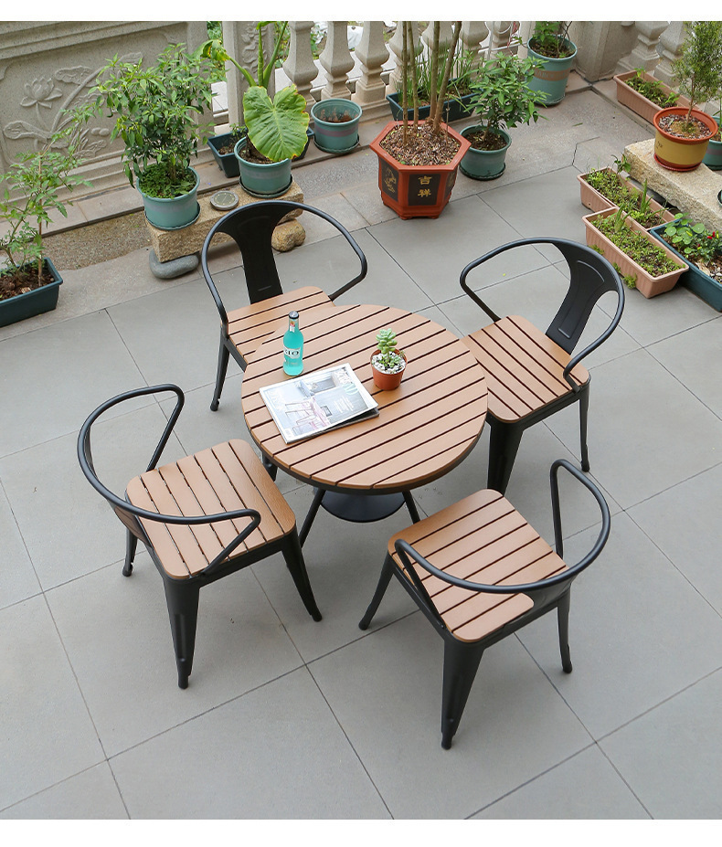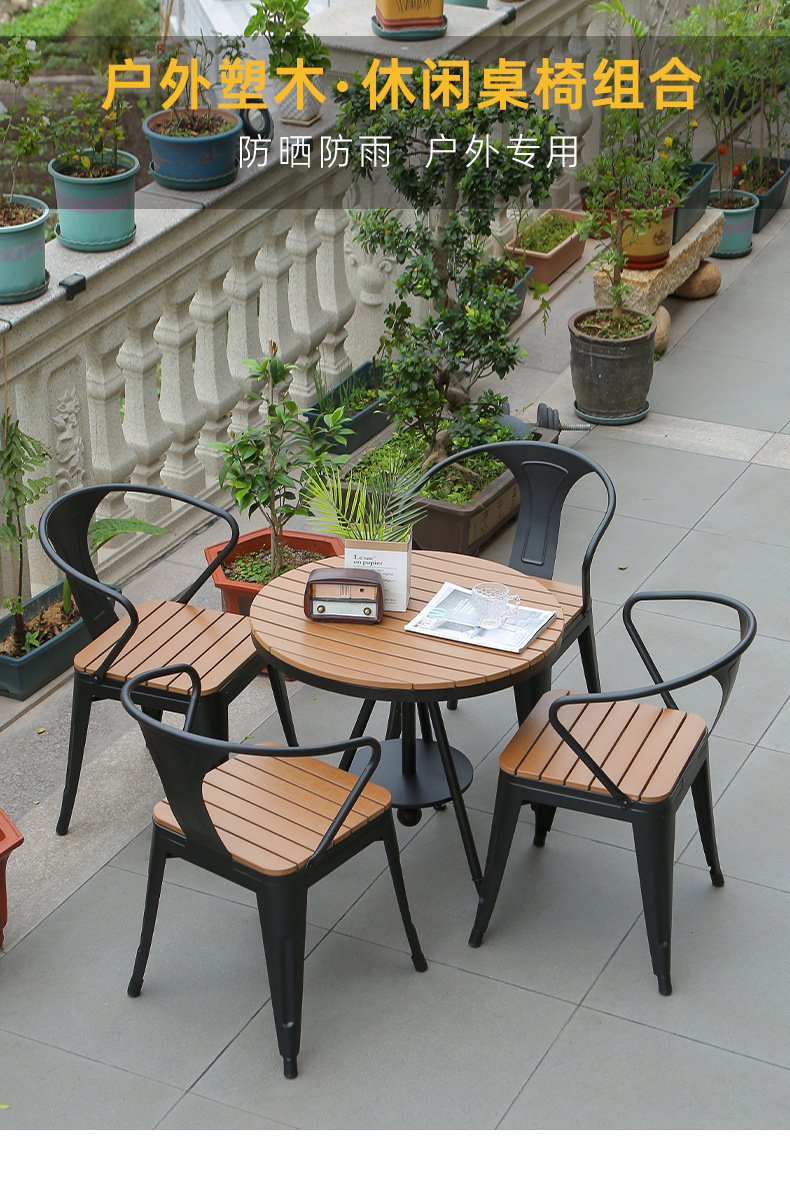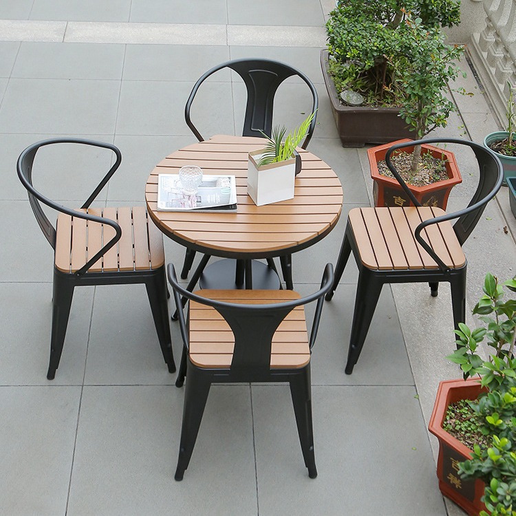 야외 테이블과 의자 발코니 커피 테이블 안뜰 야외 레저 플라스틱 나무 라운드 테이블 밀크 티 숍 외부 식탁 및 의자 1 테이블 및 4 개의 의자