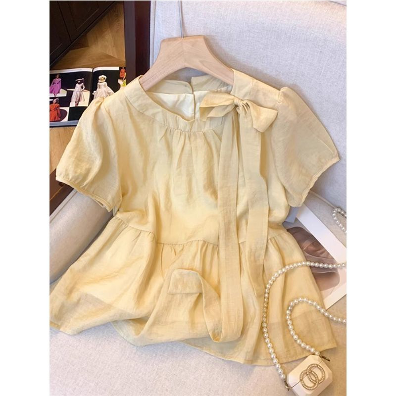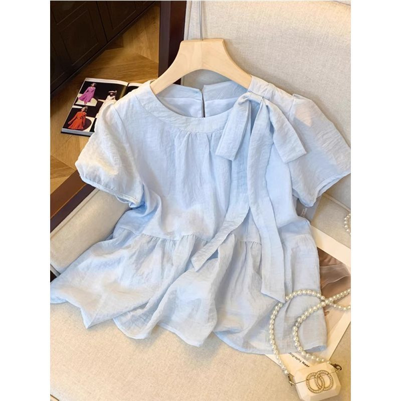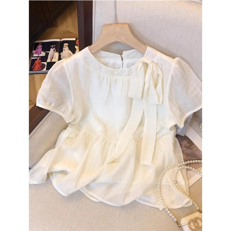 프랑스 스타일 달콤한 레이스 업 쉬폰 반팔 셔츠 여성의 여름 달콤한 나이 감소 퍼프 소매 인형 셔츠 아름다운 세련된 탑