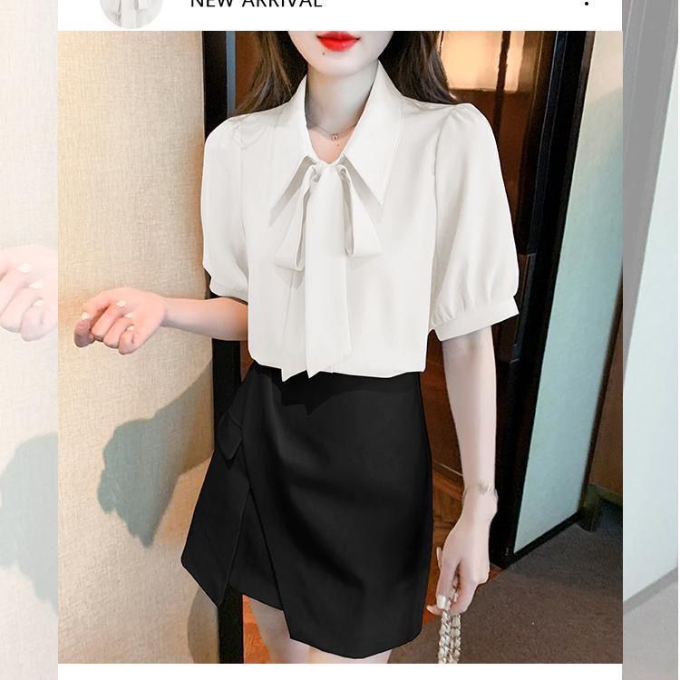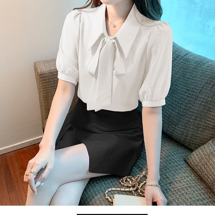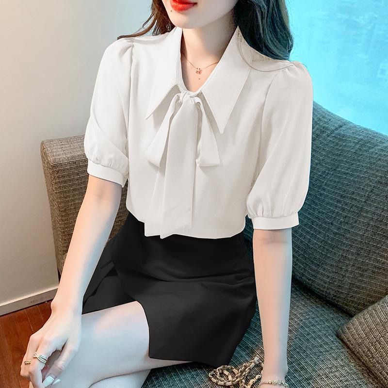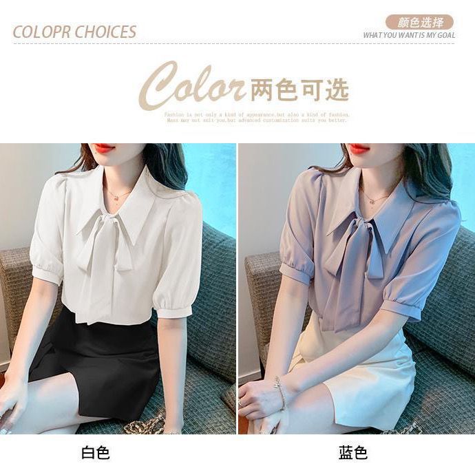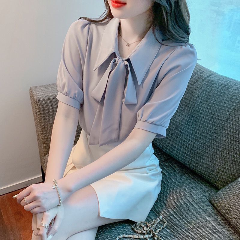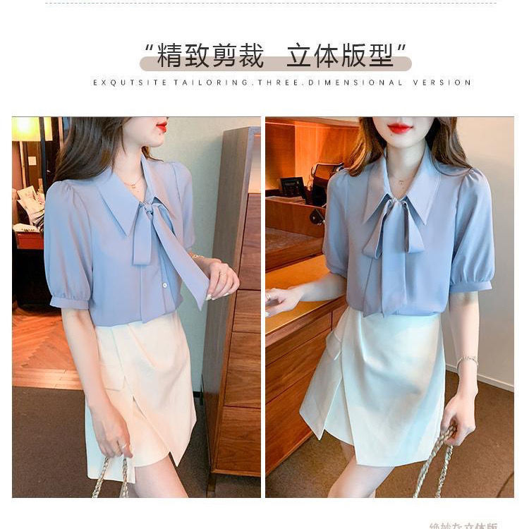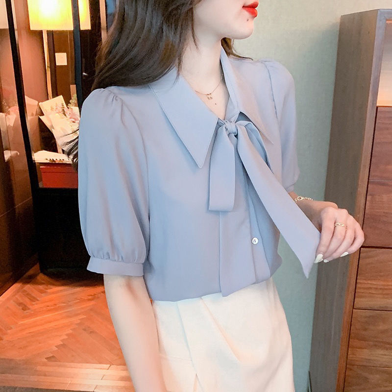 여성을 위한 여름 신상 스모크 블루 반팔 쉬폰 셔츠, 한국식 리본 탑, 젠틀 스타일 셔츠스토어 가기