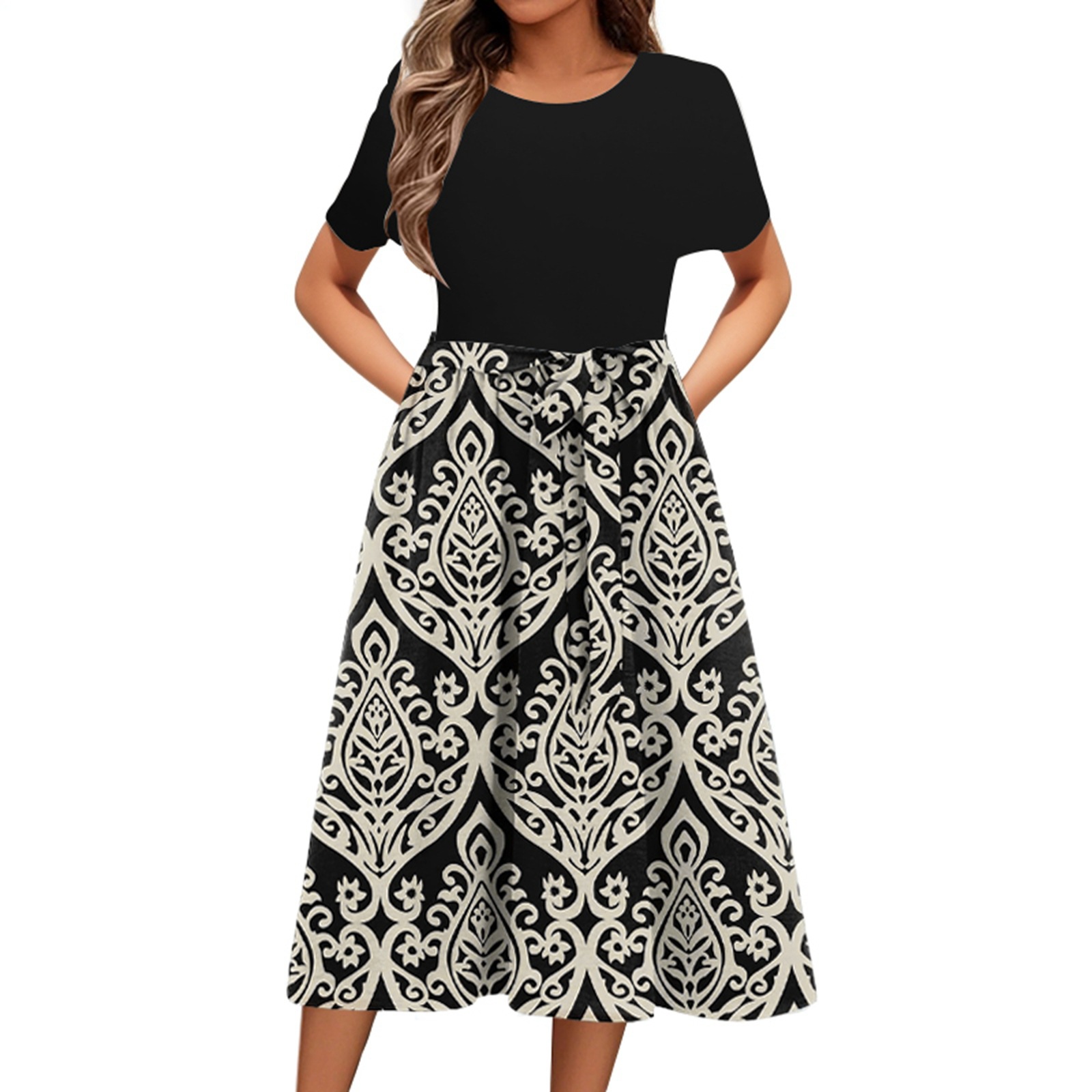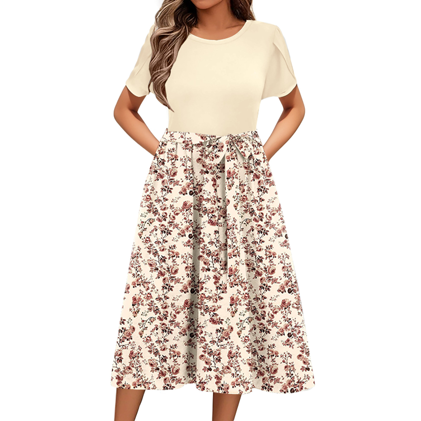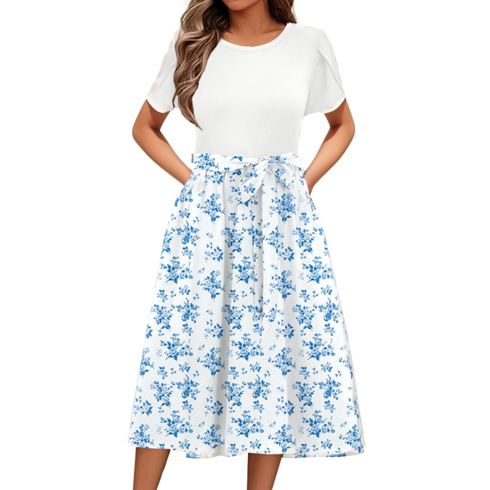 대외 무역 유럽과 미국의 여성 의류 아마존 2025 여름 인쇄 바느질 반팔 원피스 레이스 업 허리 원피스스토어 가기