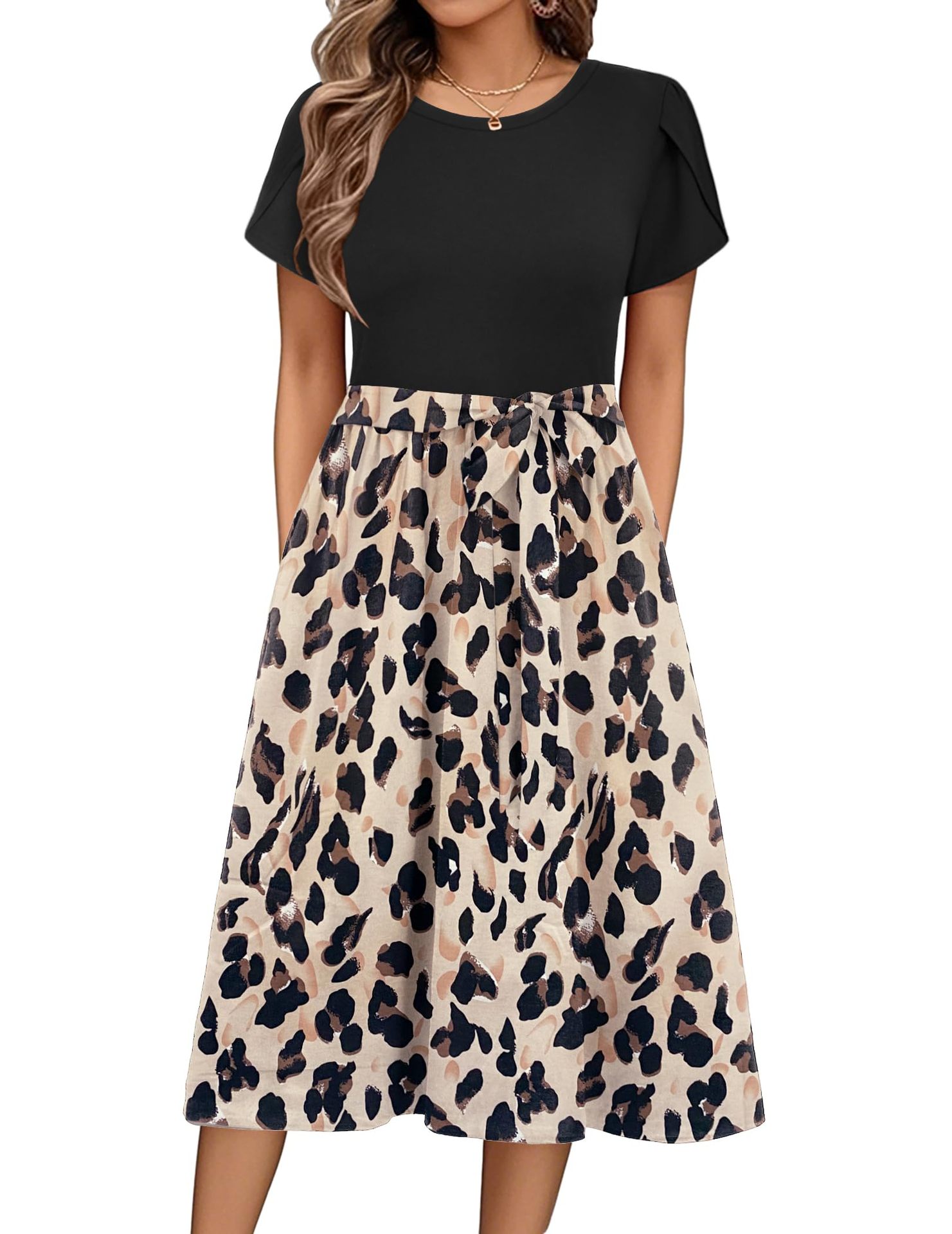 대외 무역 유럽과 미국의 여성 의류 아마존 2025 여름 인쇄 바느질 반팔 원피스 레이스 업 허리 원피스