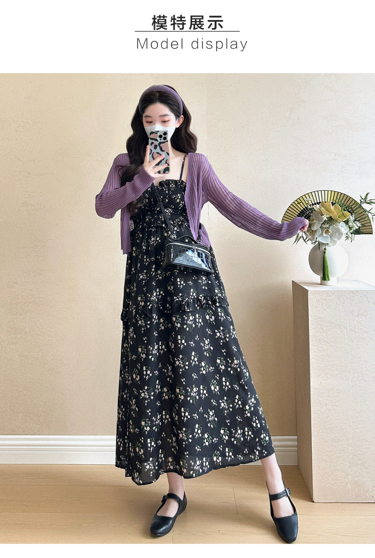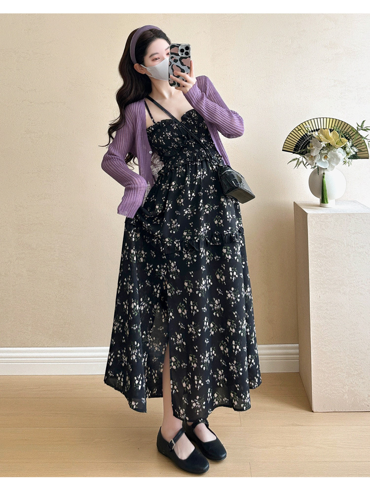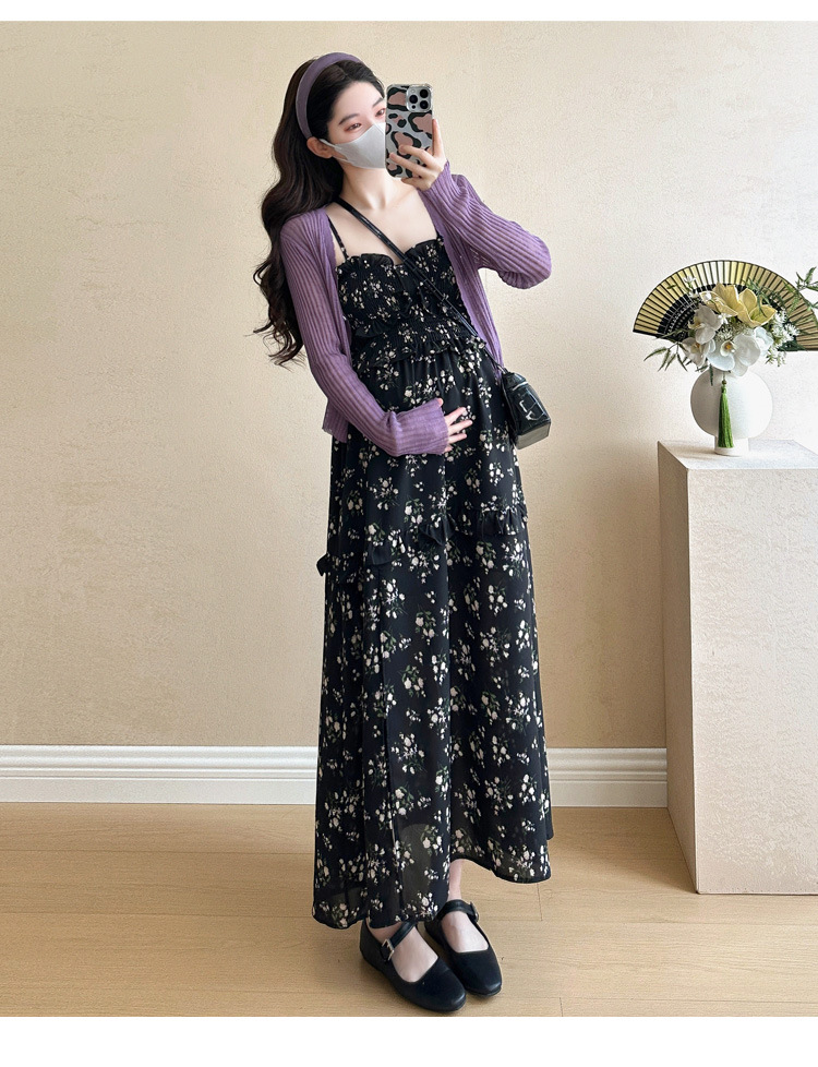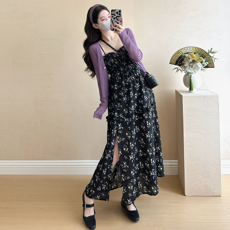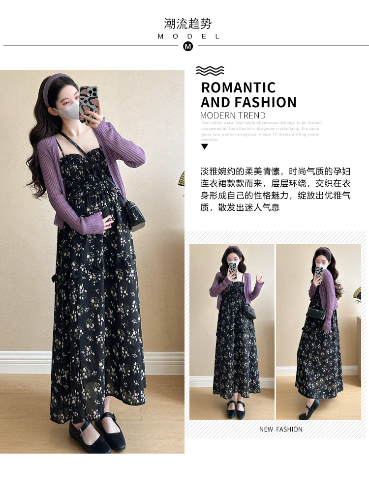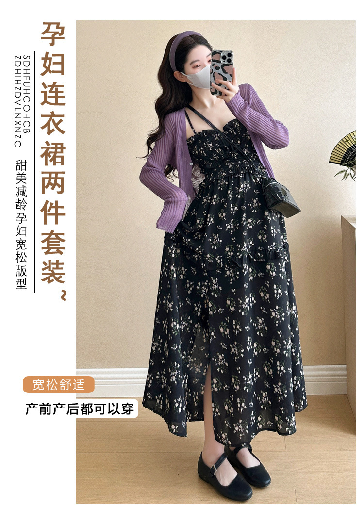 임산부 2025 년 여름 새로운 달콤한 작은 꽃 쉬폰 서스펜더 스커트 + 태양 보호 셔츠 카디건 투피스 세트