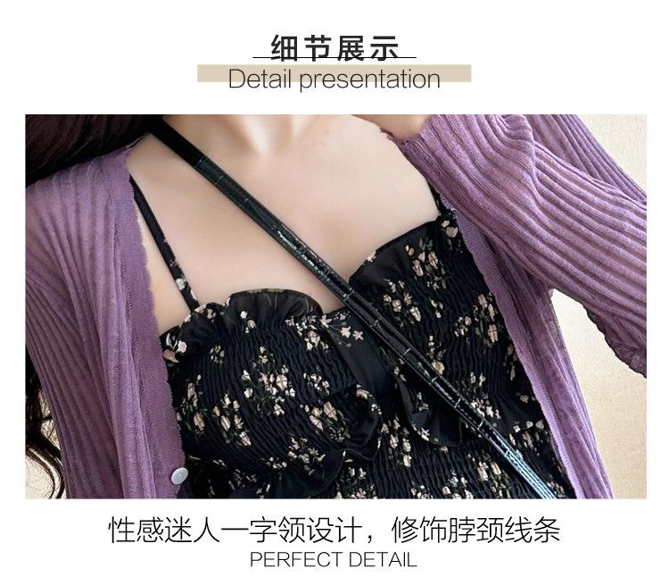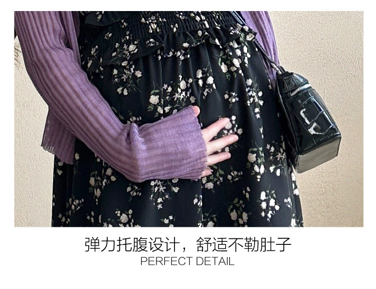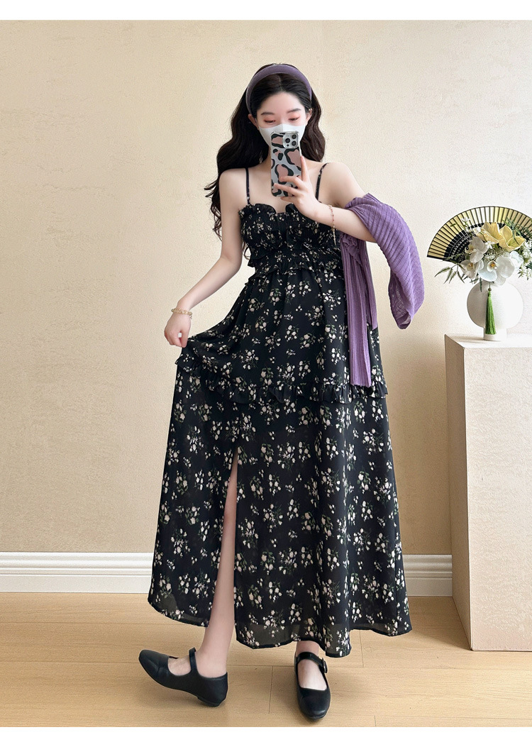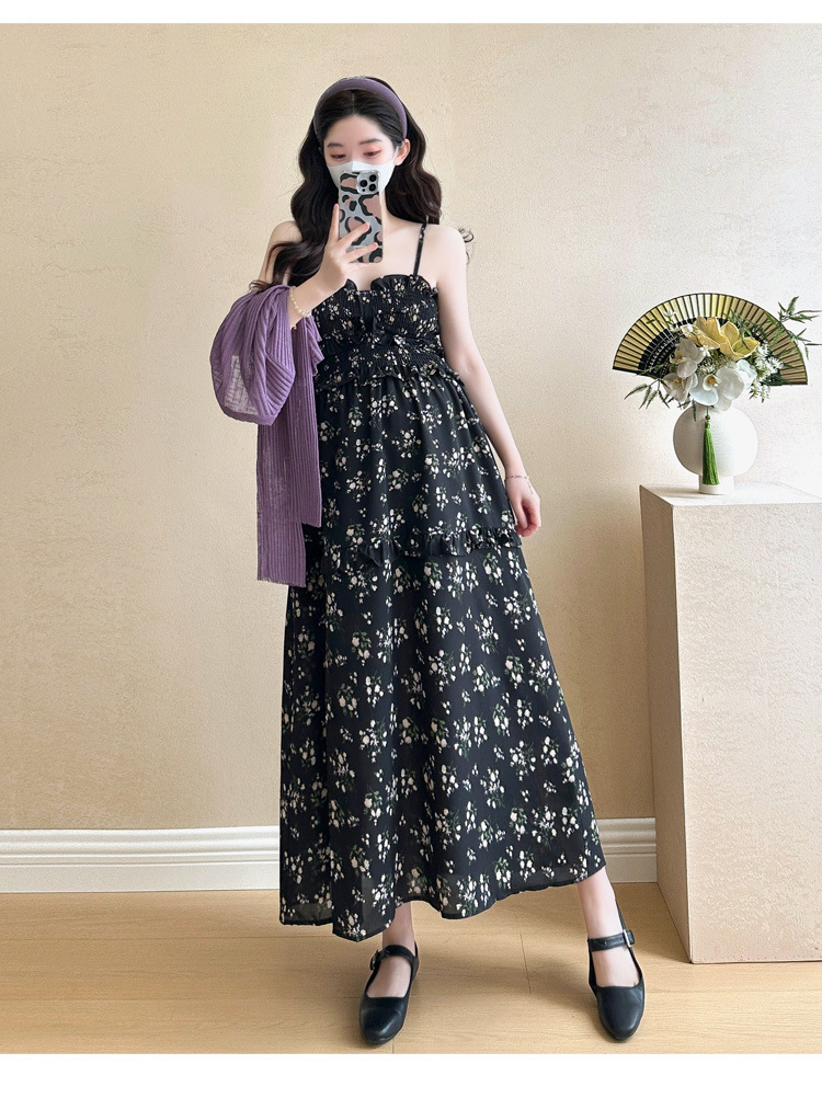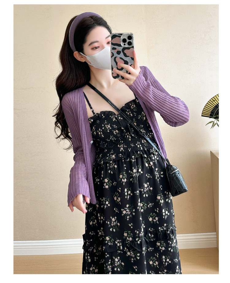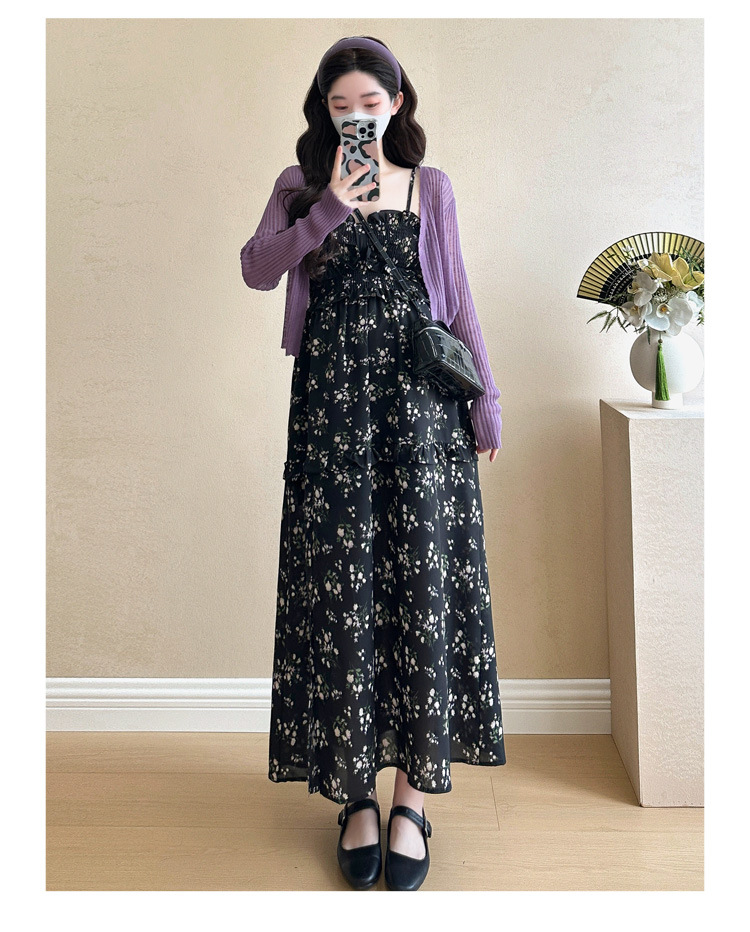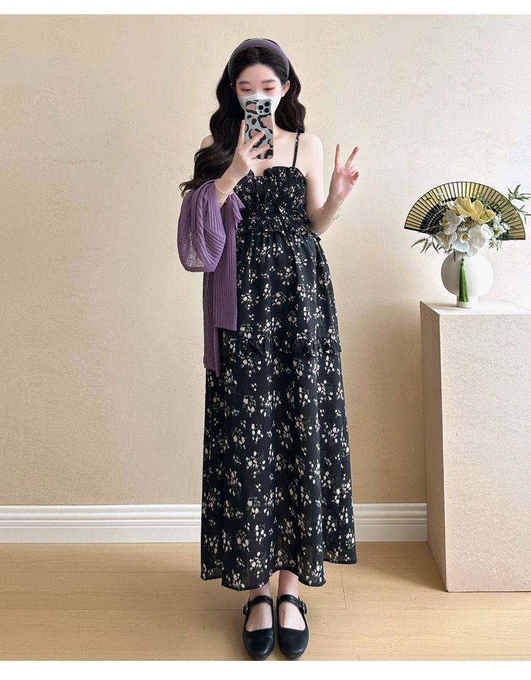 임산부 2025 년 여름 새로운 달콤한 작은 꽃 쉬폰 서스펜더 스커트 + 태양 보호 셔츠 카디건 투피스 세트