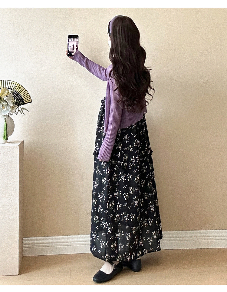 • 보라색 가디건+블랙 서스펜더 스커트 투피스 세트