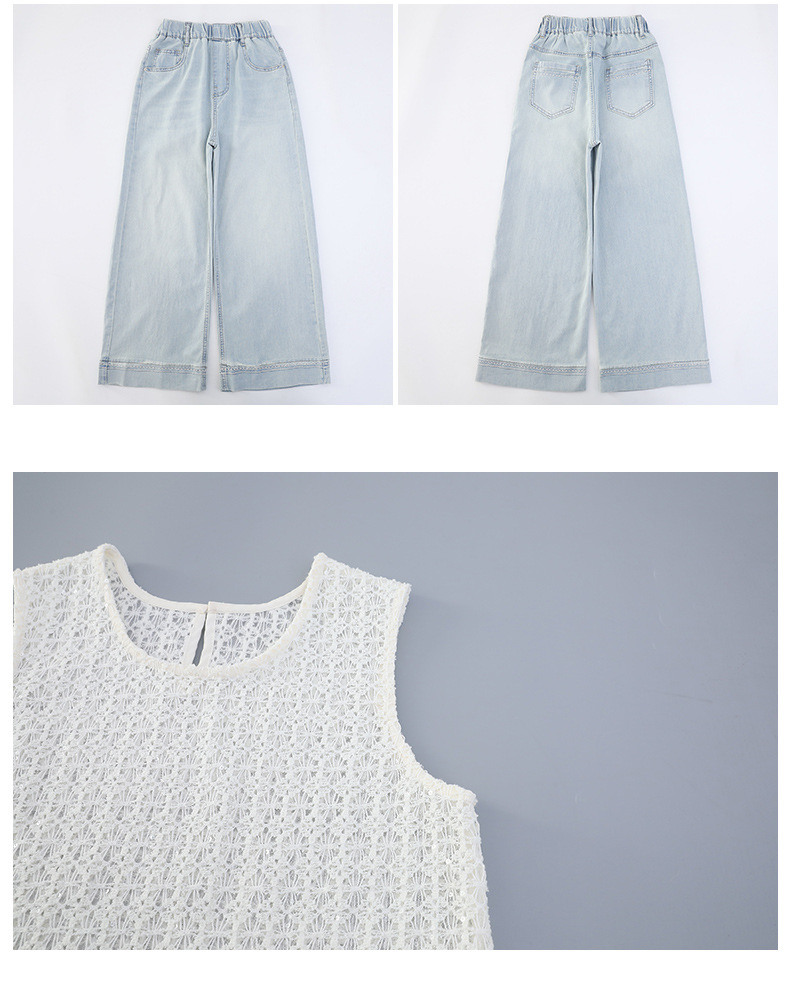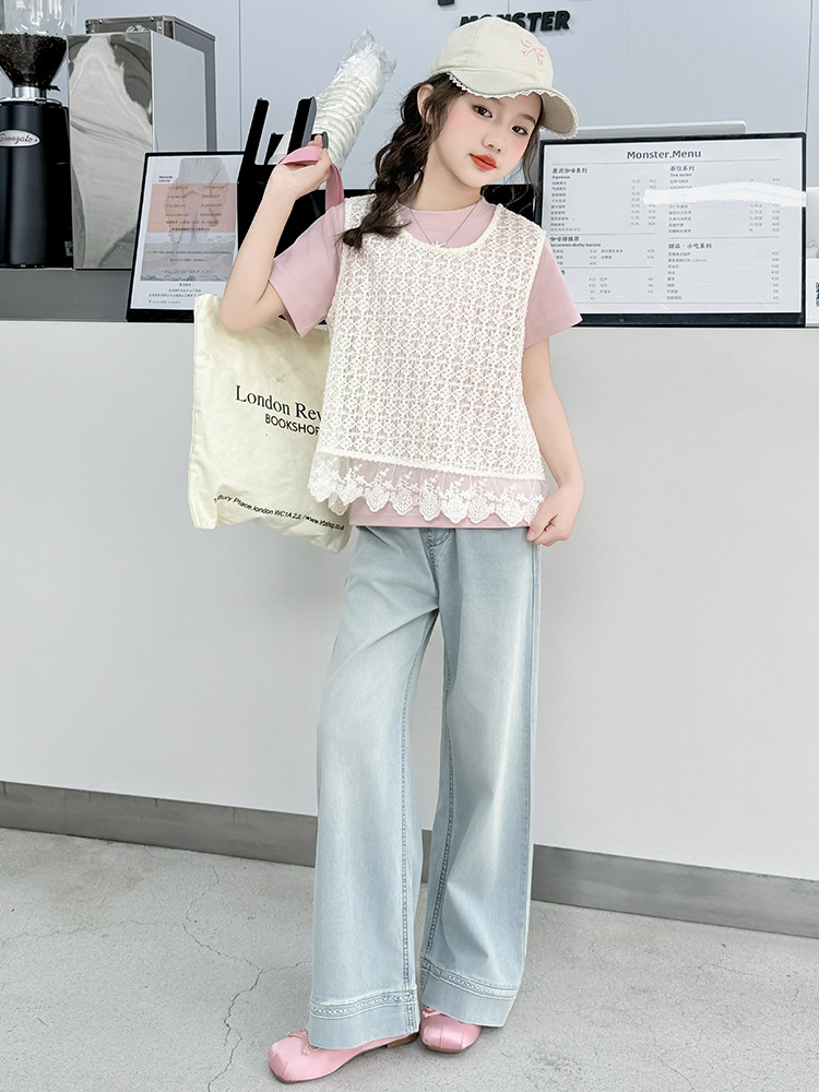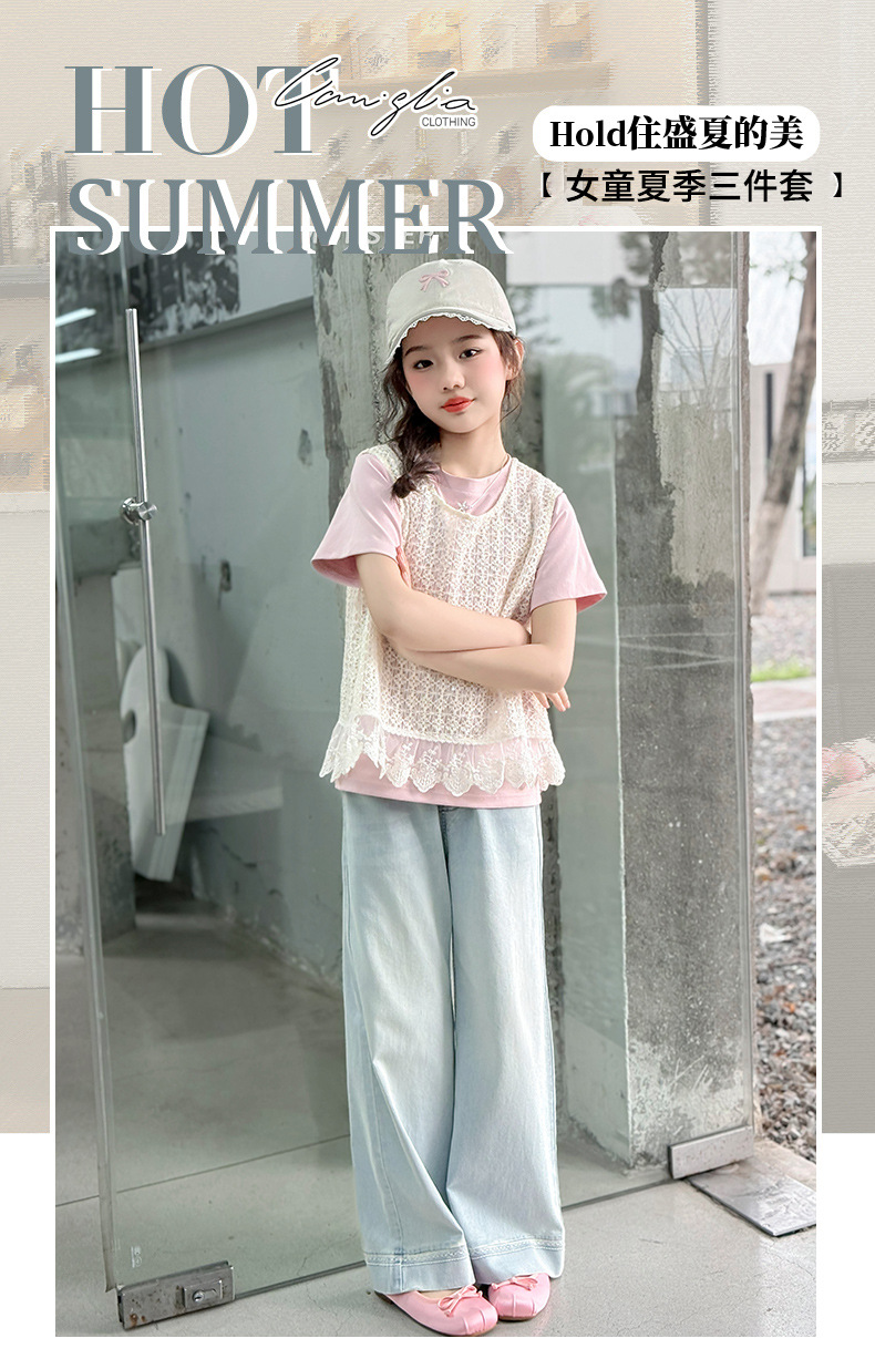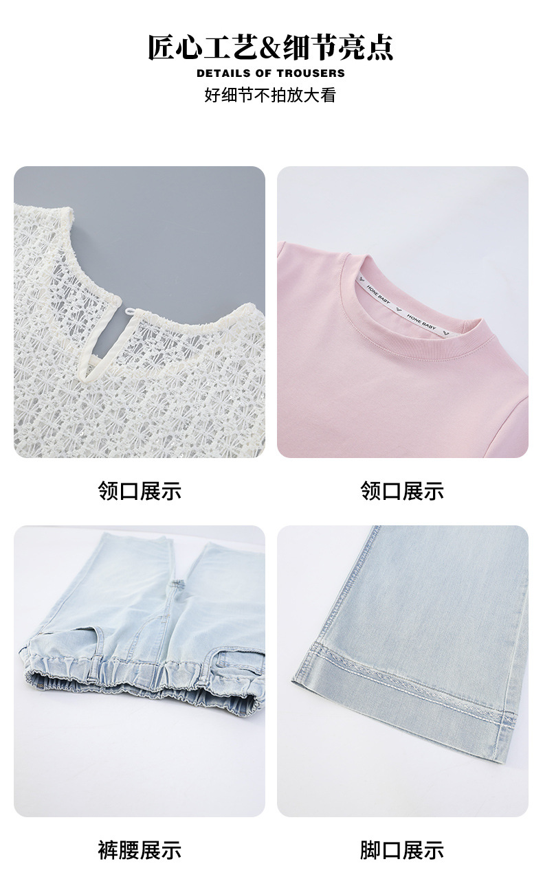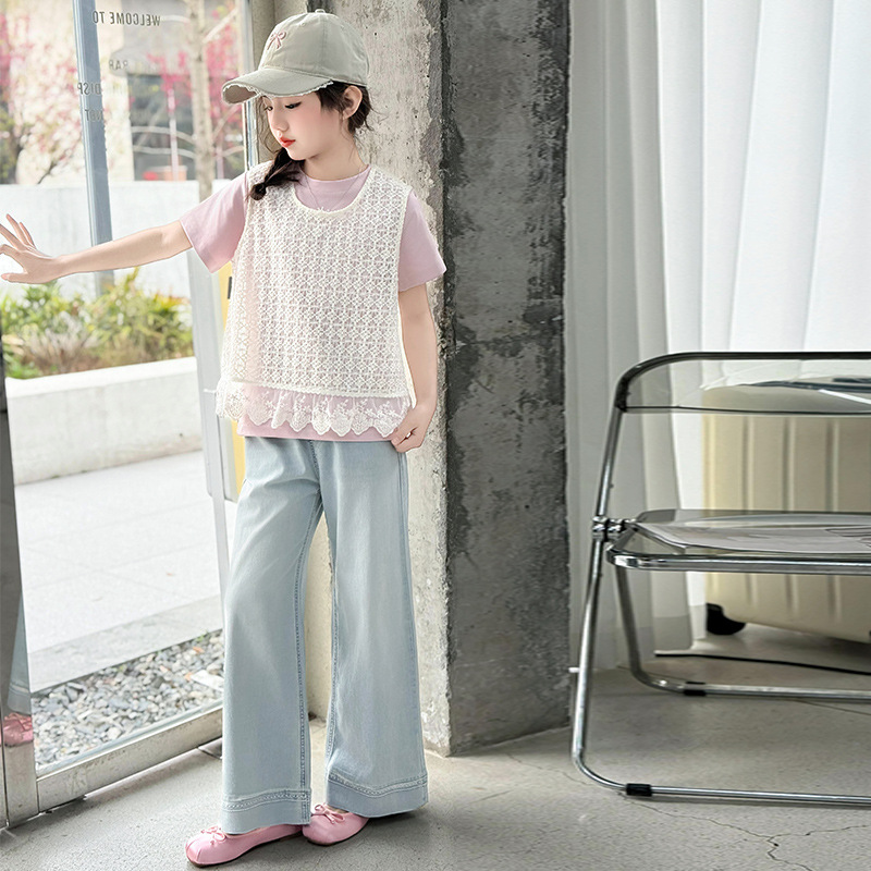 소녀 세트 여름 2025 새로운 어린이 서양식 여름 레이스 반팔 소녀 청바지 3 종 세트스토어 가기