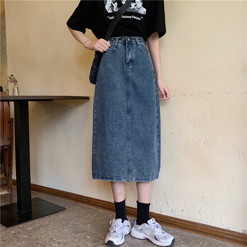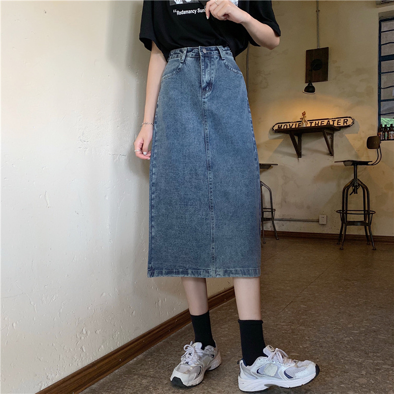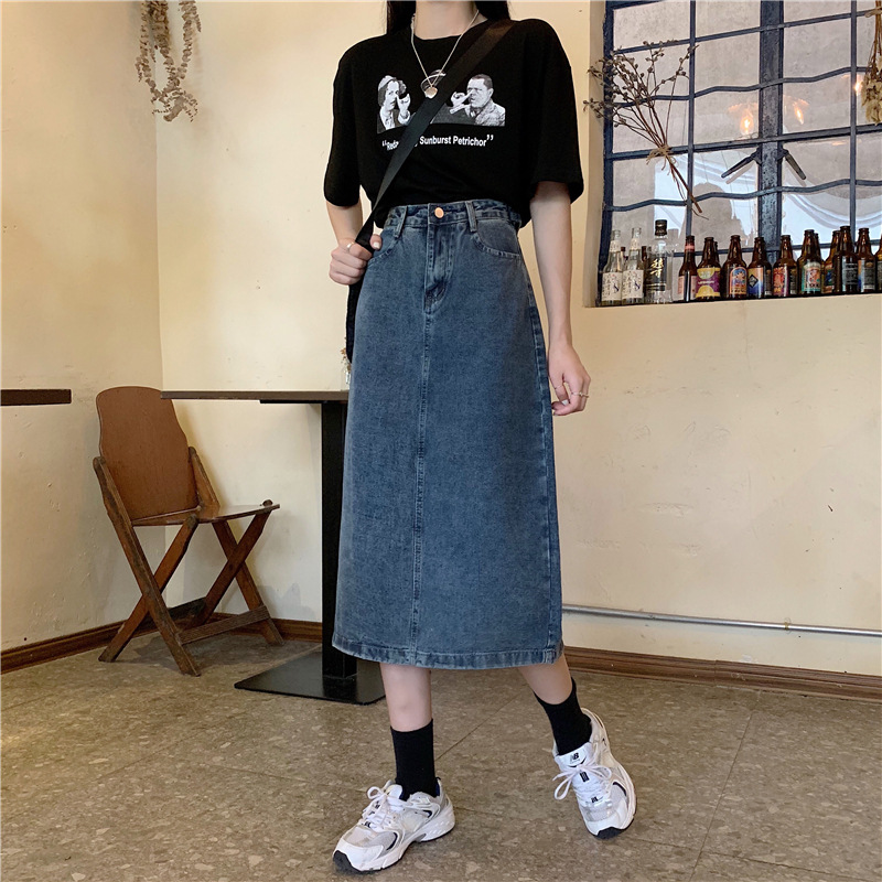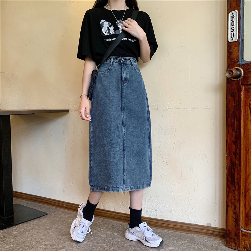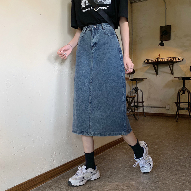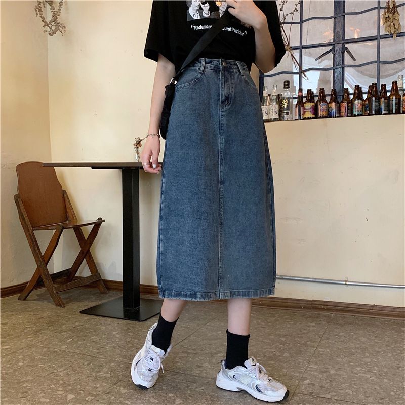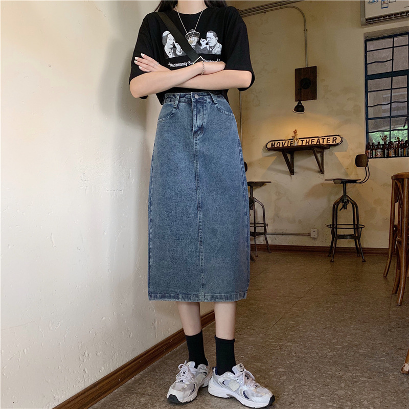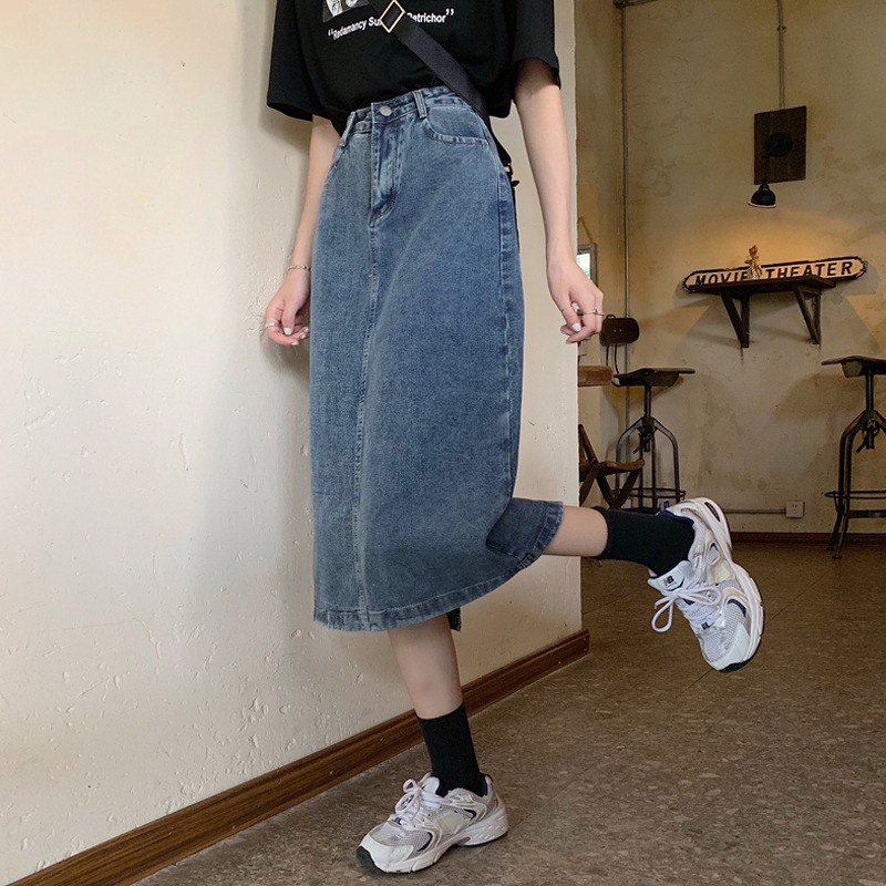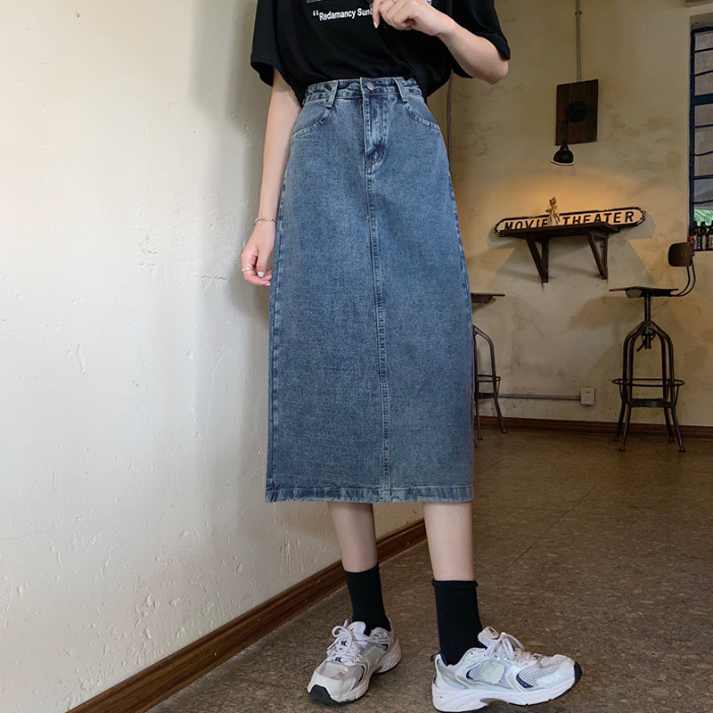 통통한 소녀를위한 플러스 사이즈 여성용 힙합 하프 길이 스커트 여름 새로운 높은 허리 분할 중간 길이 슬리밍 데님 스커트스토어 가기