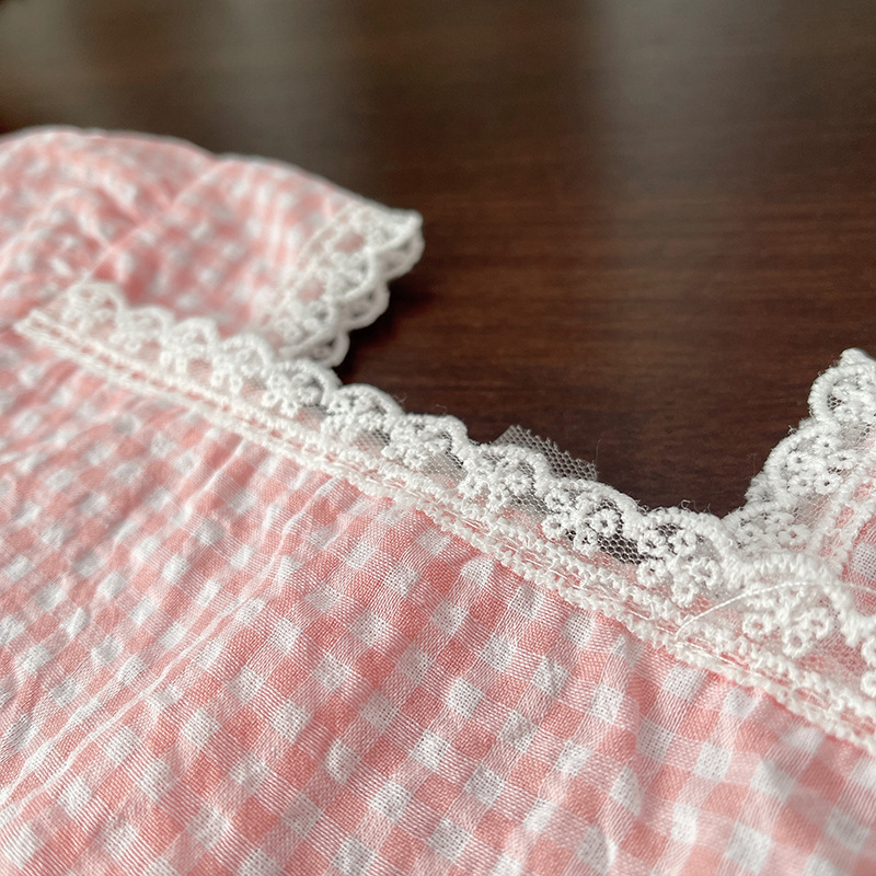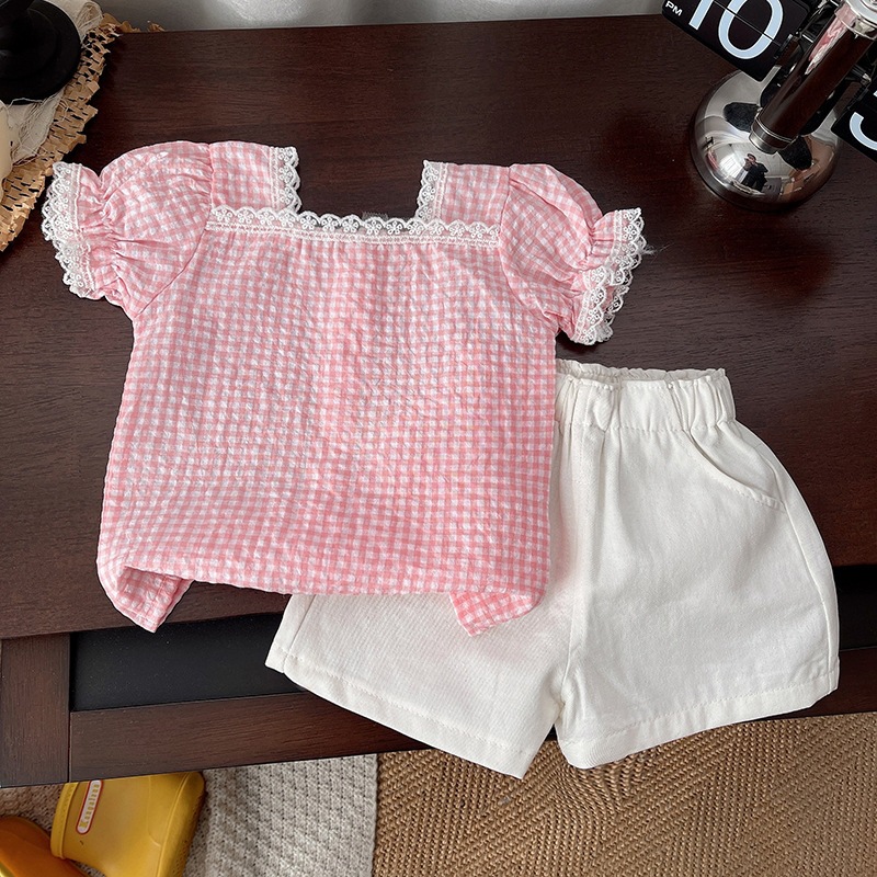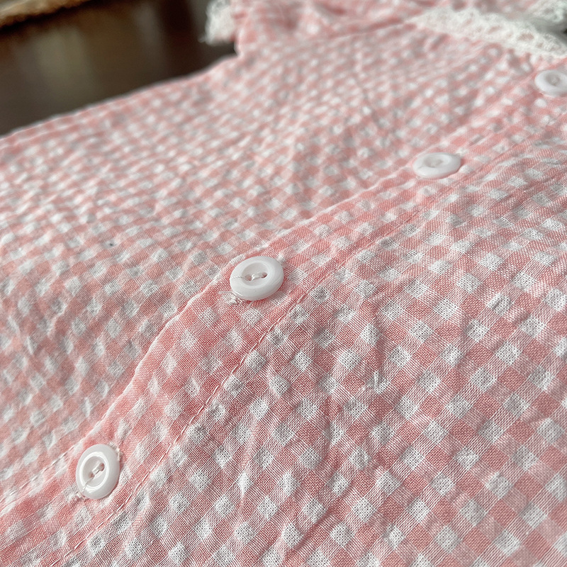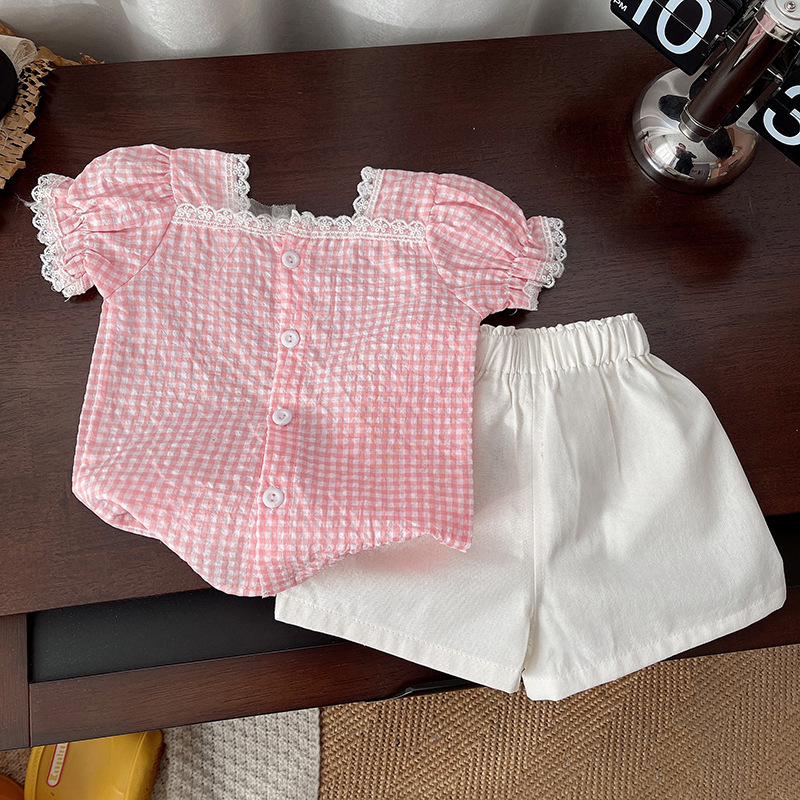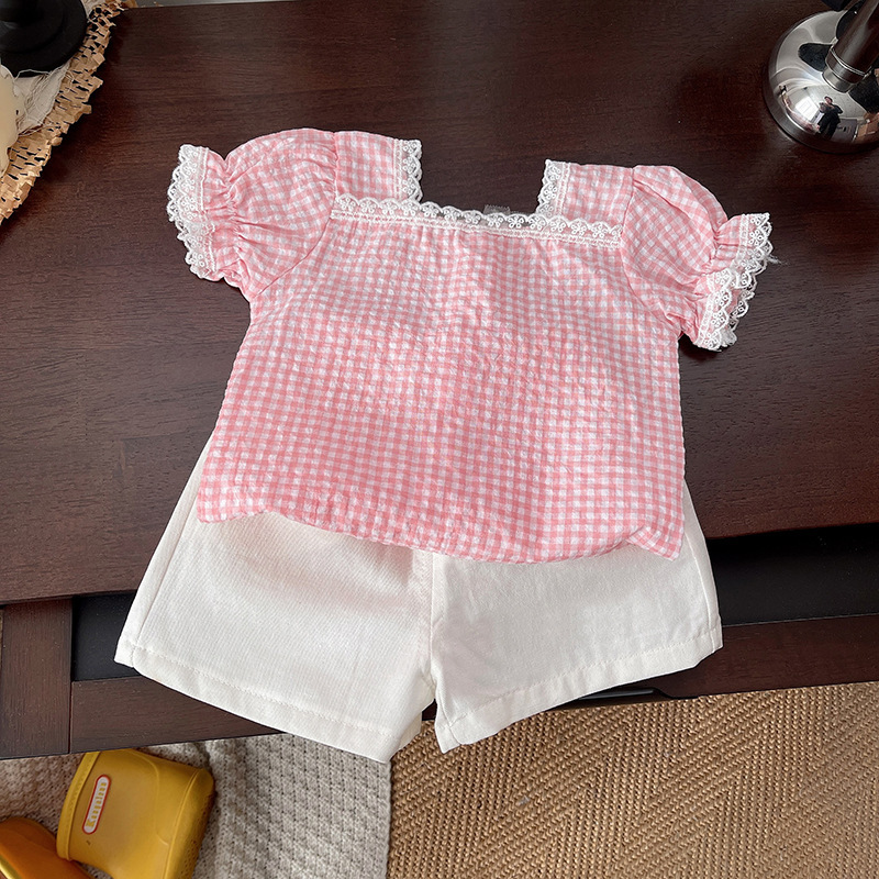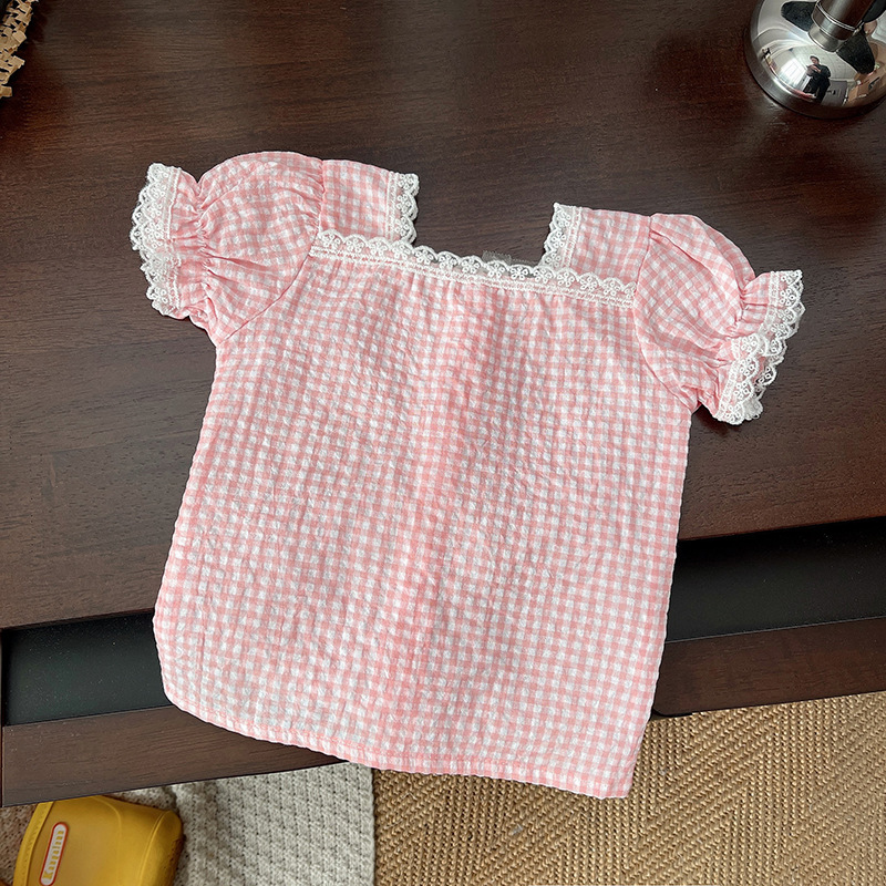 아기 소녀 여름 정장 반팔 티셔츠 공주 탑 유행 얇은 한국 스타일 인형 셔츠 소녀 격자 무늬 셔츠