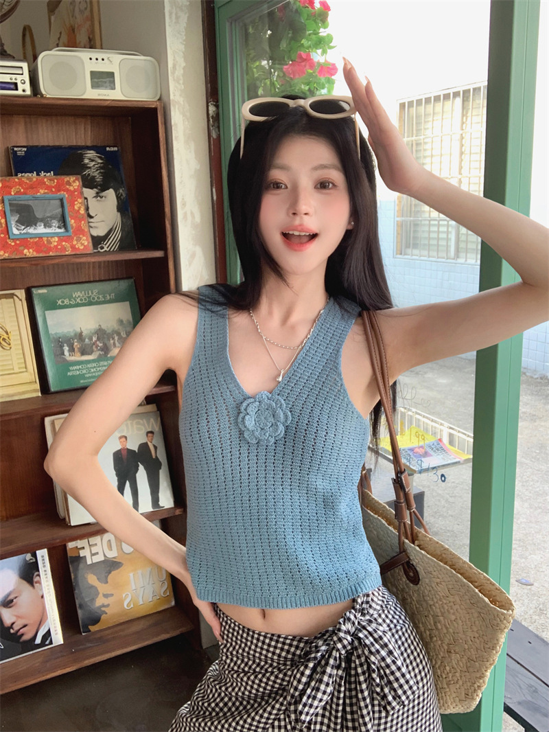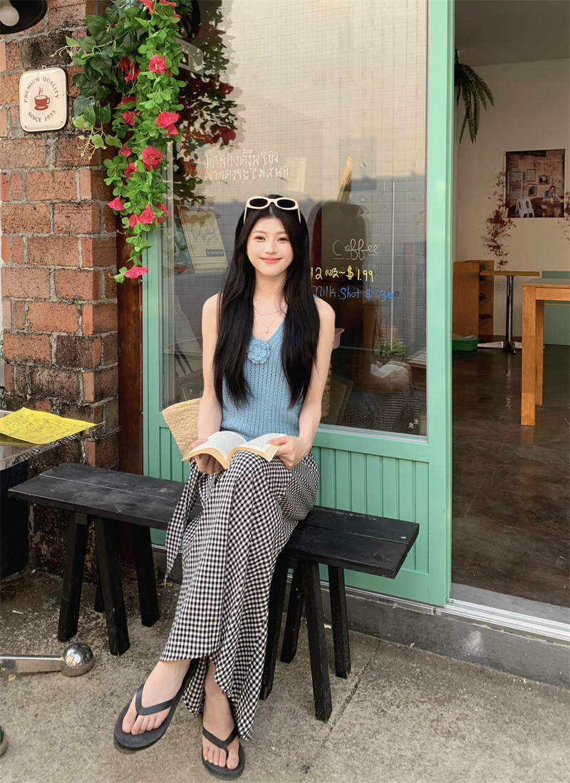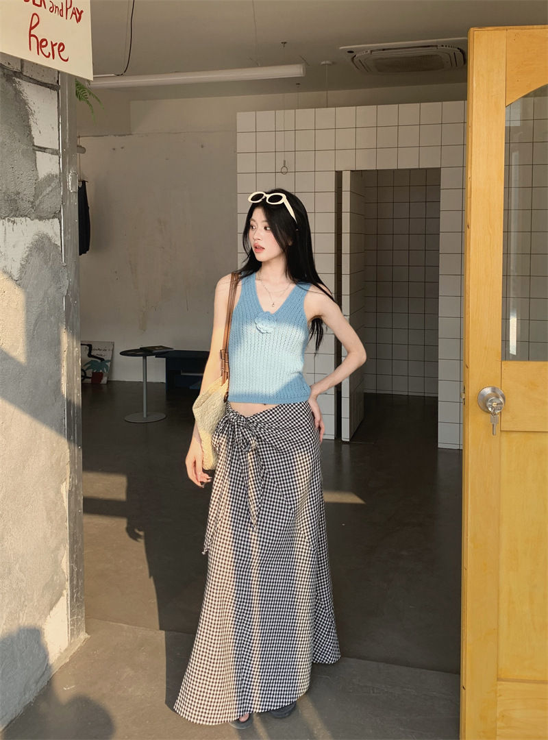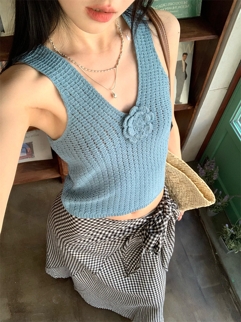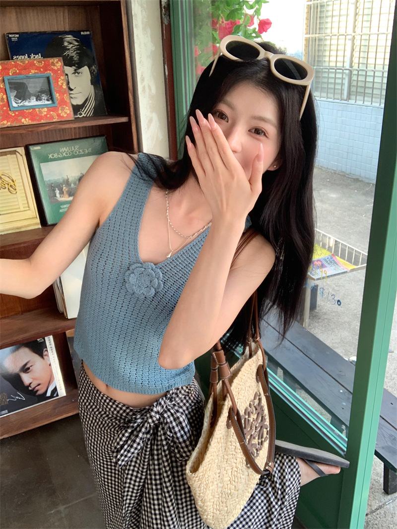 리얼 샷 에이지 감소 올 매치 니트 V 넥 3 차원 플라워 디자인 민소매 스트랩 탑 레이스 업 플레이드 스커트스토어 가기