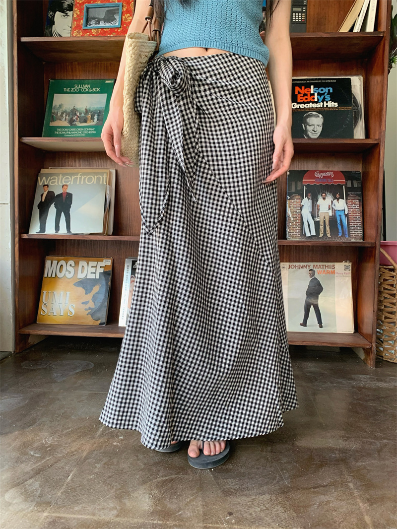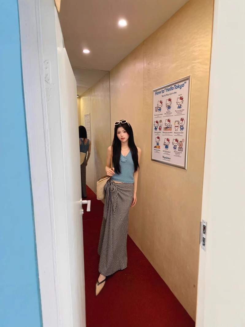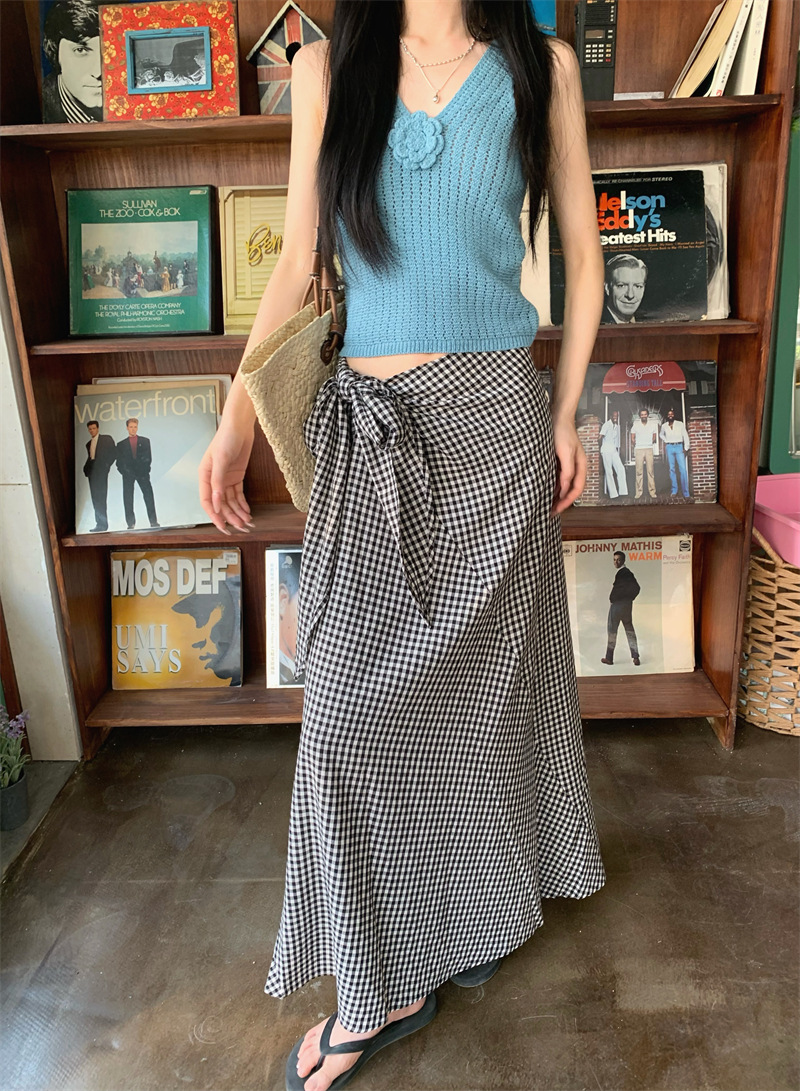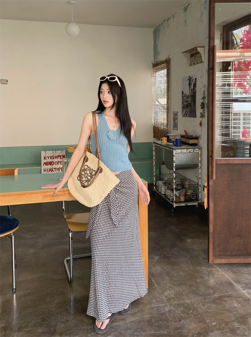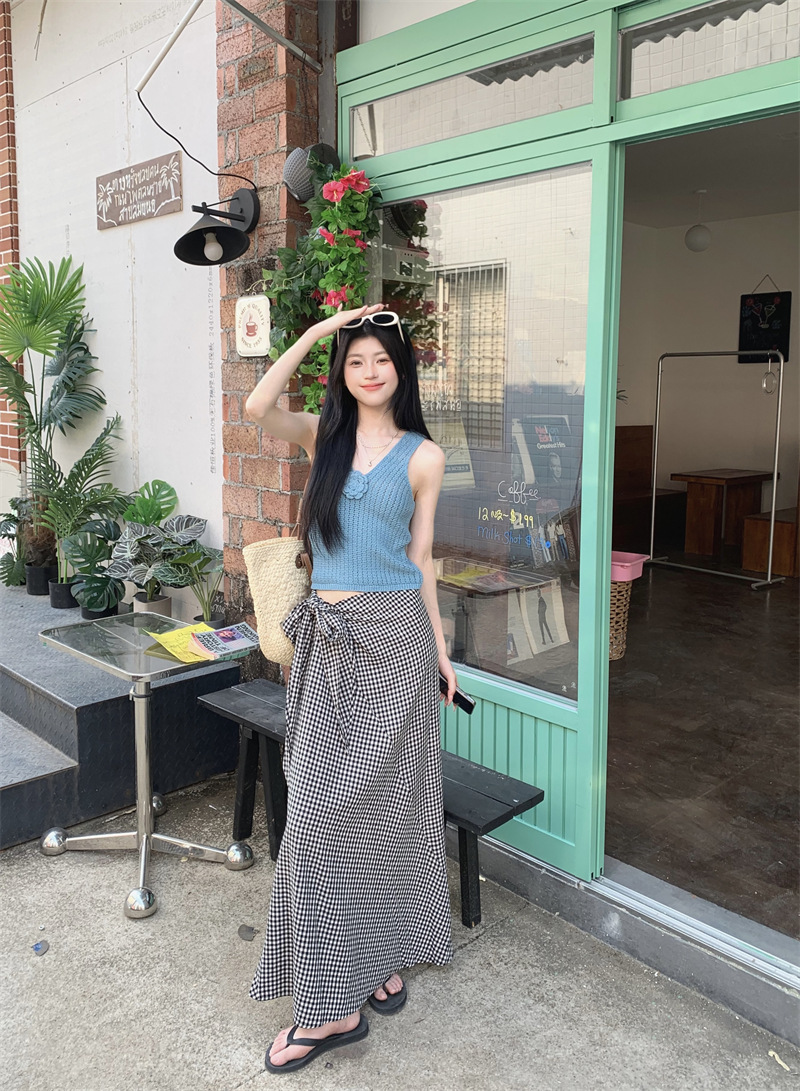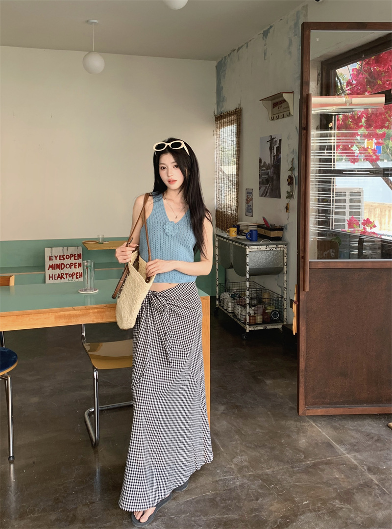 리얼 샷 에이지 감소 올 매치 니트 V 넥 3 차원 플라워 디자인 민소매 스트랩 탑 레이스 업 플레이드 스커트스토어 가기