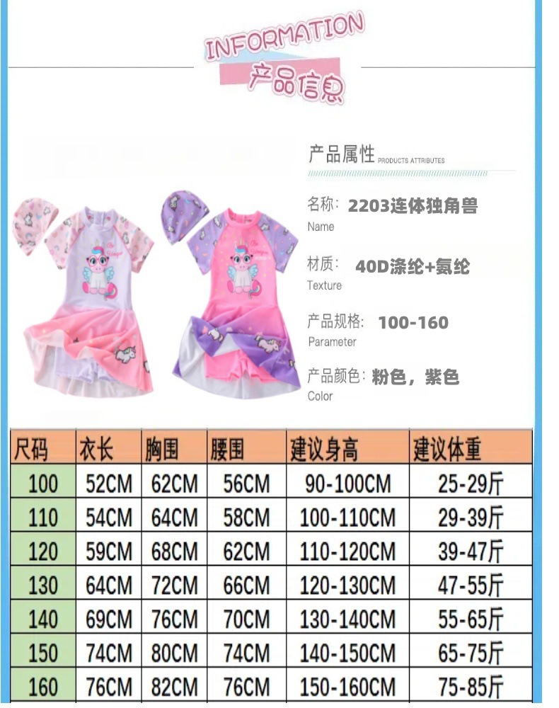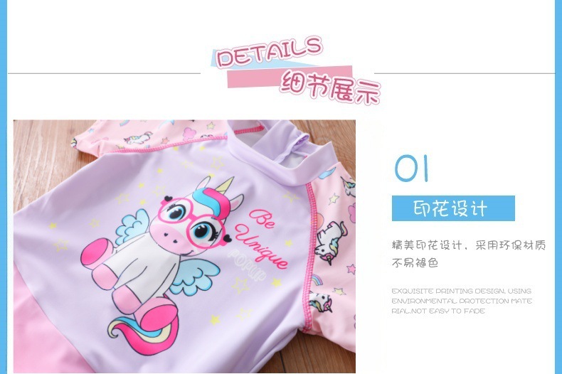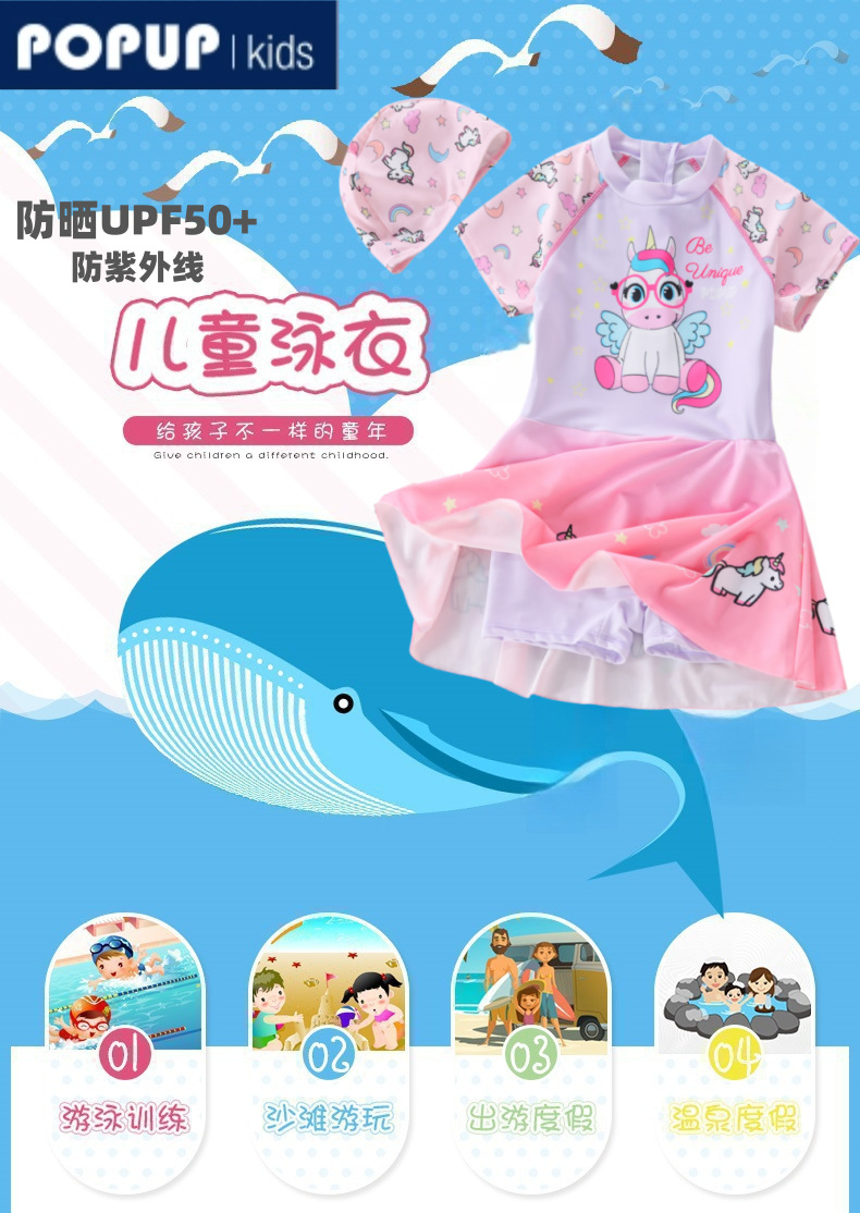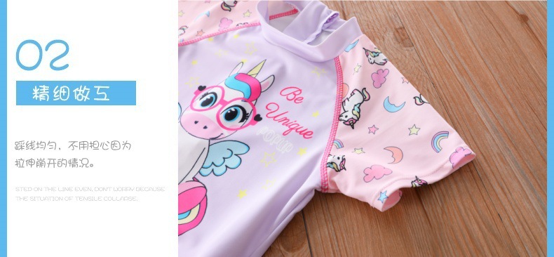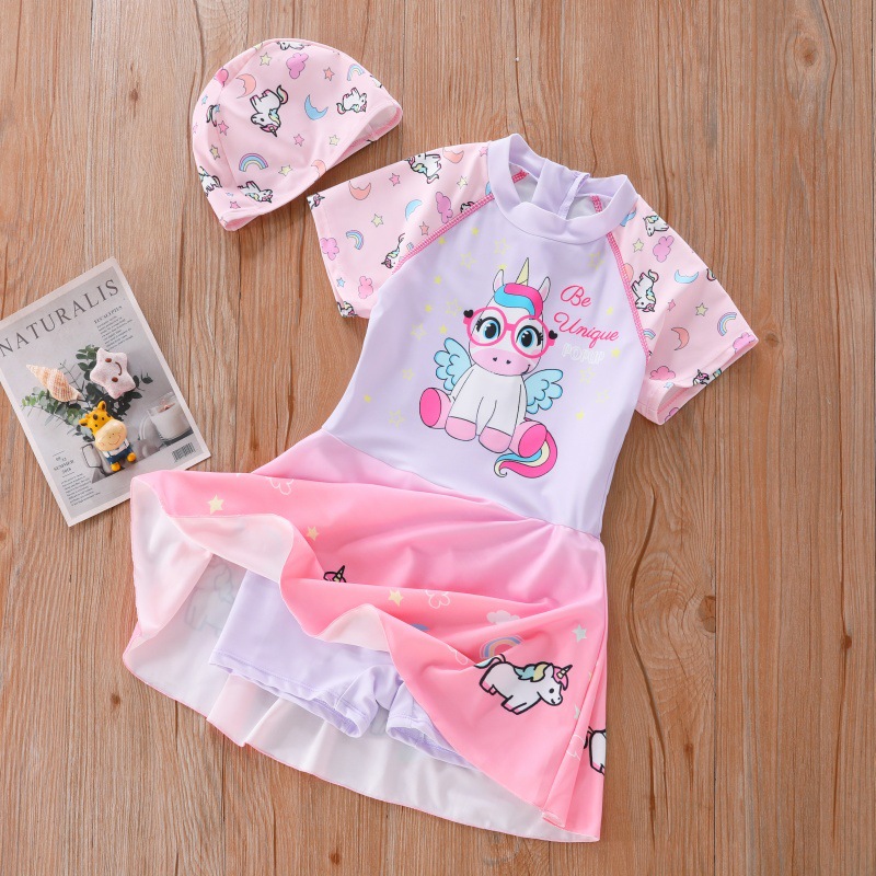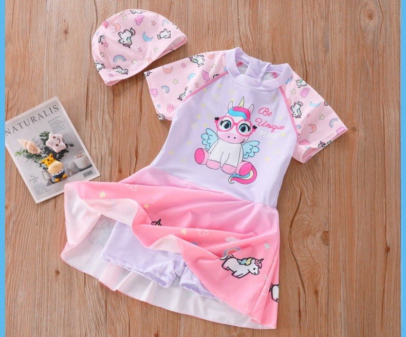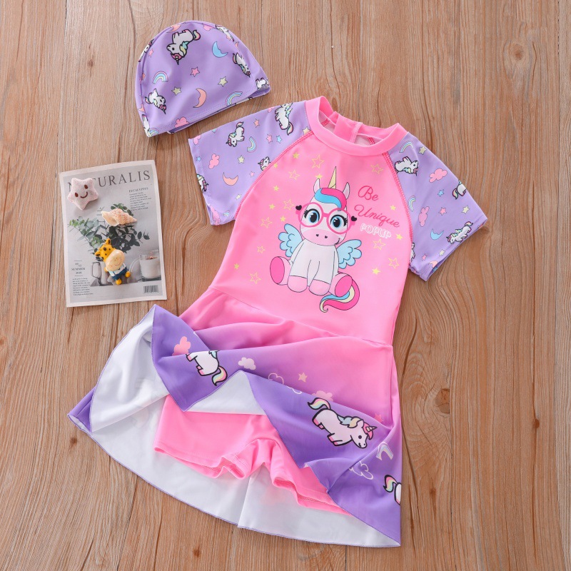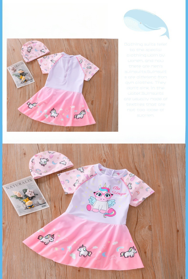 새로운 어린이 수영복 소녀의 원피스 스커트 수영복 반팔 만화 소녀 스포츠 수영복 UPF50