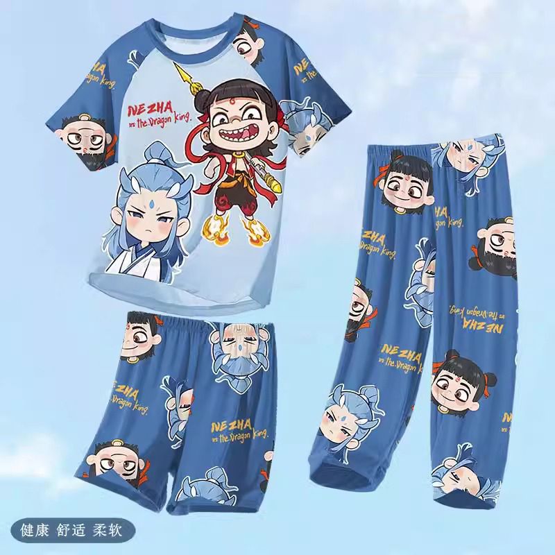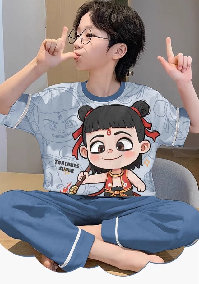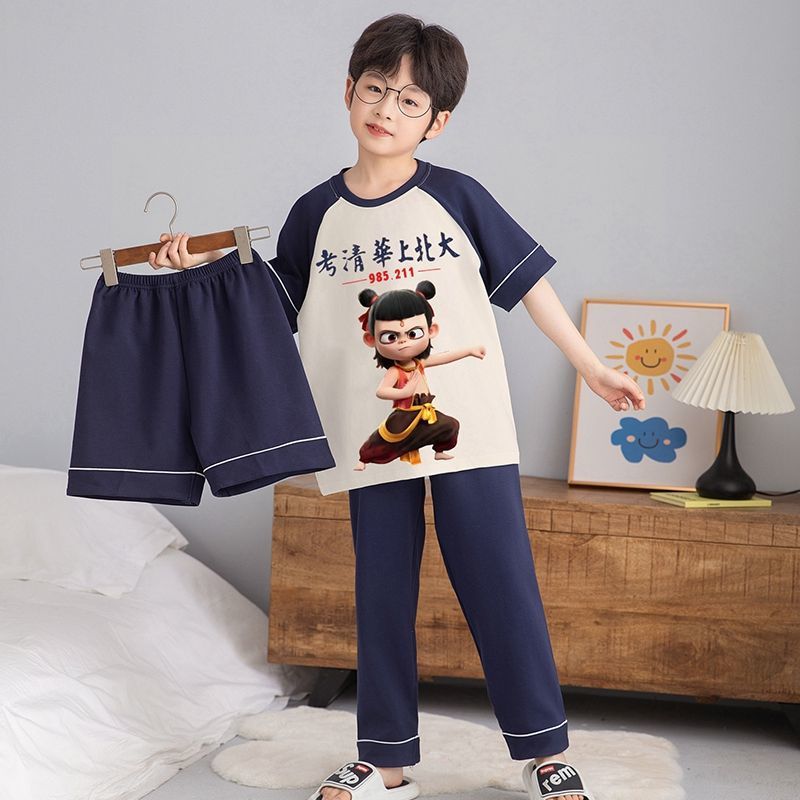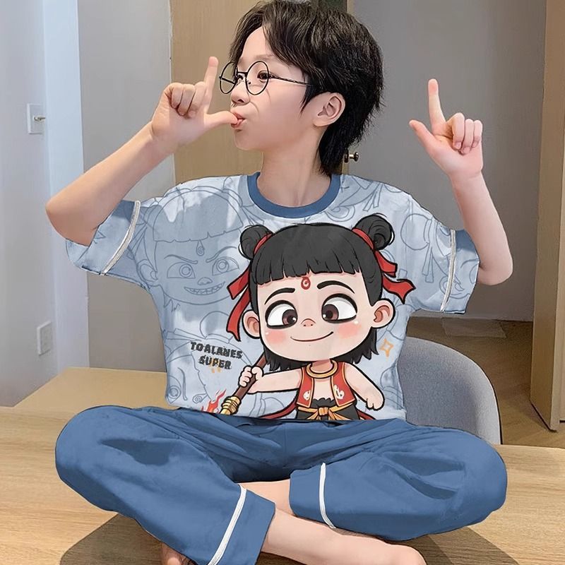 어린이 잠옷 홈 의류 소년 잠옷 여름 세트 잠옷 네자 파자마 만화 크루 넥 짧은 소매 바지 가을