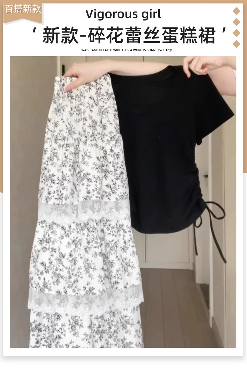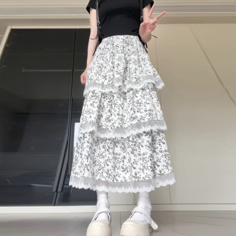 프랑스 스타일 레이스 바느질 꽃 스커트 여성의 여름 높은 허리 슬리밍 스커트 쁘띠 멍청한 케이크 긴 스커트