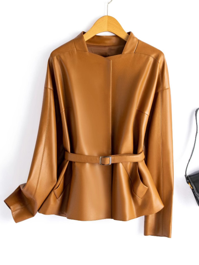 2025 봄 신작 Haining 정품 가죽 자켓 여성 짧은 한국 스타일 레이스 업 레이디 스타일 가죽 자켓 양피 자켓