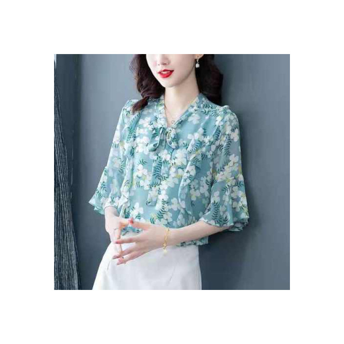 여성을위한 크로스 보더 꽃 무늬 쉬폰 셔츠 2025 여름 새로운 스타일 유행 트럼펫 슬리브 셔츠 여성을위한 슈퍼 요정 탑스토어 가기