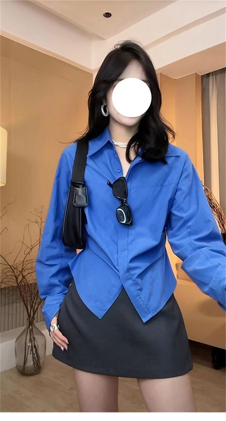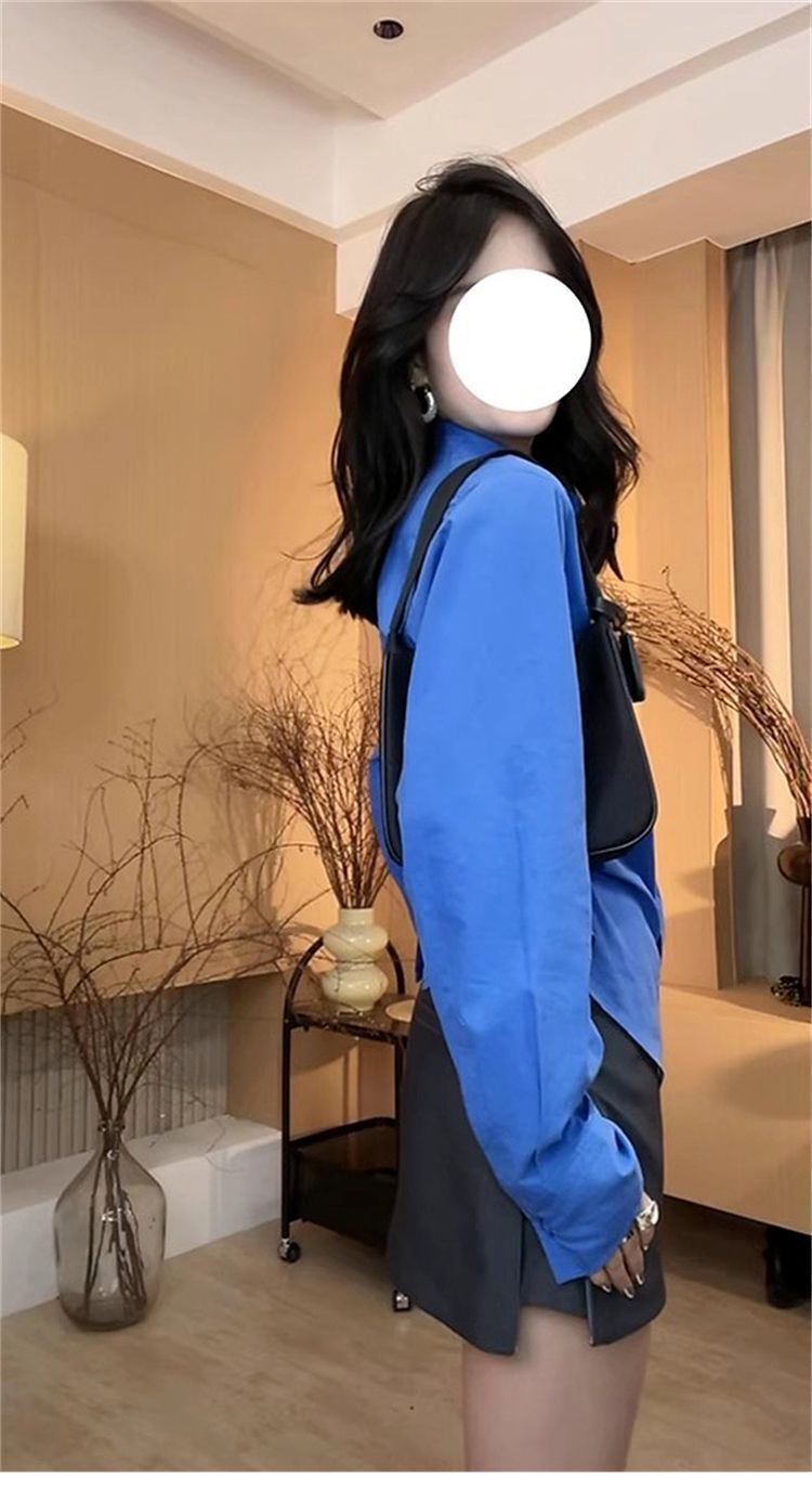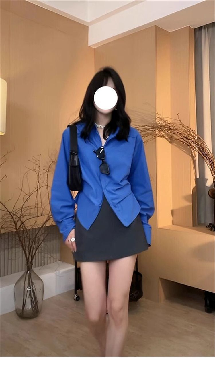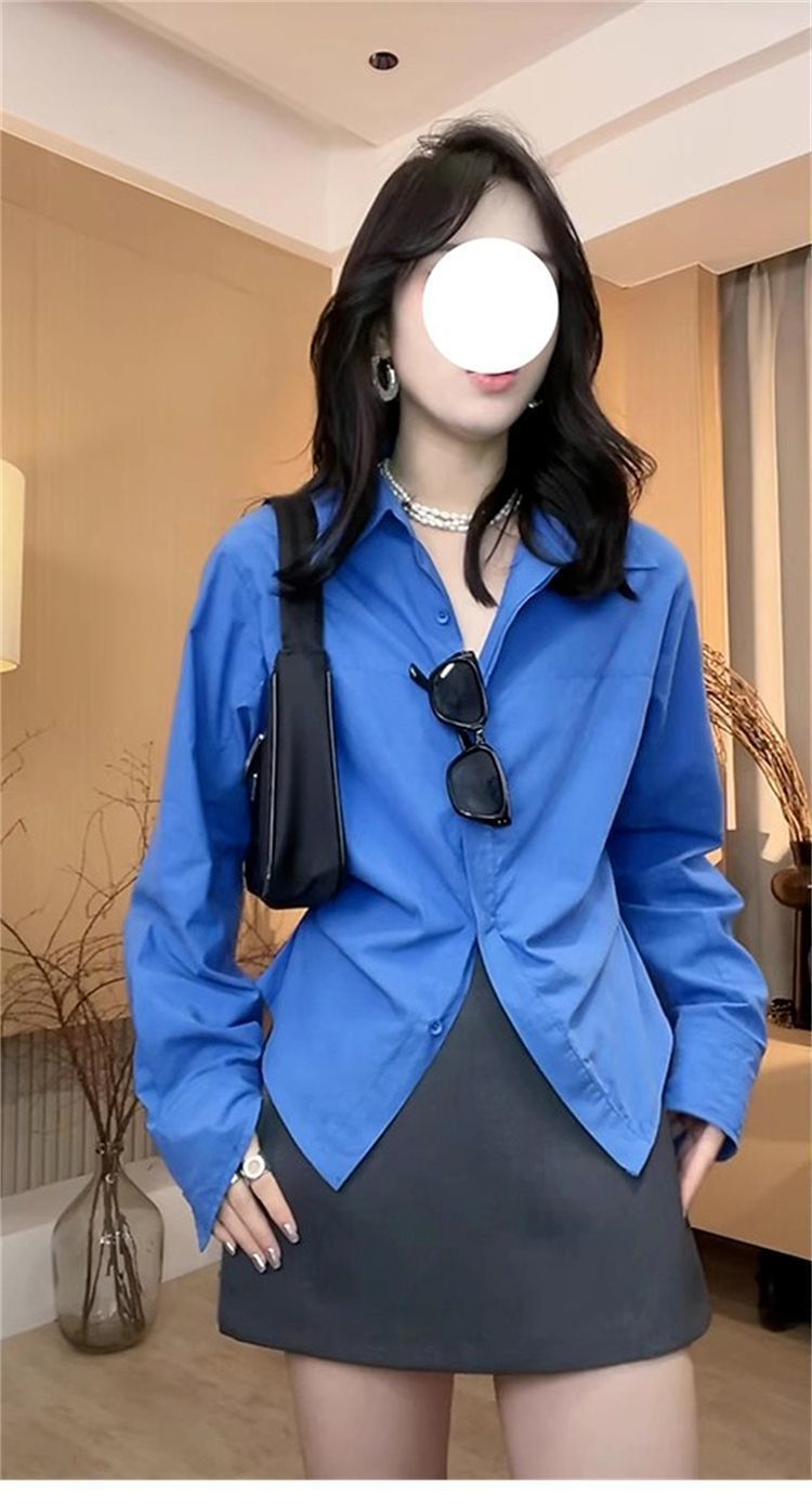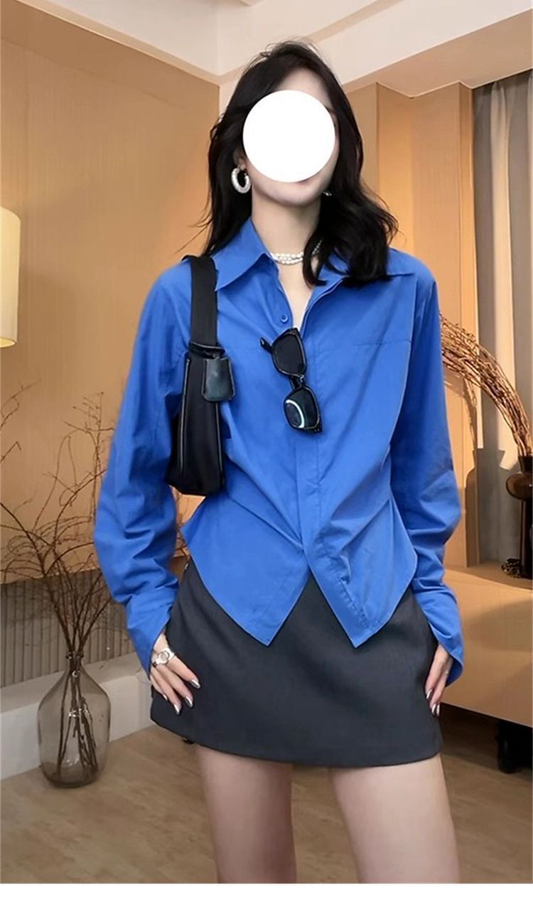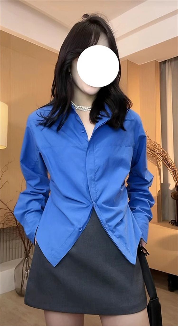 IU 살짝 뚱뚱한 MM 클라인 블루 셔츠 여성 슬림핏 레이어드 디자인 틈새 허리 탑 긴팔 셔츠