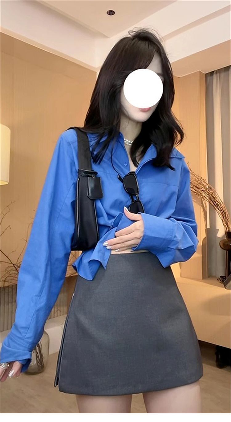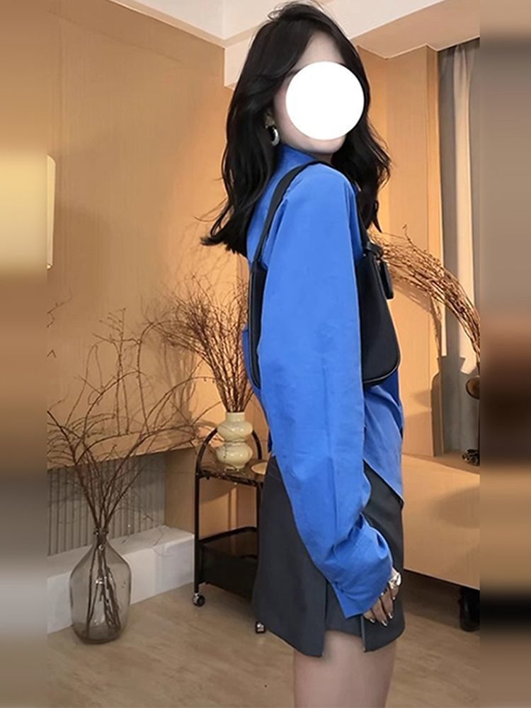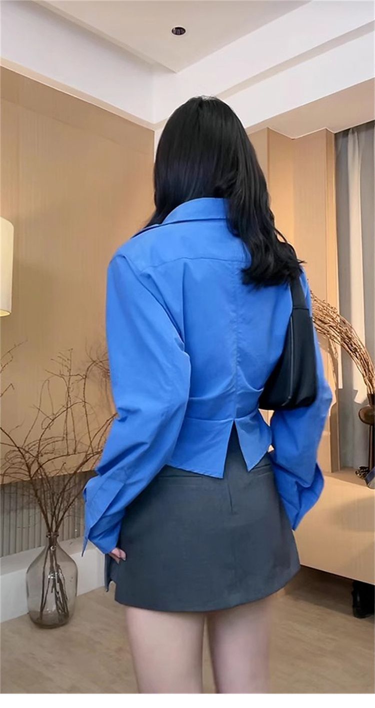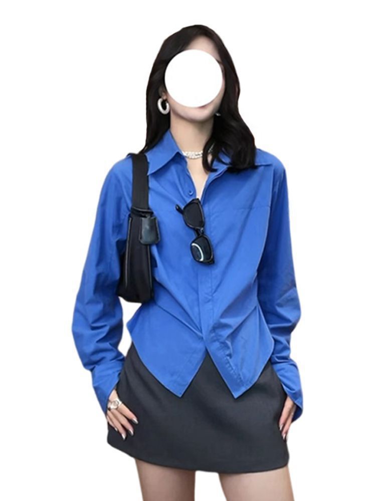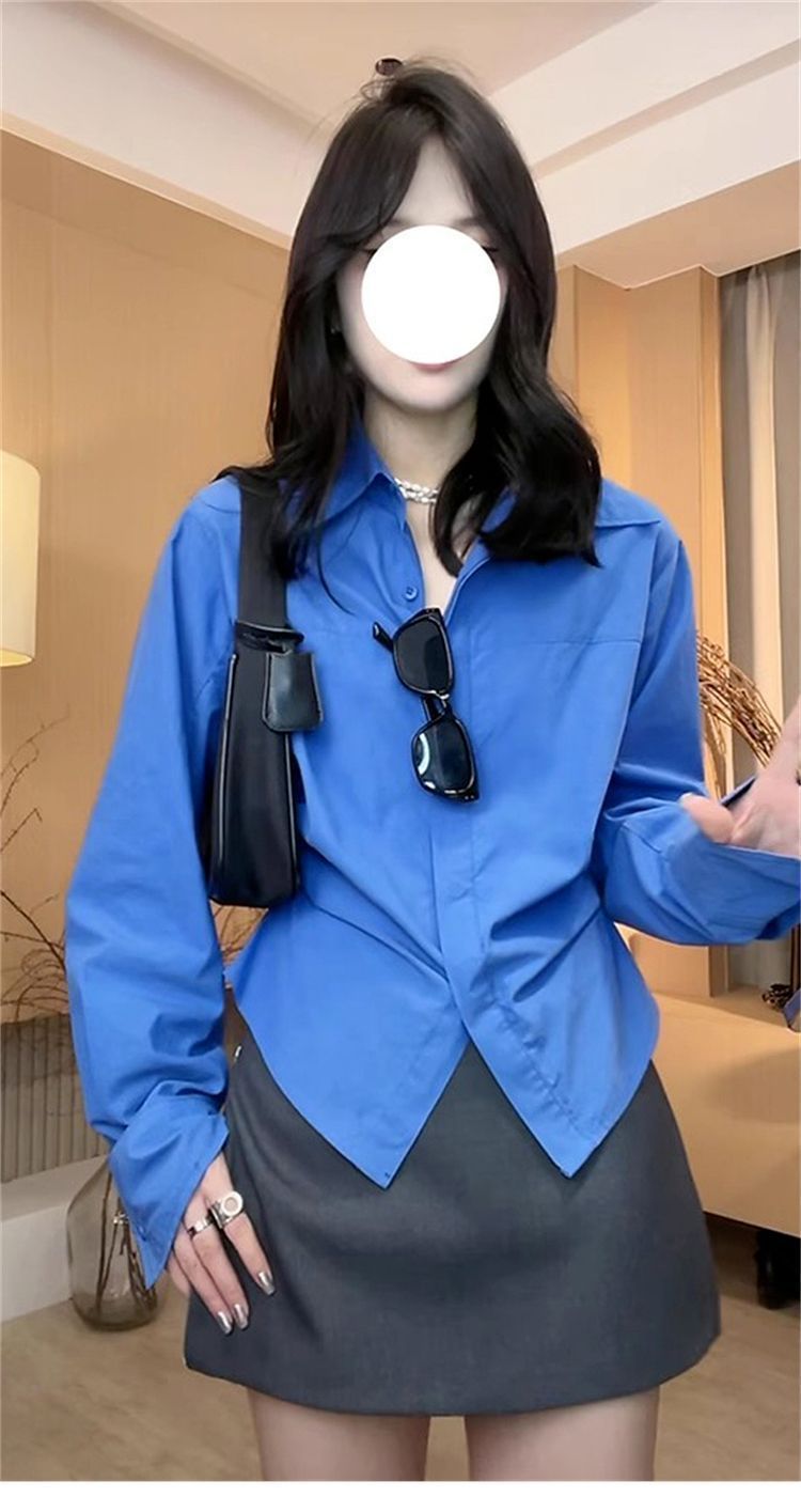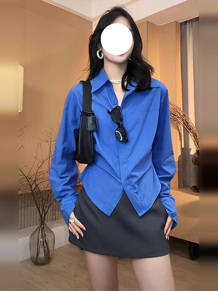 IU 살짝 뚱뚱한 MM 클라인 블루 셔츠 여성 슬림핏 레이어드 디자인 틈새 허리 탑 긴팔 셔츠