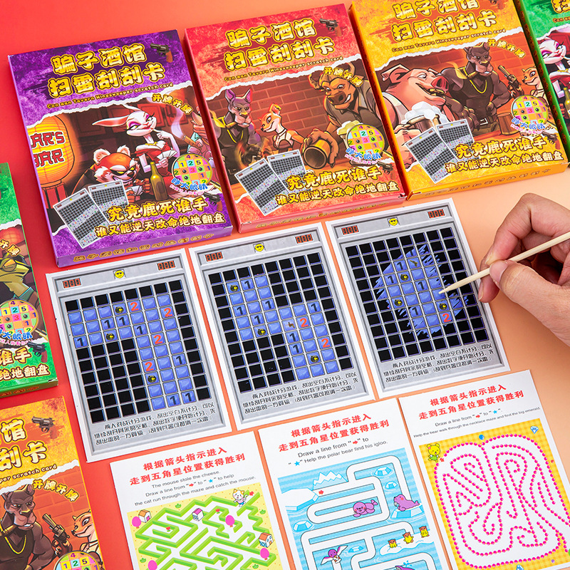内含:每小盒含10张扫雷刮刮卡,正面扫雷,背面为迷宫,猜谜语,便 签,明信片等