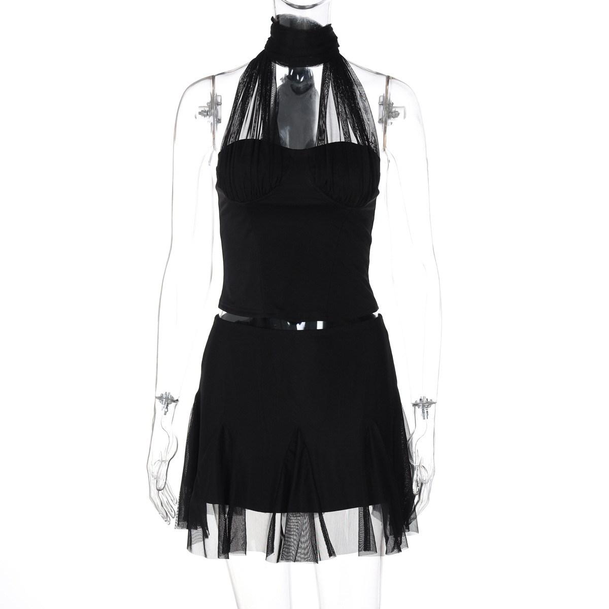 유럽과 미국의 Ins 스타일 여성의 여름 새로운 교수형 넥 레이스 업 작은 조끼 탑 울트라 짧은 스커트 투피스 세트