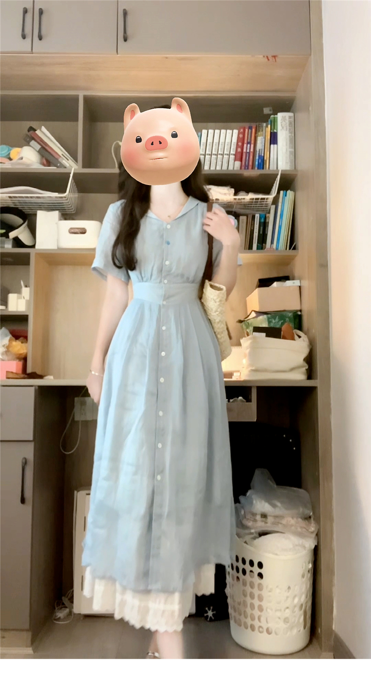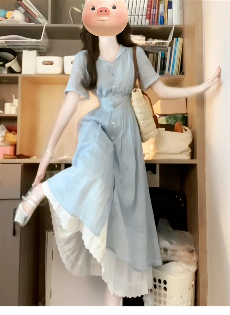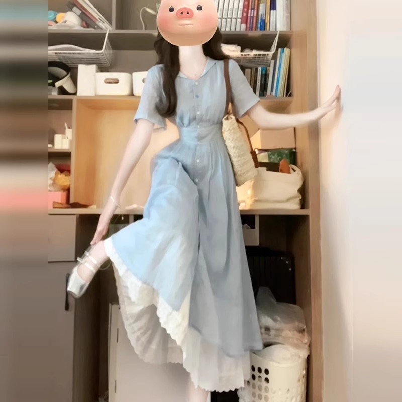 2025 새로운 프랑스 스타일 블루 셔츠 원피스 여름 여성의 우아한 허리 슈퍼 좋은 긴 원피스