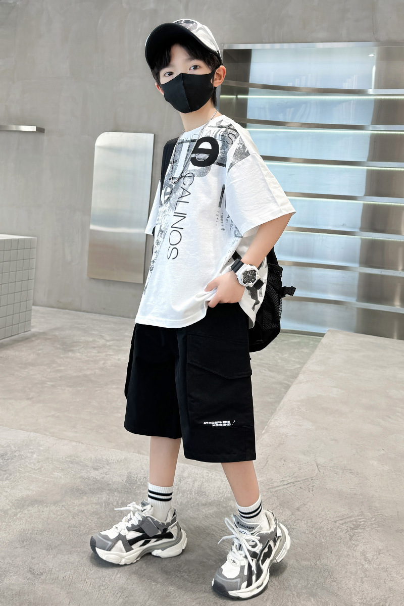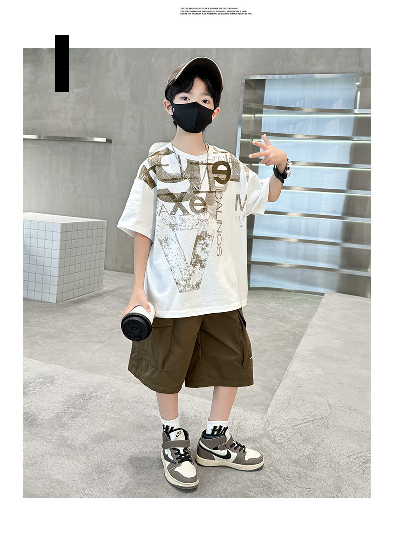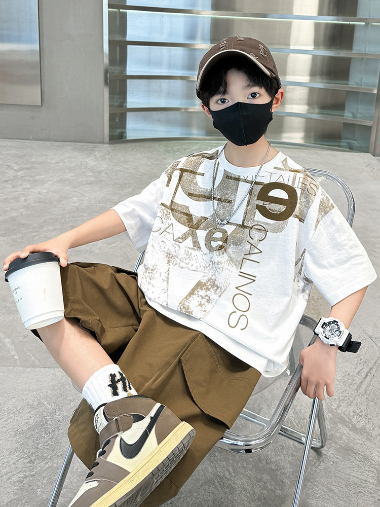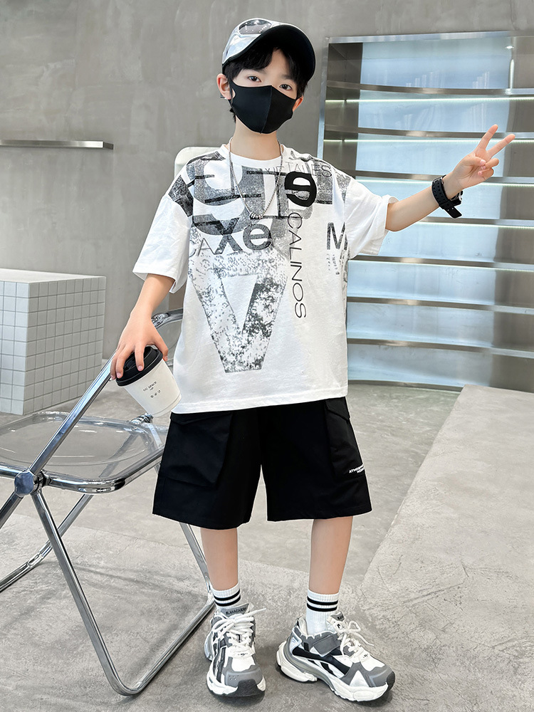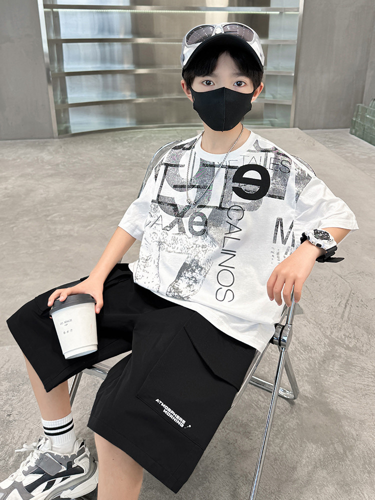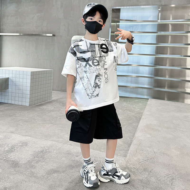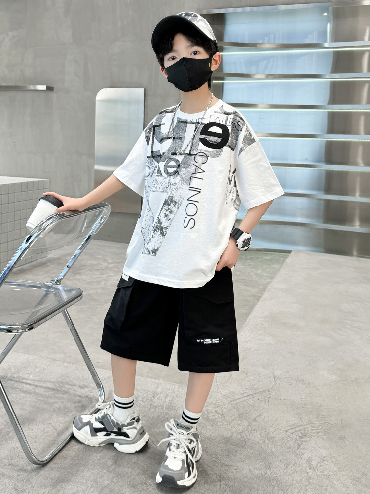 남학생 여름 착용 반팔 편지 2025 세트 소년을위한 새로운 중대형 어린이 여름 바지 투피스 국경 세트