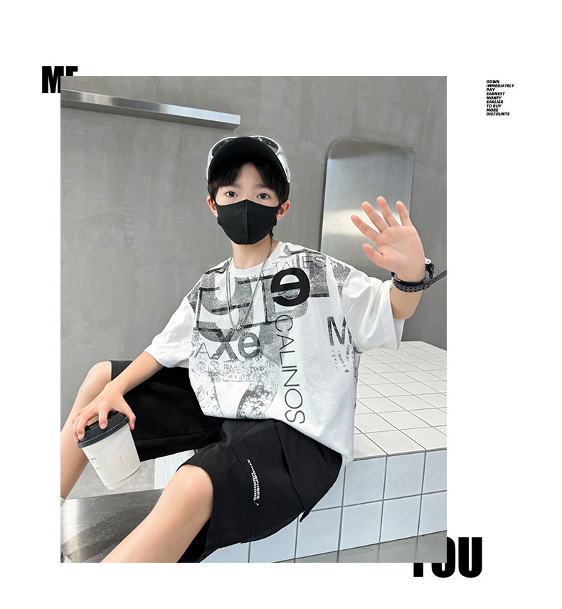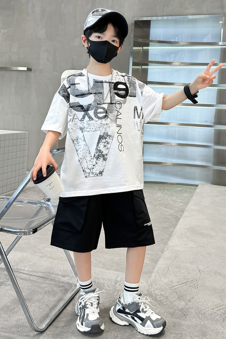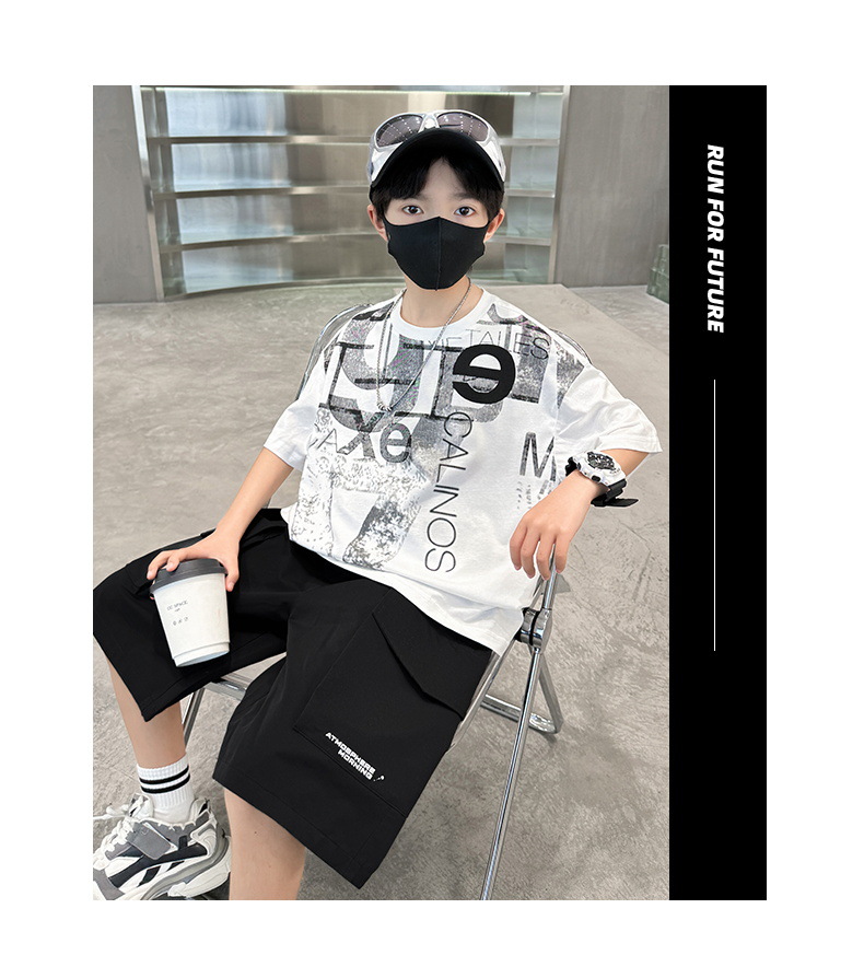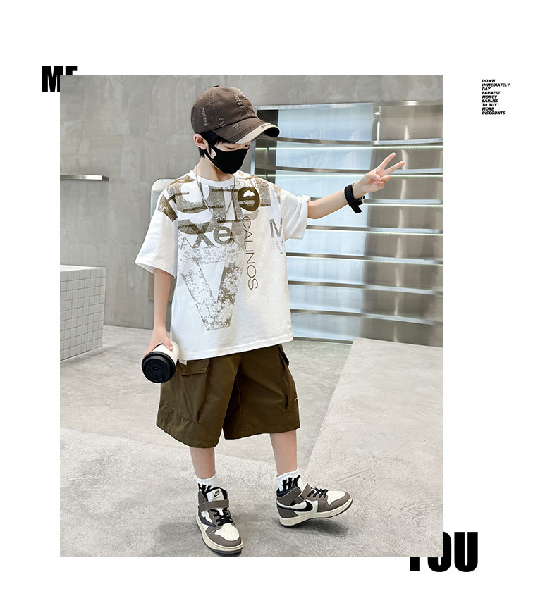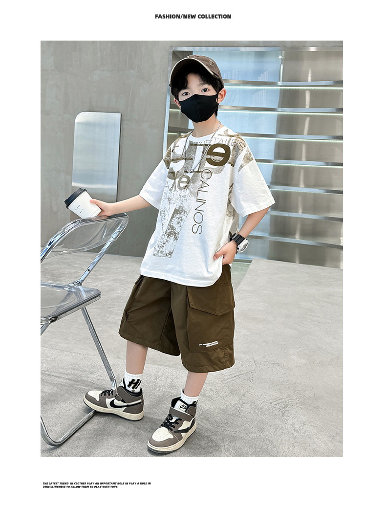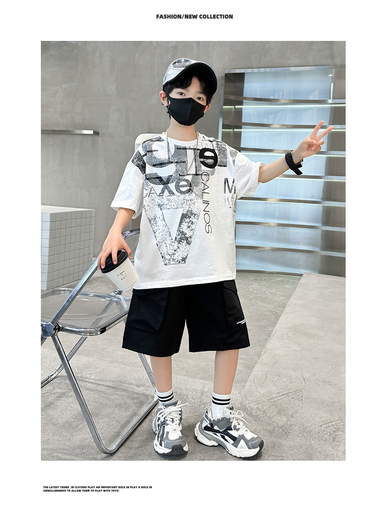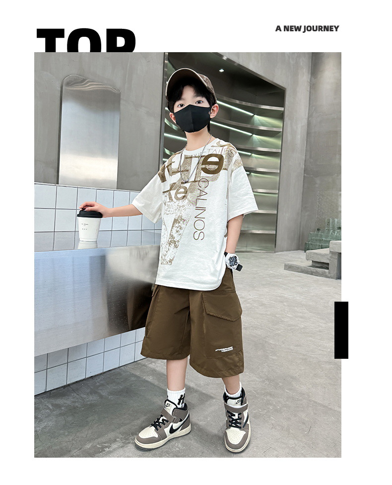 남학생 여름 착용 반팔 편지 2025 세트 소년을위한 새로운 중대형 어린이 여름 바지 투피스 국경 세트