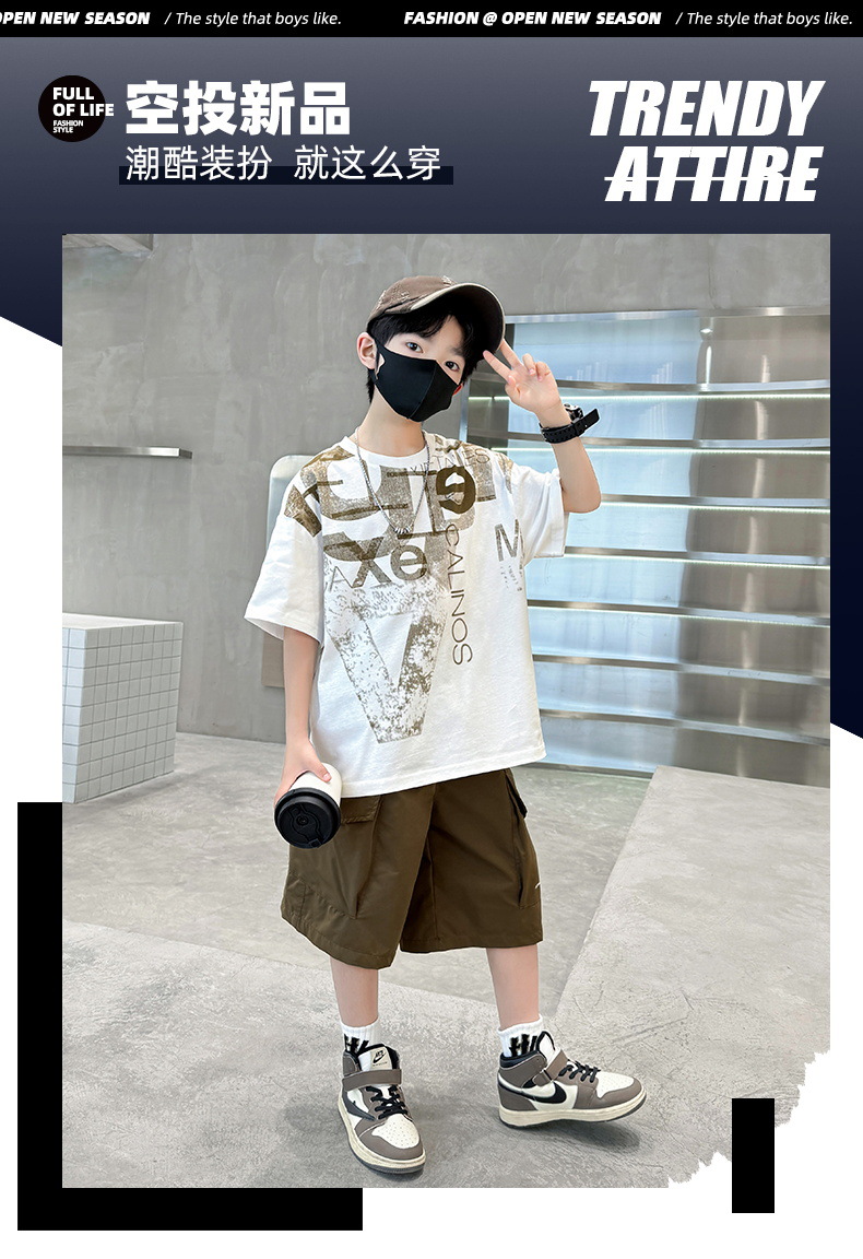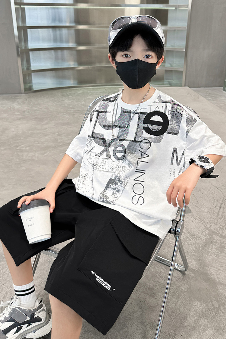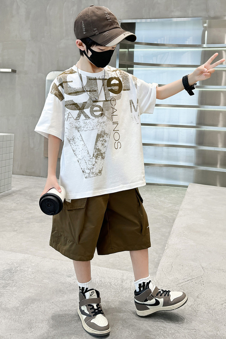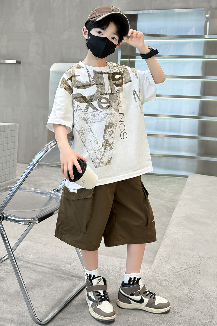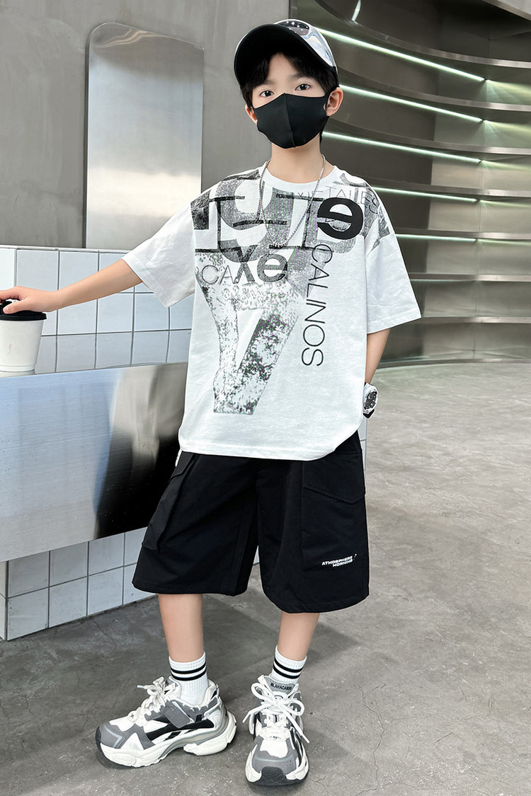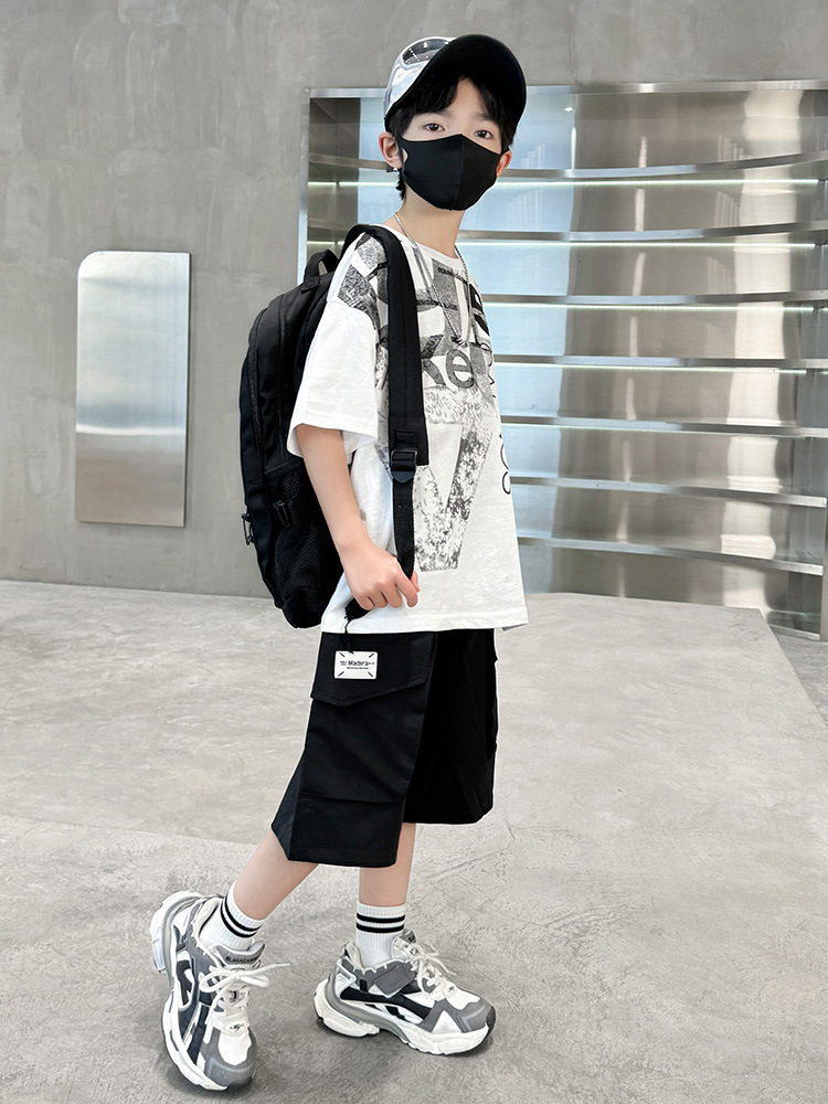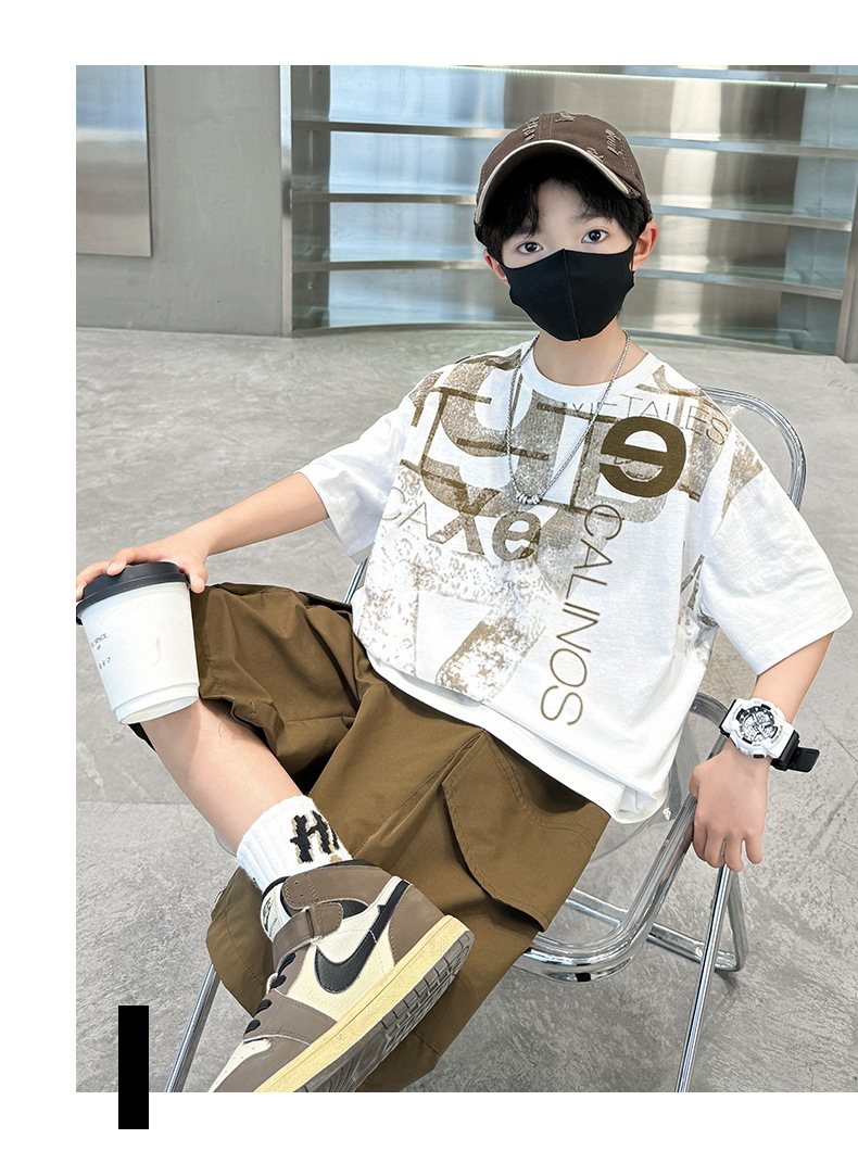 남학생 여름 착용 반팔 편지 2025 세트 소년을위한 새로운 중대형 어린이 여름 바지 투피스 국경 세트